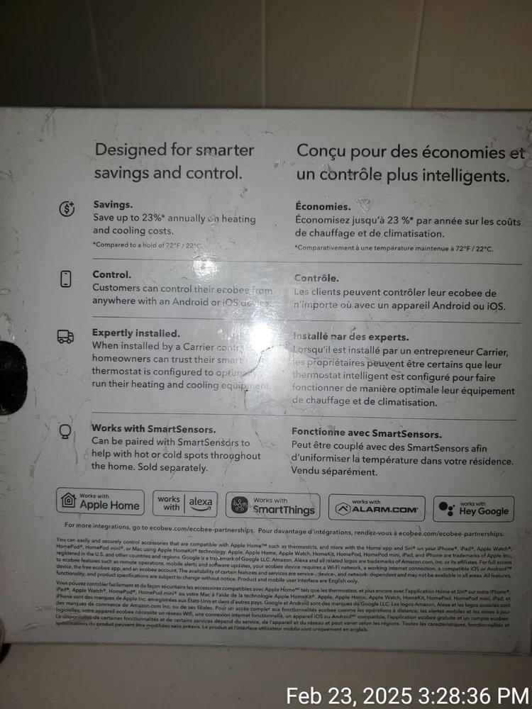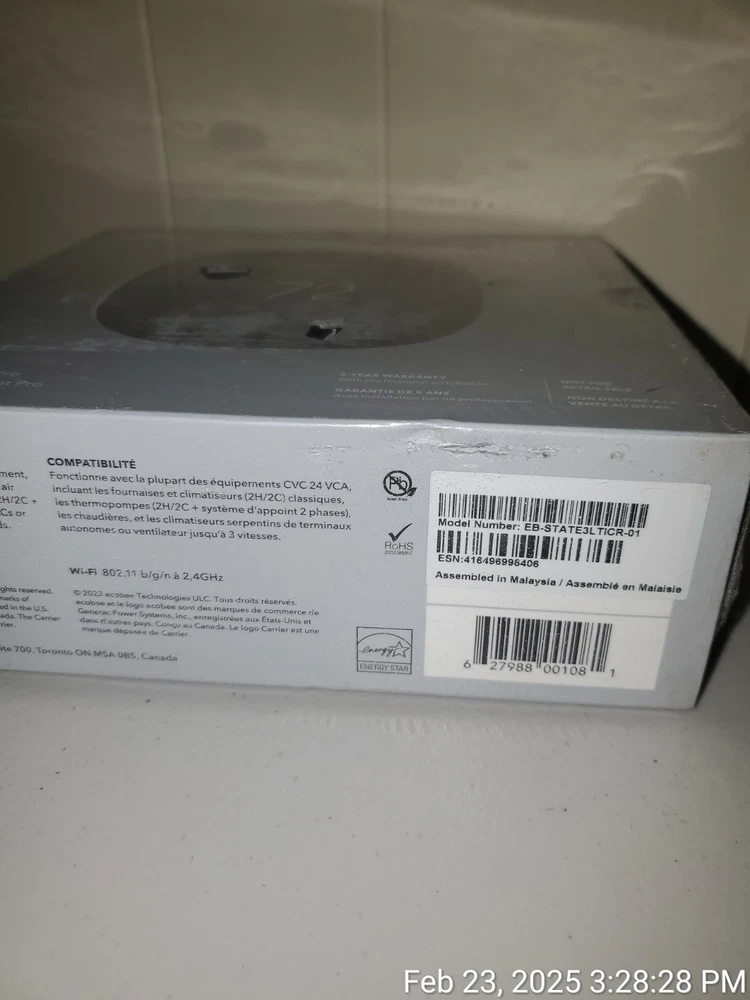 The Carrier Ecobee EB-STATE3LTICR-01 Smart Thermostat in Black is a programmable thermostat with advanced features designed for efficient heating and cooling control. It is powered by a 24V corded electric source and utilizes 5-wire configuration for installation. The thermostat, manufactured in 2020, is compatible with central heating/furnace systems and supports smart home integration with Apple HomeKit, Amazon Alexa, and Samsung SmartThings. It features a 3.5-inch digital display, 3 heat stages, and 1 cool stage, with programmable settings for up to 7 days. Additionally, it offers Wi-Fi connectivity, weather tracking, freeze protection, and can be controlled via a mobile app or touch screen interface.