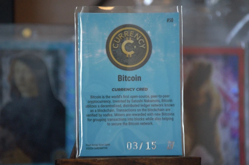 Cardsmiths Currency Series 4 #50 Bitcoin Aqua. A coveted piece for enthusiasts and investors alike. With its unique aqua hue, this card stands out as a visually striking representation of the iconic cryptocurrency. Limited to just 25 copies, this rare find is numbered 03/25, making it a highly sought-after addition to any collection. Its distinct design and limited availability make it an intriguing piece for collectors and fans of the blockchain phenomenon.