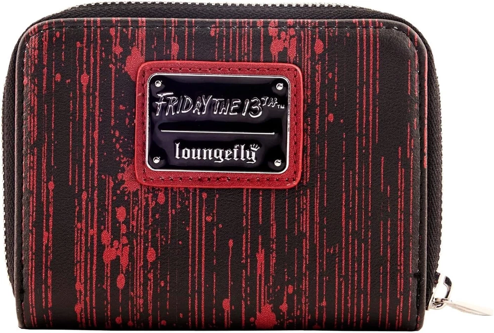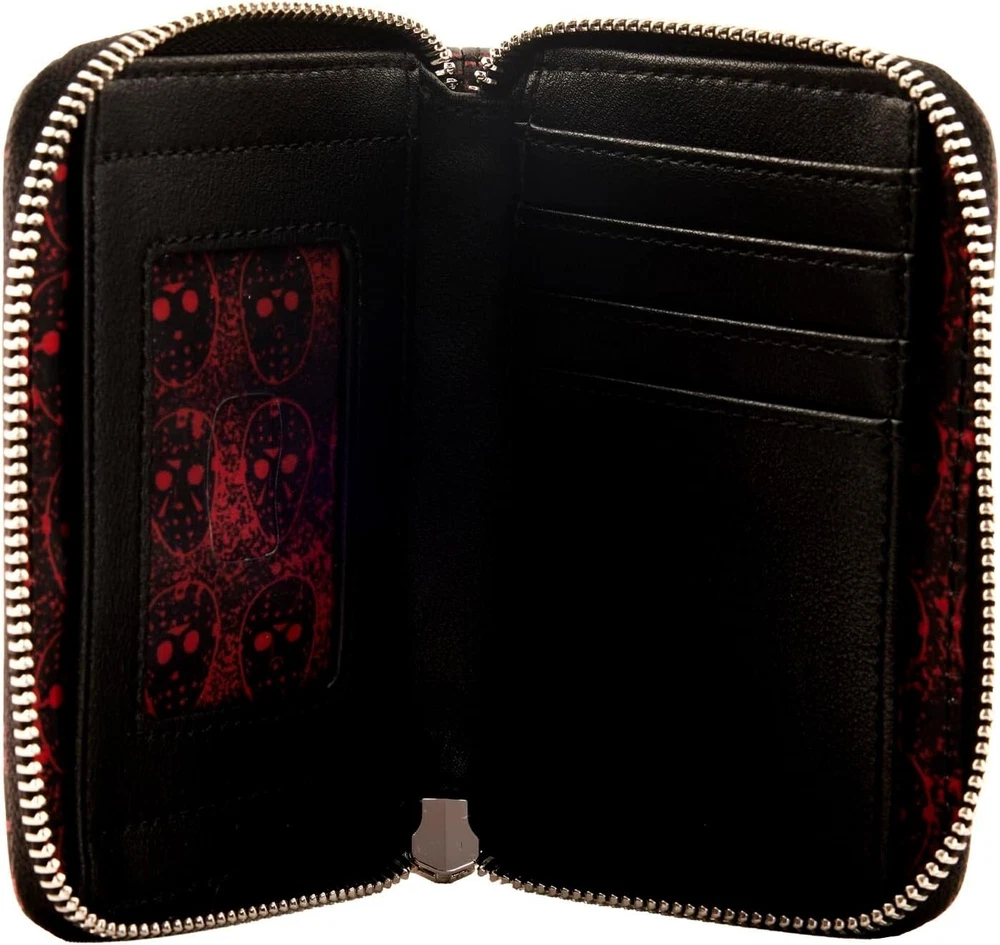 From the horror movie Friday the 13th, this wallet features Jason's Mask! Featuring incredible detail to bring Jason's Mask to life, this Loungefly wallet is made of vegan leather (polyurethane), zips closed with sturdy metal hardware, and has credit card slots as well as a clear slot for holding your ID. Note the unique, coordinating inside lining! Bring home a piece of Friday the 13th today! Pick up the glow in the dark Loungefly bag to go along with this in our other listing! Check out our other listings for combined shipping and thanks for looking! **Veteran Preference Female Owned Business**