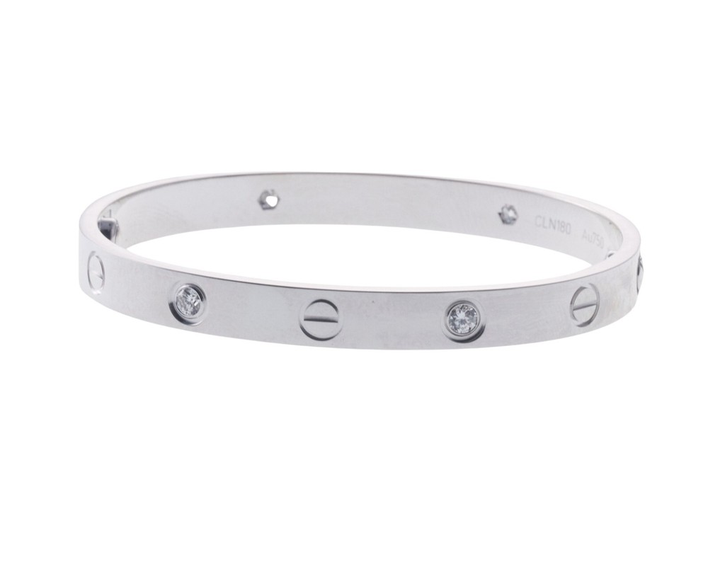 Cartier Love White Gold Diamond Bracelet Size 16 Comes with screw driver, COA and service paper. Retail $12700. MATERIAL 18k White Gold GEMSTONE Diamonds 0.42ctw CLARITY VS COLOR G DIMENSIONS Bracelet is Cartier size 16. MARKED or TESTED Cartier, 750, JCLN***. WEIGHT 30.9 grams StockOOYY8423 ALL ITEMS ARE GUARANTEED AUTHENTIC. ITEMS WILL ONLY BE SHIPPED TO THE ADDRESS SPECIFIED ON THE EBAY ORDER. PAYMENTS MUST BE RECEIVED WITHIN 4 DAYS FROM THE END OF AUCTION. PLEASE ASK QUESTIONS PRIOR TO COMMITTING TO PURCHASE. IF SPECIAL ARRANGEMENTS MUST BE MADE, PLEASE MESSAGE US! WE WILL TRY TO ACCOMMODATE YOU TO THE BEST OF OUR ABILITY.