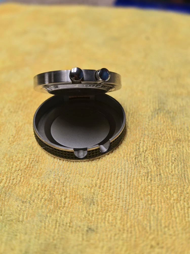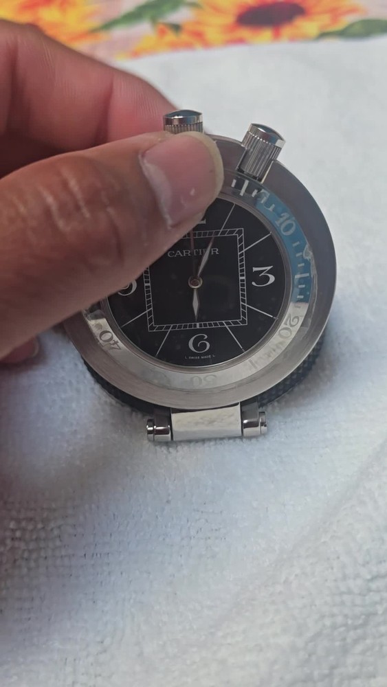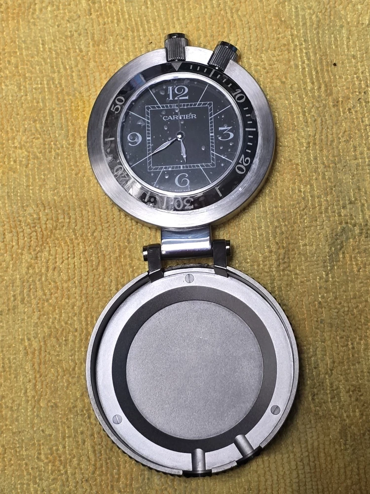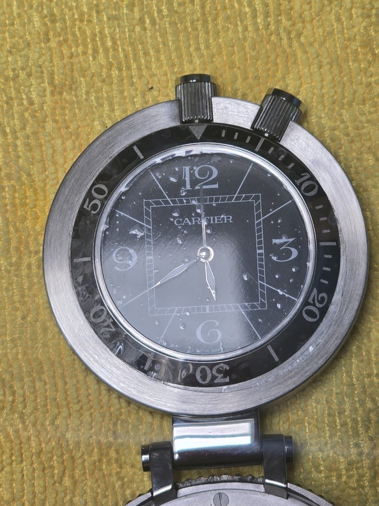 The Cartier Pasha Timer Travel Clock Pocket Clock is a vintage-inspired piece with a sleek stainless steel construction in a silver color. This battery-powered quartz clock features an analog display and alarm function, making it both functional and stylish. As an original Cartier model, this clock exudes luxury and sophistication, perfect for collectors or those looking to add a touch of elegance to their décor. The 21st-century design adds a modern twist to this classic timepiece, making it a unique and eye-catching addition to any collection.