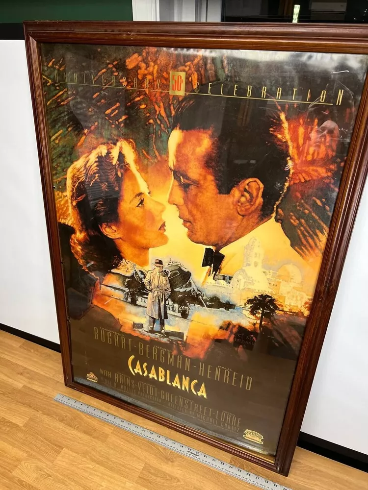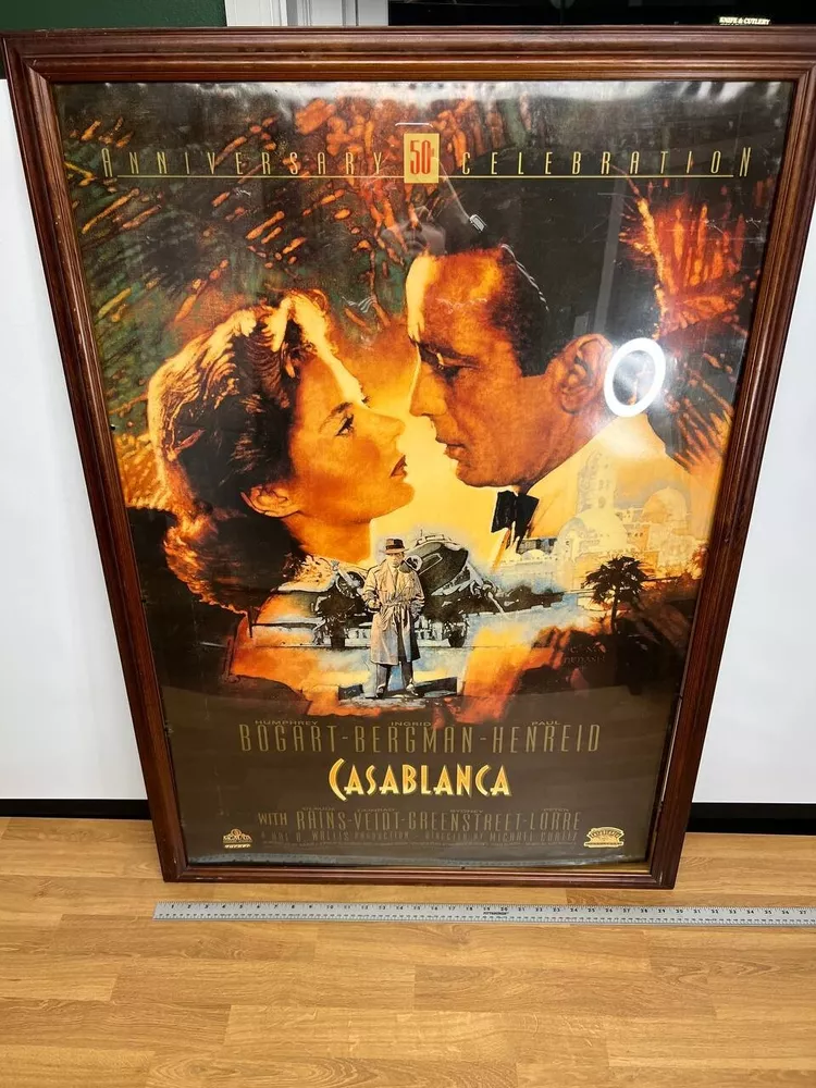 Feel Free to make an offer on any of my items! Vintage Casablanca 50th Anniversary Poster – Featuring iconic artwork of Humphrey Bogart and Ingrid Bergman . A must-have for classic movie collectors and fans of this timeless 1942 film. Measures 27x40 . Great condition, perfect for display! ONE SIDE Good condition The poster is sold without the frame; only the poster itself is included. If you wish to purchase it along with the frame, please feel free to contact us