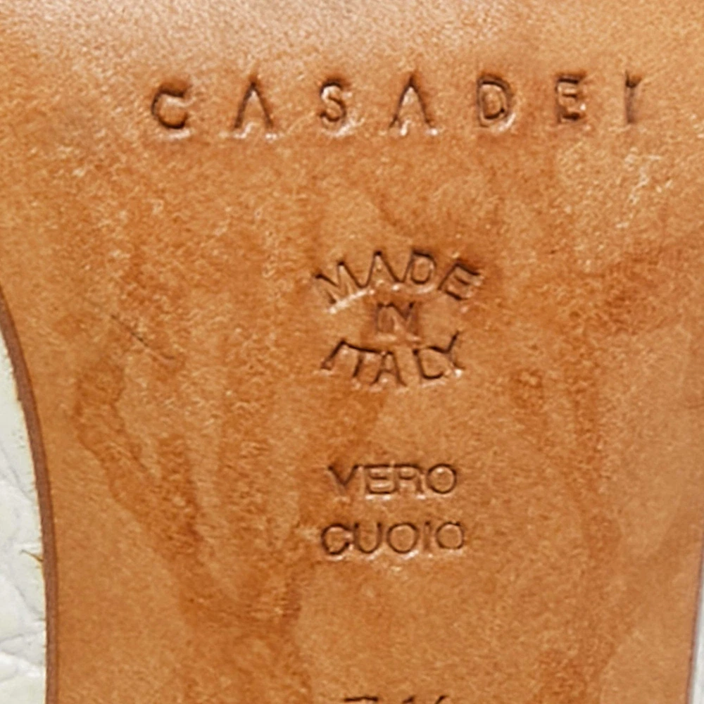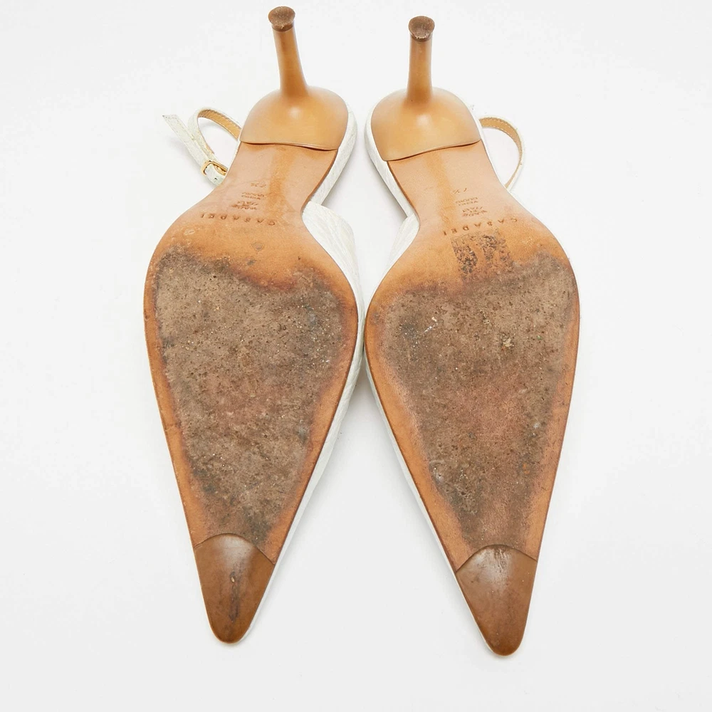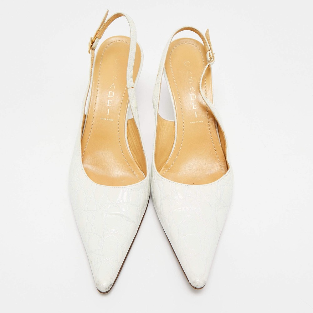 Our eBay Store About Us Contact Us Add to Favorite Sellers Casadei White Leather Pointed Toe Slingback Pumps Size 375 This pair of Casadei pumps is minimally designed in an attractive white shade. Crafted from leather, it is set atop 8cm heels and is complete with a slingback closure. Product Details Brand Casadei Color White Includes Original Dustbag Outsole Length 25 cm Outsole Width 8 cm Size US 7.5 (EU 37.5/UK 4.5) Certified by The Luxury Closet This item has gone through a detailed authentication process overseen by our experts. We offer a lifetime guarantee of authenticity on all our items. How We Check The in-house team of experts at The Luxury Closet is highly trained to verify the authenticity and the condition of the luxury products. They ensure that only 100% authentic items are put on sale.The evaluation process is unique with its own mix of assessment criteria and differs according to the category. Each item is evaluated based on the following combination of hallmarks, hardware, stitching, symmetry, material, craftsmanship, stamping, codes, hologram stickers, and packaging. Our authenticators also check if the items have been modified or amended (e.g., aftermarket diamonds, replaced batteries, repaired bags, etc.) International Buyers Import duties, taxes and charges are not included in the item price. These charges are the buyers responsibility. Please check with your country’s customs office to determine what these additional cost will be prior to buying.