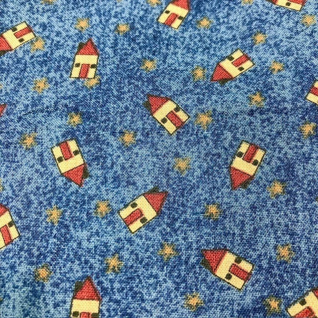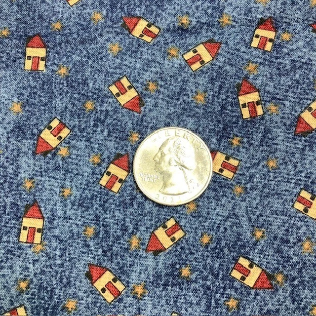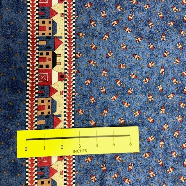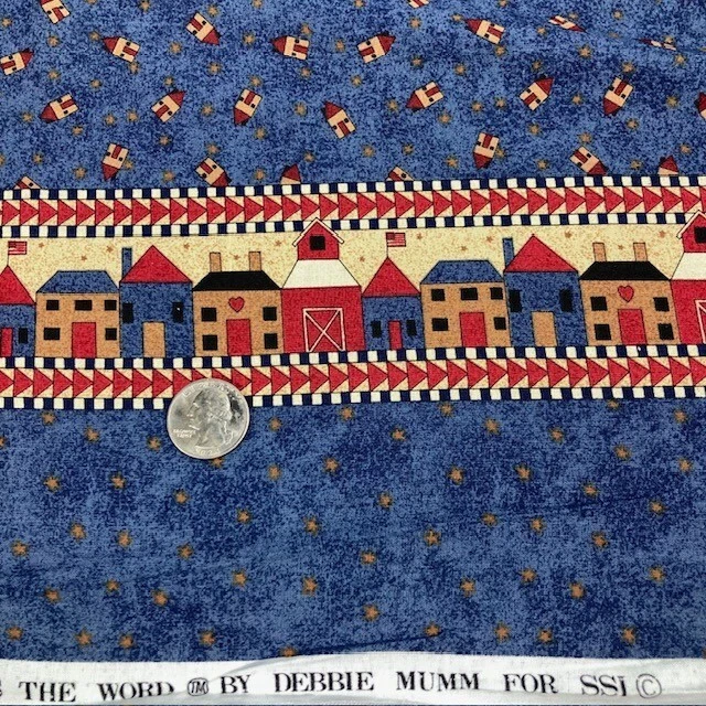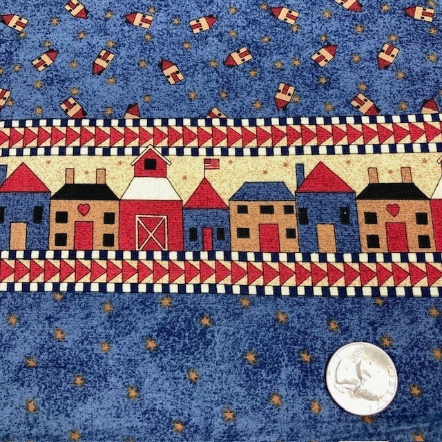 Small scale houses and stars printed on a blue background. Vertical border strip is approximately 2" wide and is on one side of the fabric only. Debbie Mumm for South Sea Imports. 100% cotton fabric. Please note: no subcuts and no returns for fabric items.