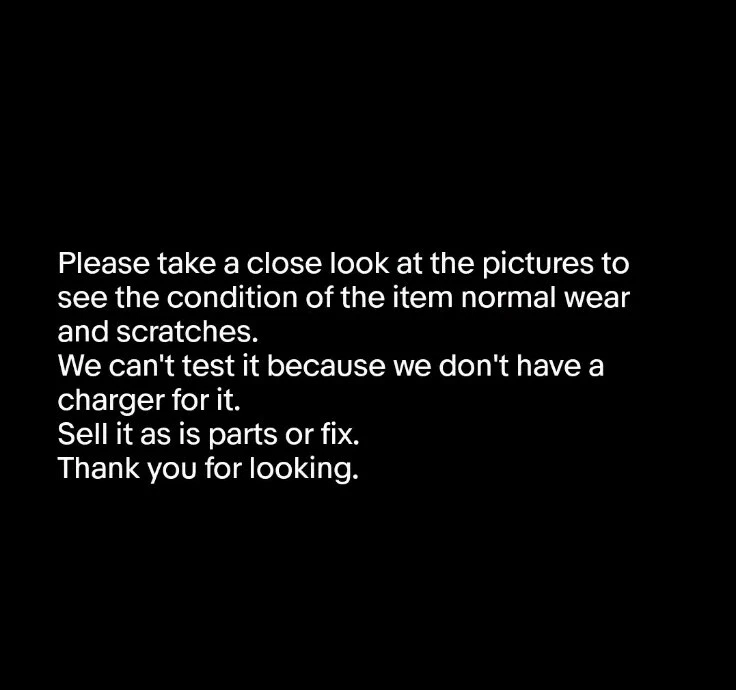 Please take a close look at the pictures to see the condition of the item normal wear and scratches. We can't test it because we don't have a charger for it. Sell it as is parts or fix. Thank you for looking.