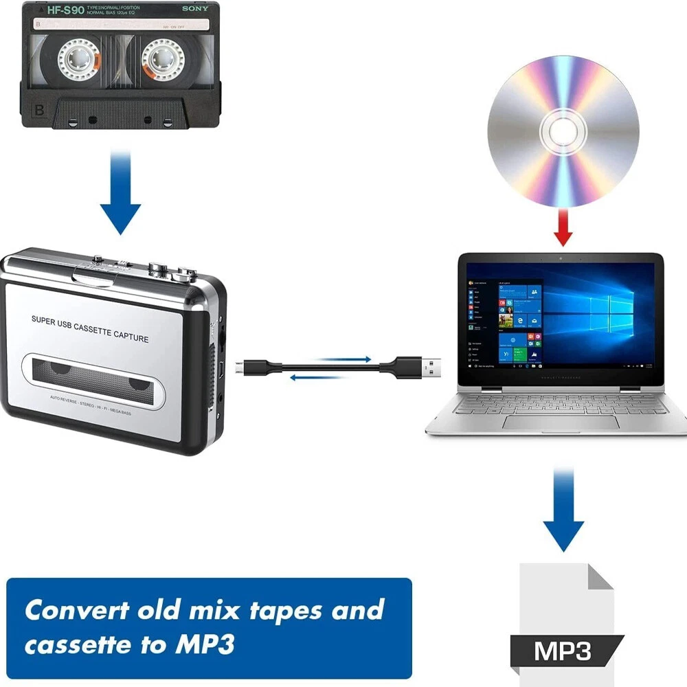 Product Features: Brand new and high quality guaranteed! Converts tape to MP3, quickly converts old cassettes to MP3 format via a USB cable. Can be used as . Better than just a recorder, it works perfectly as an old school, vintage with any standard headphones. Works perfectly with any standard 3.5mm AUX jack, you can use headphones, earbuds, or an audio port to your car speakers. Clear sound quality. By transferring your cassettes to MP3s in a quiet room, you can enjoy crystal Clear sound quality with even the oldest bands. Portable design fits in virtually any bag and enables you to play and transfer anywhere. Plug and Play USB device, no drivers required. Powered Operation: Battery or USB. Comes with tape converter software to guide you through transfer. Easy to use. How To Use Connect audio capture USB connector into your computers USB2.0 port and activate the software. Put a cassette into the cassette player. Push the Start button to transfer the tape. Click the Record button of the Software to record and click the Stop button when finished. Save as MP3 in PC. Buttons: Eject: slide to open the cassette holder. Volume: adjust the volume of headphones and USB connection. Headphones: connect headphone here. USB Connection: connect USB cable. Play: press to play tape. Stop: press to stop tape. FF/REW: press to fast forward or rewind tape. DIR: selects the direction of tape playback. Play Mode: selects what the tape does when it reaches the end of a side. Product Specification: Type:USB Cassette Capture Function:convert tapes and cassettes to MP3 Compatible PC OS:all except for Mac 10.5 or higher Consumed Power:≤1.5W Dimension:4.5*3.2*1.2in(110*80*30mm) Weight:5.18oz(148g) USB Cable Lenght:31.49in (800mm) Audio Cable Length:41.34in (1050mm) Package included: 1 x USB Cassette Capture 1 x Headphones 1 x USB cable 1 x Software CD 1 x User Manual