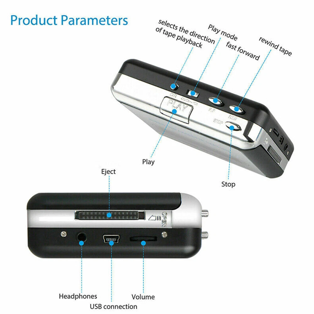 Connectivity: USB 2.0 Tracking Number Provided: Yes Warranty: Yes Playable Media Format: MP3 Manufacturer Part Number: Does not apply Model: Cassette Players UPC: 982766874050 Product Line: Walkman Type: USB Cassette Capture Audio Cable Length: 41.34in (1050mm) Dimension: 4.5*3.2*1.2in(110*80*30mm) Color: Black,Silver MPN: Does Not Apply USB cable Length: 31.49in (800mm) gtin13: 982766874050 Features: Auto Reverse Playback, Cassette Converter, Cassette Playback, Headphones, Noise Reduction, USB Brand: Unbranded Audio Outputs: Headphone Jack Function: Convert Tapes and Cassettes to MP3 Band: Clear Sound Quality with Even the Oldest Bands