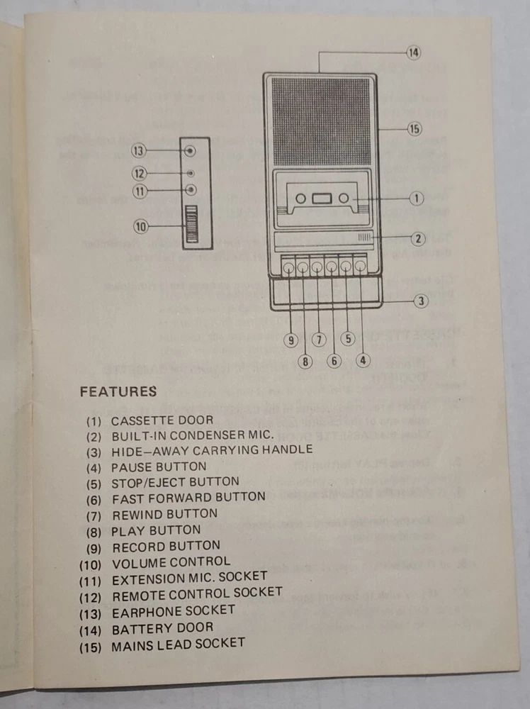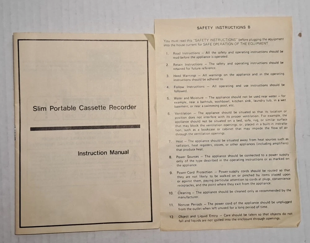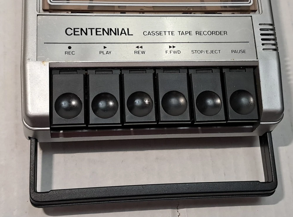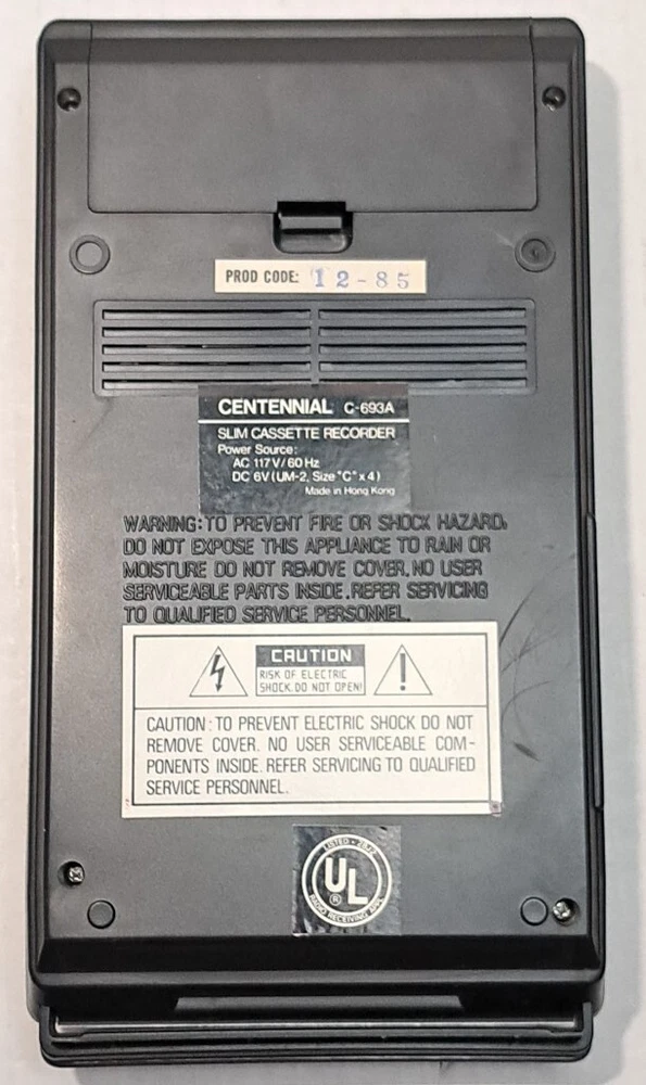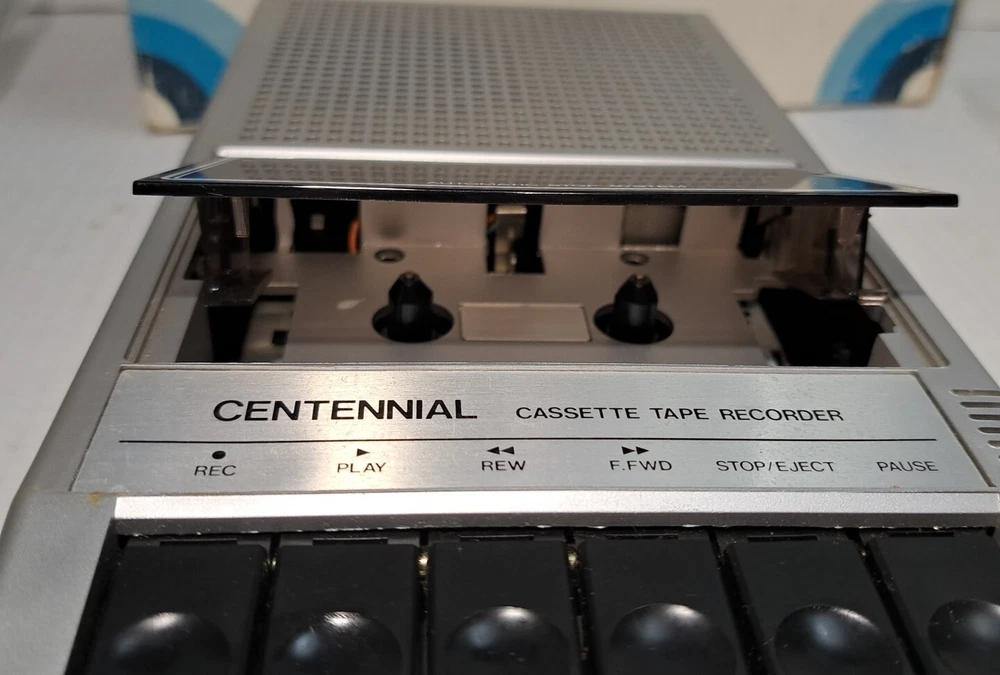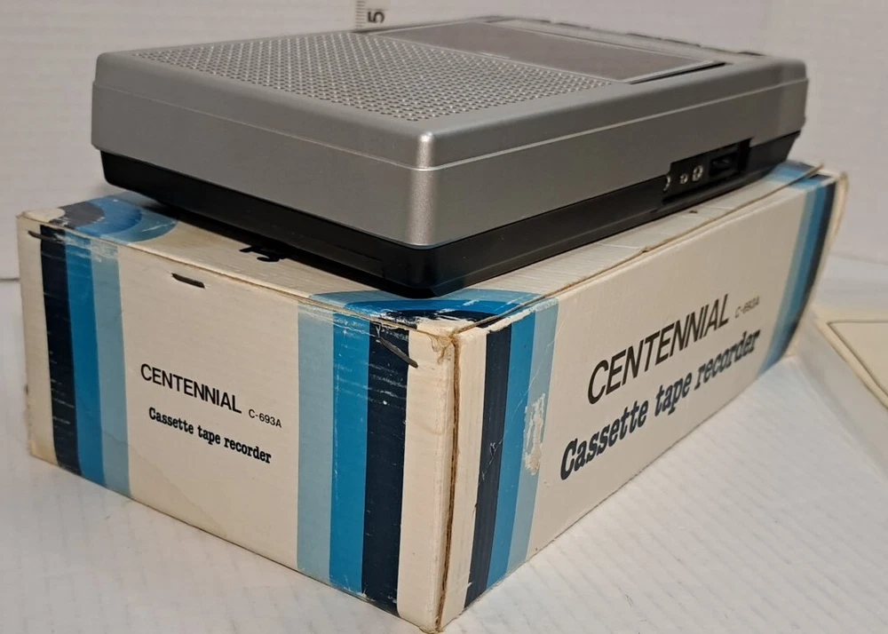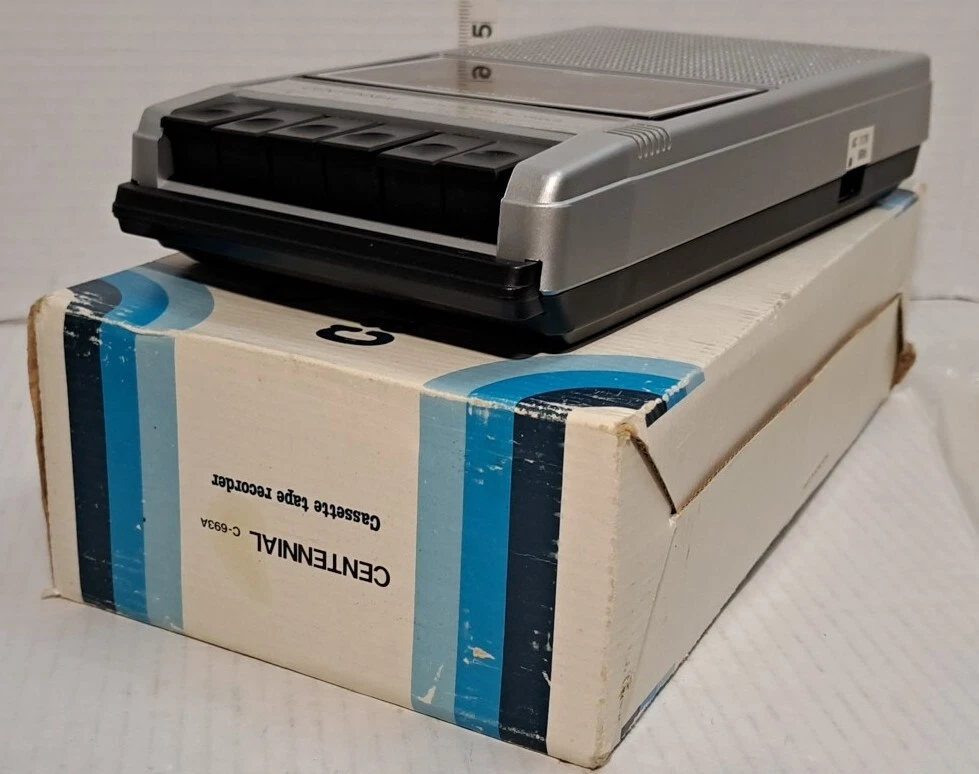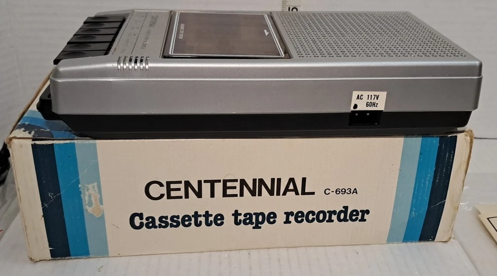 Centennial Slimline C-693A Power Cord or Battery operated Vintage Cassette Tape Recorder I tested it using the included power cord, and it worked nicely. I did not test using batteries as I didn't have any size C batteries. The battery compartment looks really clean - see photos It played a music cassette really nicely. When I first adjusted the volume, there was a little static in the dial I tried the record, pause, fast forward and rewind features, and they worked as they should. Comes with original packaging- box does have wear. Please view all photos zooming in on them as they are part of the description for you to judge condition