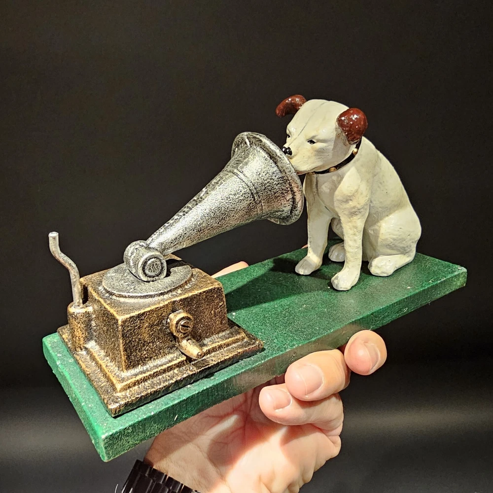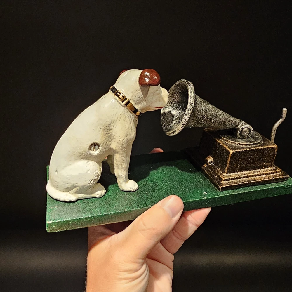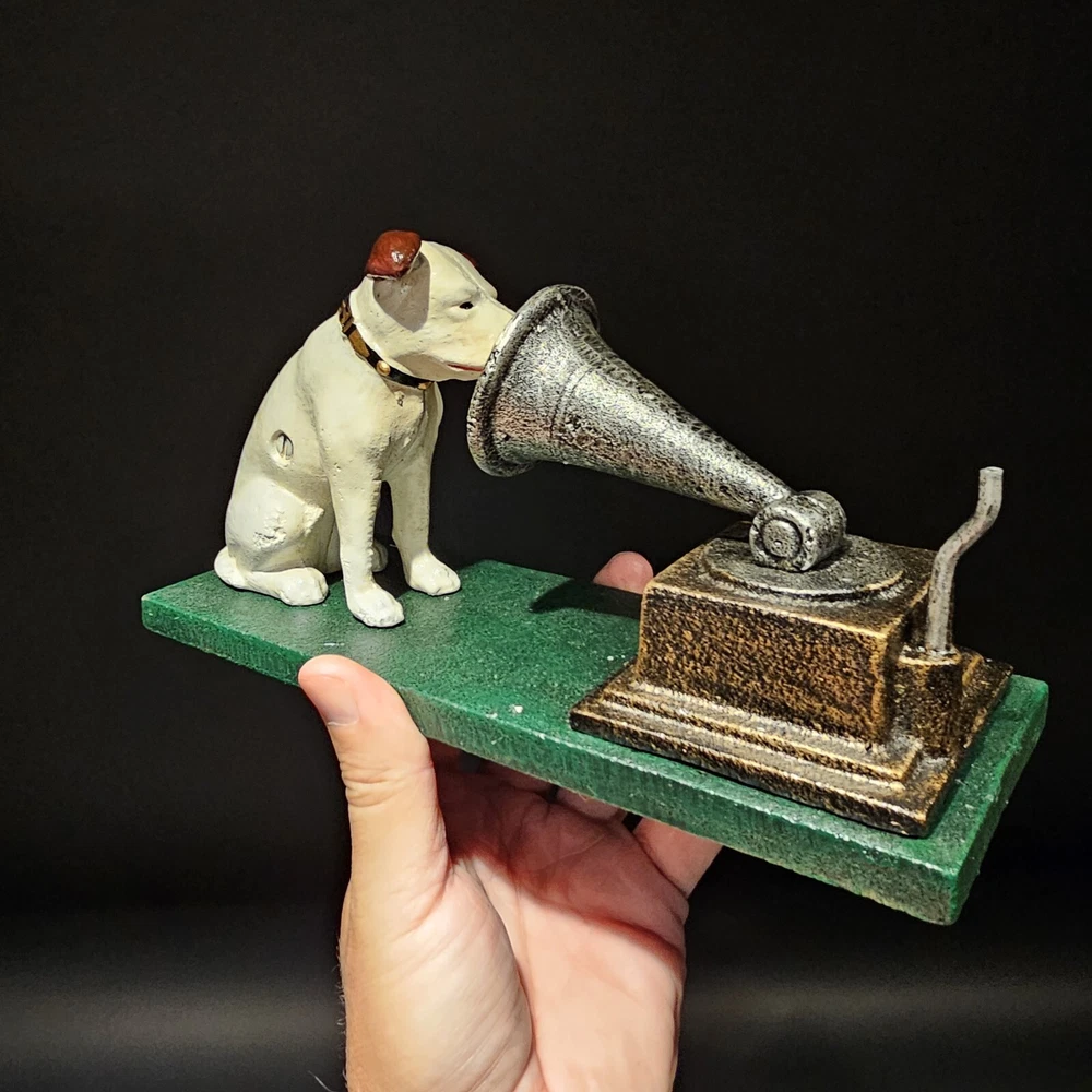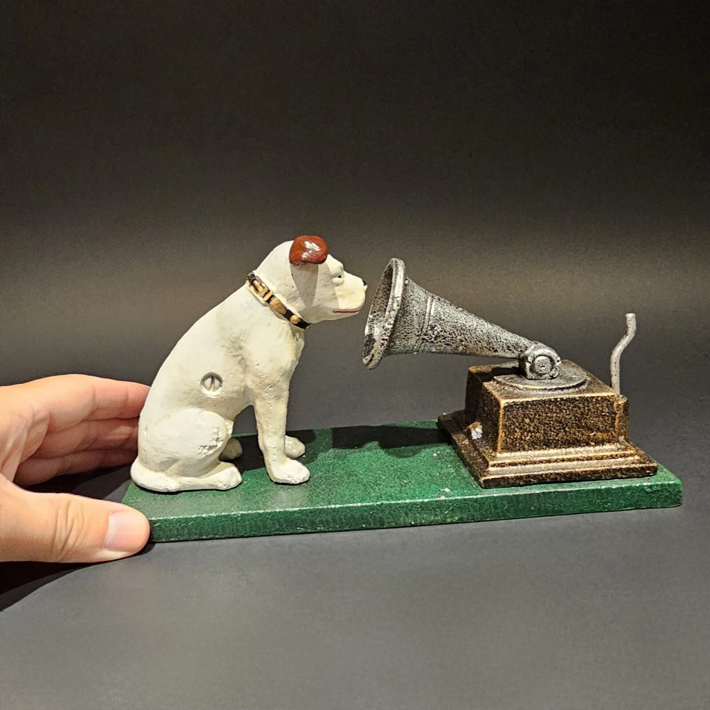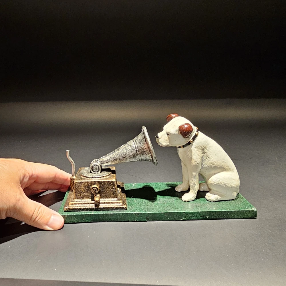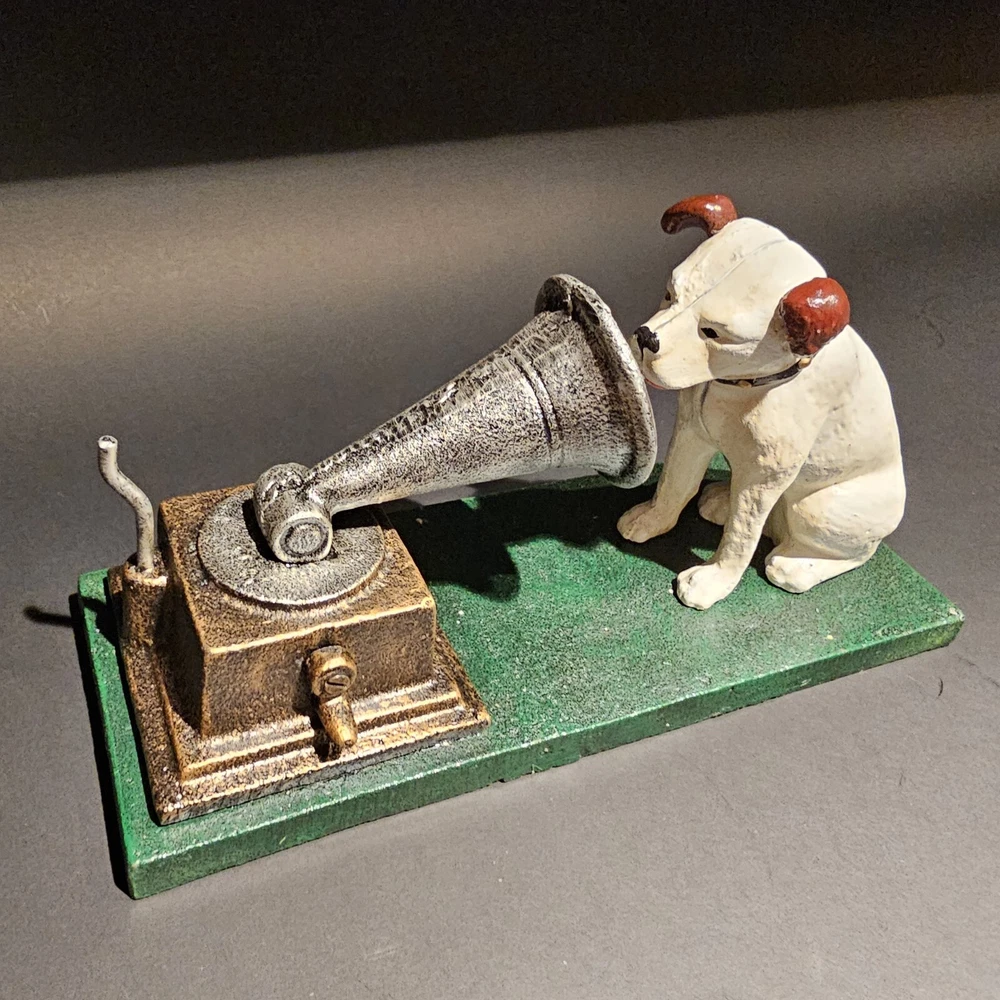 8 3/4" Long x 4 1/2" Tall x 3 1/4" Wide This reproduction cast iron piece is from the famous British record label, HVM ("His Master's Voice"). It shows Dog Nipper with a gramophone and is hand-painted with great detail. At the bottom, it says "ROGERS FOUNDRY, BIRMINGHAM." It's a special piece for any collector's set. All our items come with a 100% customer satisfaction guarantee. About the Items : Each item is inspected before shipping and we do our best not to ship something different in any way then what is shown. ...Mistakes can happen if something is not correct please contact us right away. Shipping All of our items are shipped professionally in NEW locally purchased boxes. We guarantee intact safe arrival. Please contact us if you are concerned or have questions about your order. Return Policy Purchase with confidence we guarantee satisfaction with all of our items, we do not charge restock fees. If the item needs to be returned due to a fault on our part, we will certainly pay for the return shipping. Our description or lack of is not intended to imply or express a warranty of any kind about this merchandise.