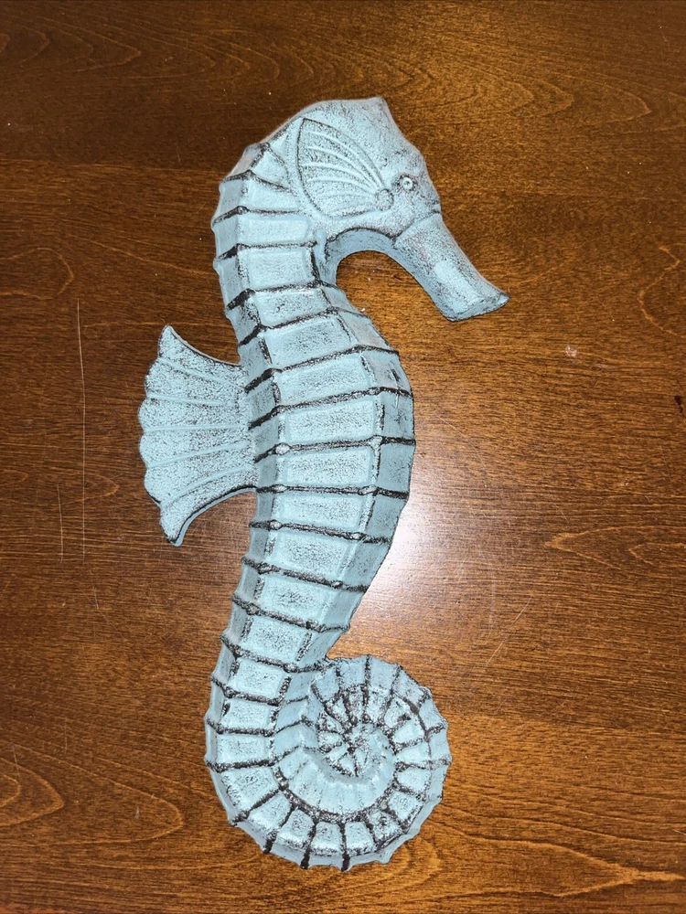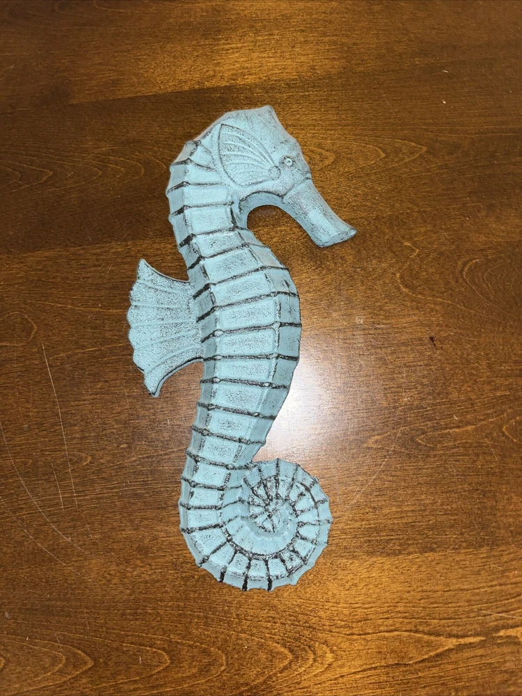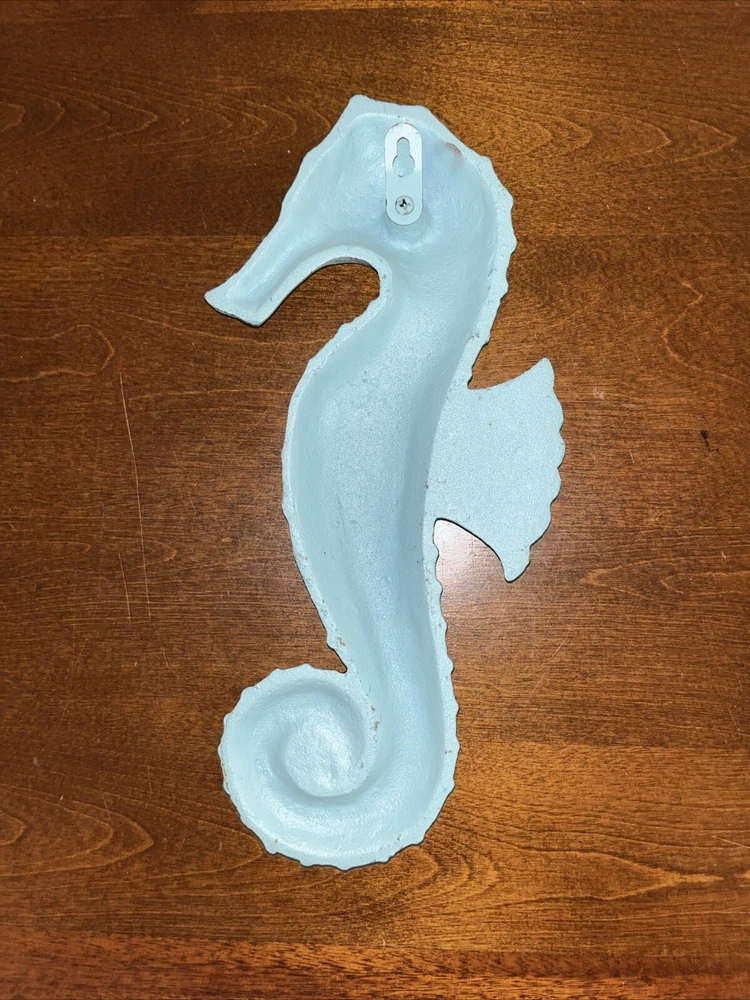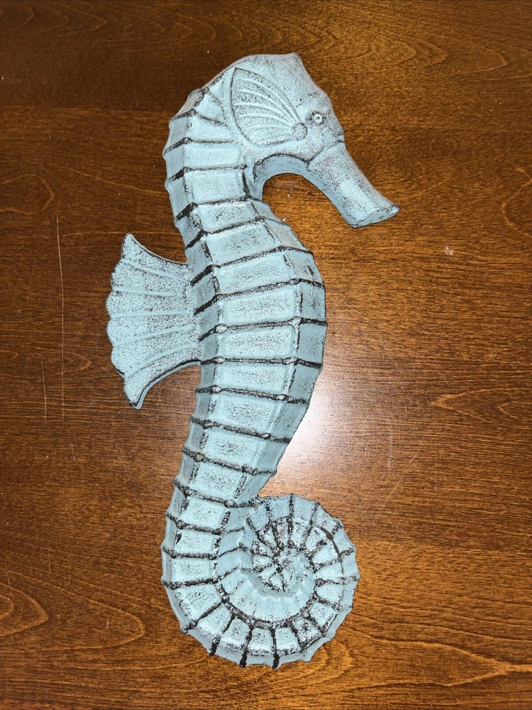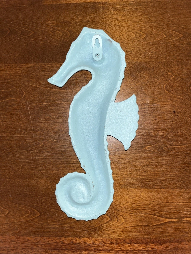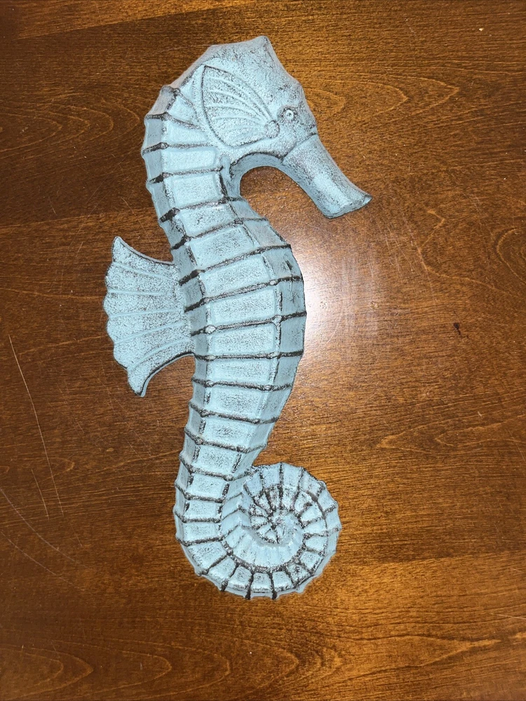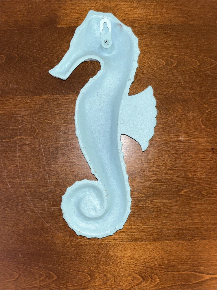 Excellent Condition! Sturdy 2.159 lbs Add a touch of ocean life to your home decor with this beautiful cast iron seahorse. Measuring approximately 12 inches by 6 inches, this decorative wall piece comes in a stunning sea foam green color that will complement any room. The seahorse is made from durable cast iron material and comes with an attached mounting bracket for easy display. Perfect for everyday use, this seahorse decoration is a great addition to any room in your home. Its vertical orientation and nautical theme make it an ideal choice for adults who love sea life. Clean with a damp cloth for long-lasting beauty. Bring the wonders of the ocean to your home with this unique and charming cast iron seahorse.