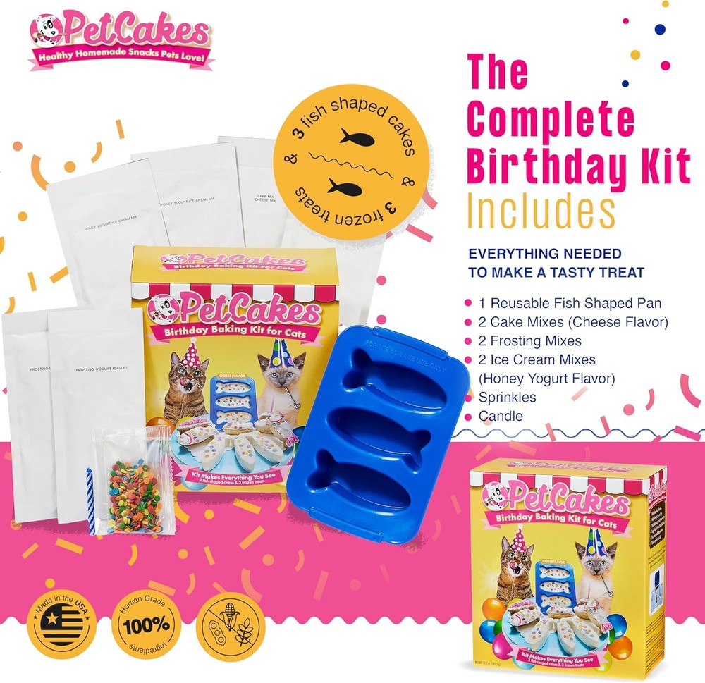 Birthday Baking Kit for Cats- Makes 3 Frosted Fish 14.3 Ounce (Pack of 1) Product Details Item Weight: 0.634 ounces Manufacturer: PetCakes Item Package Dimensions L x W x H: 7.28 x 6.73 x 3.31 inches Brand Name: PetCakes Directions: See Image Label Size: 14.3 Ounce (Pack of 1) Age Range Description: All Life Stages Number of Items: 1 Breed Recommendation: Any Specific Uses for Product: Appetite Stimulation Package Dimensions : 7.28 x 6.73 x 3.31 inches; 0.63 ounces Manufacturer : PetCakes Brand: PetCakes Flavor: Cheese Age Range (Description): All Life Stages Item Form: Powder Specific Uses For Product: Appetite Stimulation Cat cake mix & frosting kit for a tasty birthday cake with ice cream - easy and fun to make at home with your kids! Add water to the cake mix & microwave in the fish shaped cake pan - comes with sprinkles & a candle! Add water to the cat ice cream mix & freeze for just three hours - top with their favorite treats. Quality, human-grade ingredients - free from wheat, corn, and soy. No added sugar, salt or preservatives. 100% USA made - We are proud to make our natural cat treats with quality ingredients here in the USA.