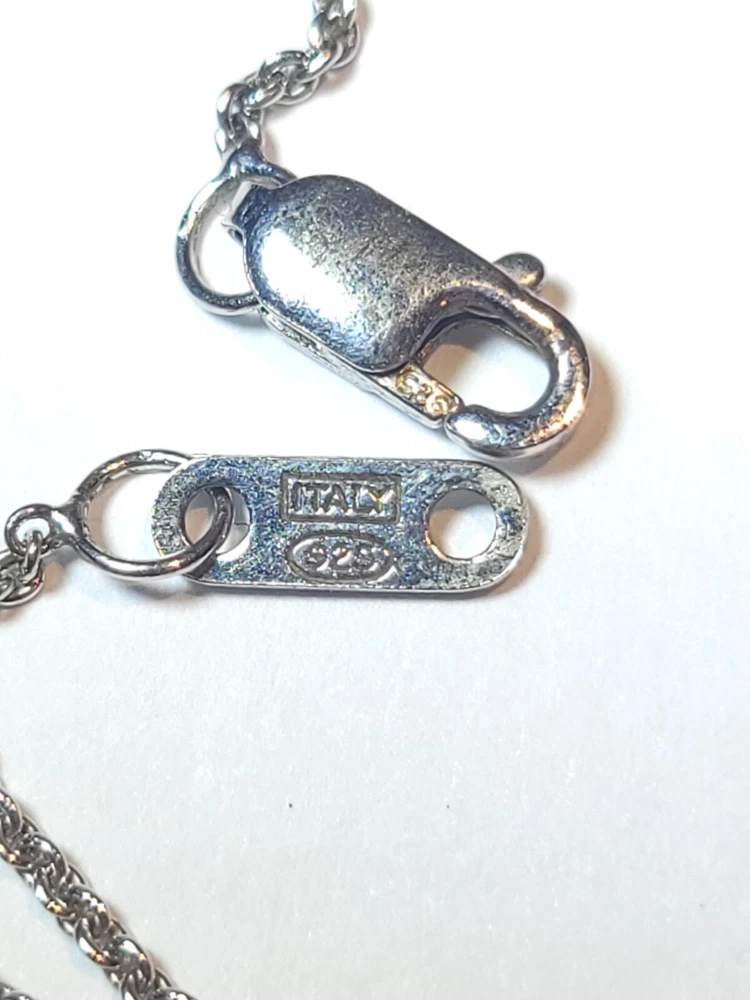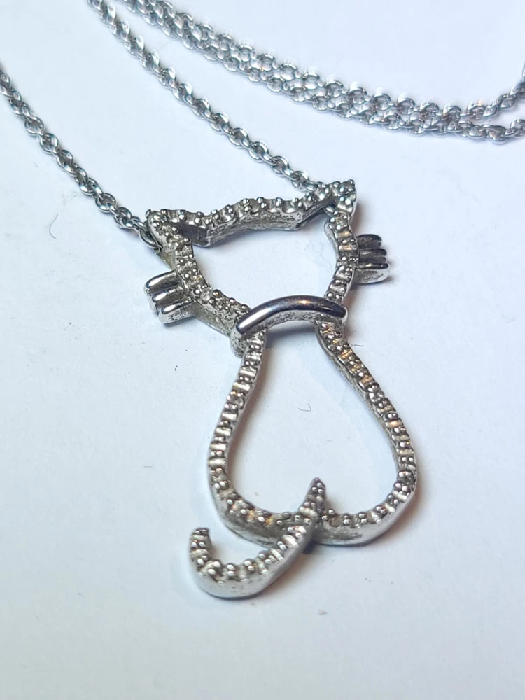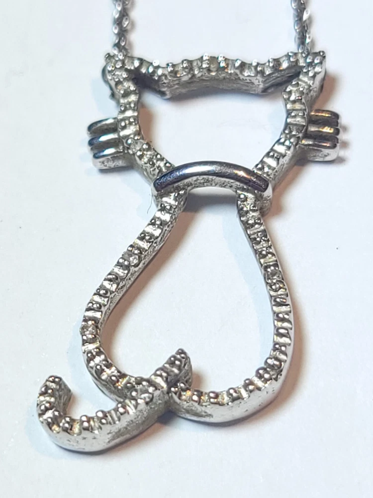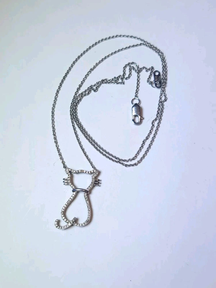 This necklace features a charming cat-shaped pendant made of sterling silver. The pendant is adorned with tiny sparkling diamonds, adding a touch of elegance to the piece. The necklace comes on an attached 18.5" chain and features a lobster closure marked "925 Italy. " This cat necklace is a stylish and whimsical accessory for any cat lover or animal enthusiast looking to add a playful touch to their outfit.