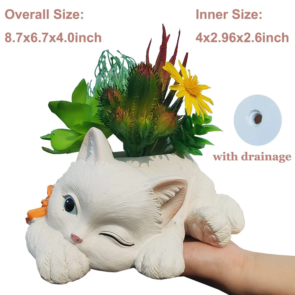 Uniboho Cat Planter for Indoor Plants - Cute Plant Pots Succulent Flower Cactus Animal Planters with Drainage 8.7x6.7x4.0inch Cat Planter for Indoor Plants - Cute Plant Pots Succulent Flower Cactus Animal Planters with Drainage 8.7x6.7x4.0inch Free Shipping 24/7 Customer Service Premium Quality Adorable cat-shaped planter pot for indoor or outdoor use Dimensions: 8.7x6.7x4.0 inches Plant Area: 4.0x3.0x2.6inch Comes with drainage holes for healthy plants Perfect for holding succulents, flowers, Cactus and other small plants Adds a cute and fun touch to any space Great gift for cat lovers and pet owners Can be used as a decorative vase or plant holder Ideal for office or home décor collections Made with high-quality Resin for long-lasting use Shipping Information We offer FREE shipping on all orders! We ship within three business days of payment, usually sooner. We use a selection of shipping services such as UPS, FedEx, USPS, etc. We only ship to the lower 48 states, no APO/FPO addresses or PO Boxes allowed. Return Policy You can return a product for up to 30 days from the date you purchased it. Any product you return must be in the same condition you received it and in the original packaging. Please keep the receipt. Feedback Customer satisfaction is our top priority. If you have any problem with your order, contact us immediately. We respond to all inquiries within 24 hours and will do our utmost to ensure you are fully satisfied with your shopping experience. Contact Us If you have any queries, please contact us via eBay. Our dedicated customer support team prioritizes your satisfaction and guarantees a response within 24 hours on weekdays. Discover Dobby's Deals! Thank you for choosing Dobby for your shopping needs. Explore more premium items in Dobby's Store today!