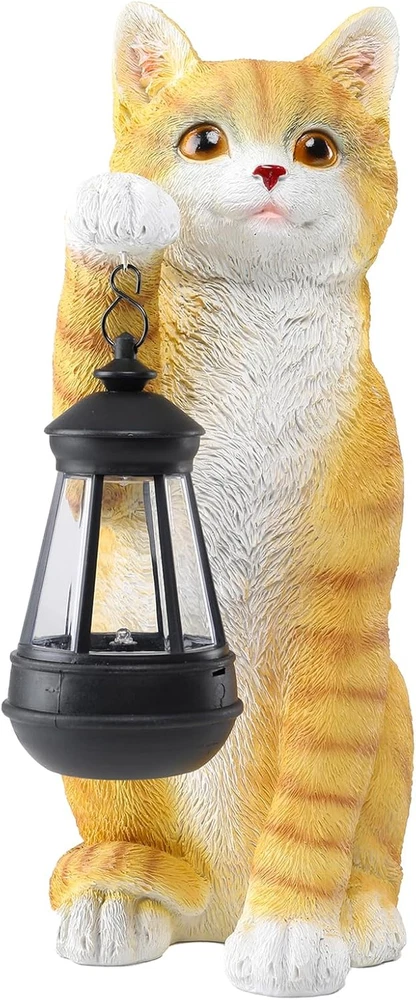 Unique Design: This adorable cat garden statue with a lantern in its paw, seamlessly blending the playful charm of feline grace with the enchantment of subtle illumination. This statue is very suitable for outdoor decor such as gardens and courtyards Charming Gift Option: This cute cat figurines lantern makes a thoughtful and delightful gift for your mother or female friends who love animals or gardening. It will bring them blessings and good luck, adding a touch of warmth to their lives Easy to Charge: This outdoor cat statue adds a touch of beauty to your outdoor space. Simply turn the switch to 'ON' during the day and place it under the sun to charge for 8 hours. The statue will then light up automatically for 8 hours at night Waterproof and Weather Resistant: Made of high-quality resin, this solar cat statue is durable and suitable for outdoor use, resisting rain, snow, or frosty weather. It will stand the test of time and keep shining in your garden or yard Customer Service: If you have any questions, please email us, and we will provide a satisfactory solution within 24 hours Product Description Suitable for various scenarios Adaptable Aesthetics - Cat Statues for Garden This artful cat statue, adorned with a lantern detail, boasts a versatility in its charm, effortlessly harmonizing with a myriad of settings – from blossoming gardens to tranquil cobblestone paths, and even the backyard patio, imbuing each space with a whisper of whimsy and a touch of refined taste. Cat Garden Statue - Illuminating Garden Charm!!! This Solar Powered Outdoor Cat Garden Statue Infuse your outdoor oasis with a singular allure. With the gentle glow of its lantern, imbues the garden with an ethereal quality, elevating the ambiance to one of magical tranquility. Add a special touch in your garden!!! An undeniably singular choice in gifting, this captivating cat sculpture clutching a lantern transforms into a profound emblem of your affection, bestowing upon cherished recipients a fragment of enduring loveliness. It graces their domestic domains with a compelling story woven from threads of artistic expression and luminous enchantment, mirroring the very depth and tenderness of your emotional bond. This thoughtful present, more than a mere decoration, stands as a beacon of your heartfelt warmth, illuminating not just their physical surroundings but also touching their souls with a gentle reminder of your unspoken care and admiration.