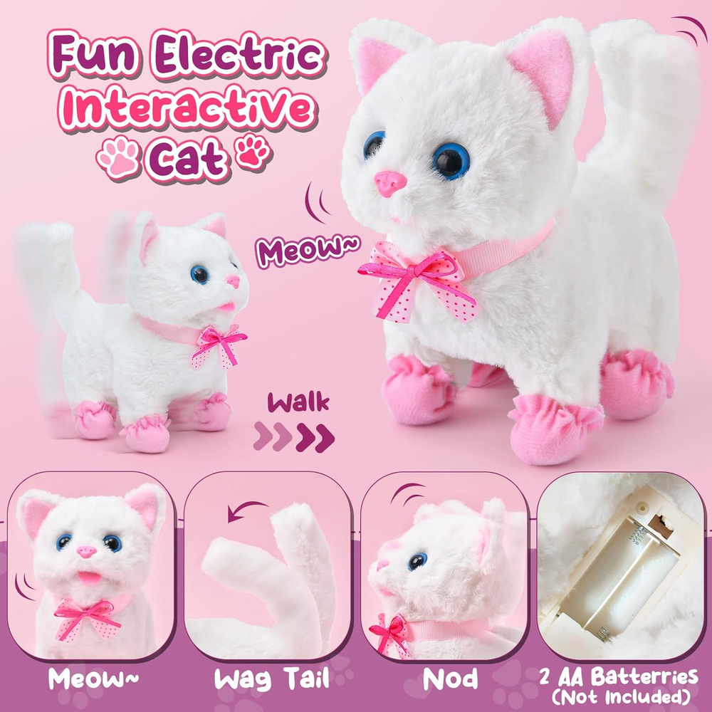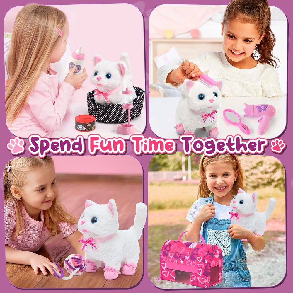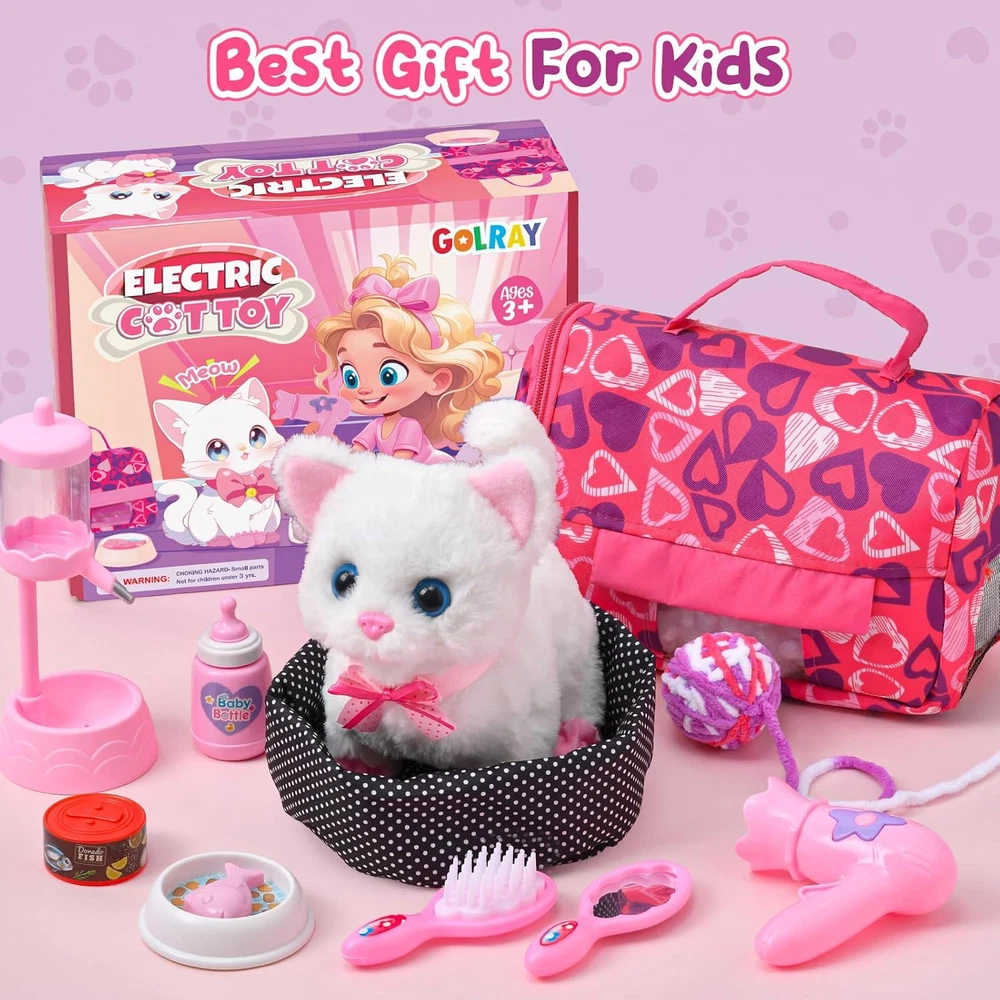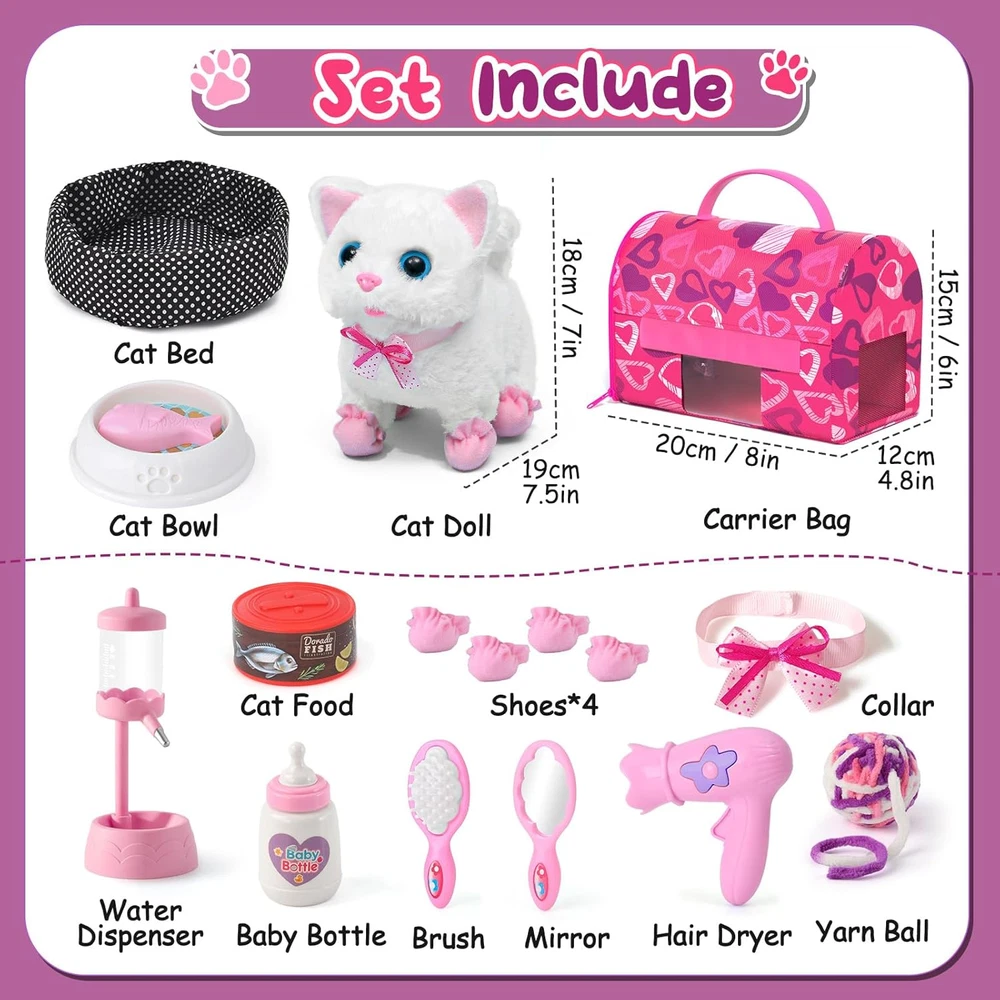CUTE WHITE CAT COMPANION : Get ready to meet your kids' new furry friend - adorable white cat! With our interactive toy cat, kids' pretend play won't be like a monologue anymore. The white kitten toy comes with batteries installed, enabling it to perform lifelike actions like walking, meowing, and wagging its tail, providing a realistic pet experience. Your kids can indulge in the joys of pet ownership, simulating the daily routine of caring for their beloved feline friend PET CARE & BEAUTY PLAYSET : Our electronic cat toy set features a white cat (batteries are not included), a water dispenser, a cat bowl with fish, cat food, and a baby bottle for feeding. Additionally, a cat yarn ball and a cat bed add to the play experience. Kids will love using the included hair dryer, brush, and mirror to groom their cat, ensuring it always looks its best. The cat carrier bag adds to the realism, while the cat collar and shoes provide for stylish outings GIRLS TOYS WITH PORTABLE CARRIER : Our cat carrier bag boasts a side zipper for easy access, a transparent window for visibility, breathable holes for ventilation, and a handle for taking the set everywhere. All accessories can be stored inside the cat bag, ensuring everything is organized and accessible. Toy cat will be taken care of and shown off by the girls, who pop it into the carrier bag and take it to grandma' s house ADORABLE GIFTS : Designed for kids aged 3 4 5 6 7 8, our kids toys with a cute gift box and toy cat is a nice gift choice. Nice childhood memories as 3 year old girl gifts, toddler girl toys, juguetes para niñas, 4 year old girl Christmas gift ideas, girl toys age 3-4 years old, 5 year old girl birthday gift ideas, toys for girls 4-6, girls toys 6-8. We are committed to ensuring you and your girl have a positive experience CUSTOMER SERVICE : While taking care of the cat stuffed animals, kids learn about empathy and responsibility. Also help develop imagination and social skills. Smooth surface design eliminates any worry about rough edges. With the cat by their side, kids won't feel lonely or bored, even without parents around. We value kids' smile, if there is any issue or concern, we will solve it in time Product description Electronic Toy Cat Set Our interactivecat toy set includes everything your child needs to pamper their new toy pet. Interactive White Cat Toy for Kids Ready to introduce your kids to a fluffy new friend? Get ready to bring this white cat to life with batteries (not included). It can walk, meow, and wag its tail, just like a real cat, making pet ownership a joyous experience for kids. Cat Fun - A Day in the Life of Kitten Care Kids wake up their cat, using baby bottle and cat food for feeding. Girls transform into stylists, using the hair dryer, brush, and mirror to give their cat a sleek and shiny makeover. As the day winds down, kids gently place their cat into cat bed, ready for a night of recharge. Cat Yarn Ball Cat balls with bell inside to attract the kids' and cats’ attention when they are playing. Cat Water Dispenser Accessories full of details. Water dispenser can be lifted and lowered design. Cat Carrier Bag Everything fits inside, so it's easy to keep everything tidy and ready for action. A Wealth of Accessories Interactive Electric White Cat Set includes Feeding Kit - Cat Bed, Cat Carrier Bag, Water Dispenser, Baby Bottle, Cat Food, Cat Bowl with Fish, Cat Yarn Ball Beauty Kit - Cat Collar, Cat Shoes, Mirror, Brush, Hair Dryer. Girls will love taking care of their new cat, and can even show it off to grandma by popping it into the carrier bag and heading out for a visit! Learning & Fun: Empathy, Responsibility, & Skills Our interactive toy cat is great playmate for kids' imaginative adventures. While taking care of the cat stuffed animals, kids learn about empathy and responsibility. Also help develop imagination and social skills. Gift for Girls Designed for kids aged 3 4 5 6 7 8, our kids toys with a cute gift box and toy cat is a nice gift choice. Nice childhood memories as 3 year old girl gifts, toddler girl toys, juguetes para niñas, 4 year old girl Christmas gift ideas, girl toys age 3-4 years old, 5 year old girl birthday gift ideas, toys for girls 4-6, girls toys 6-8.