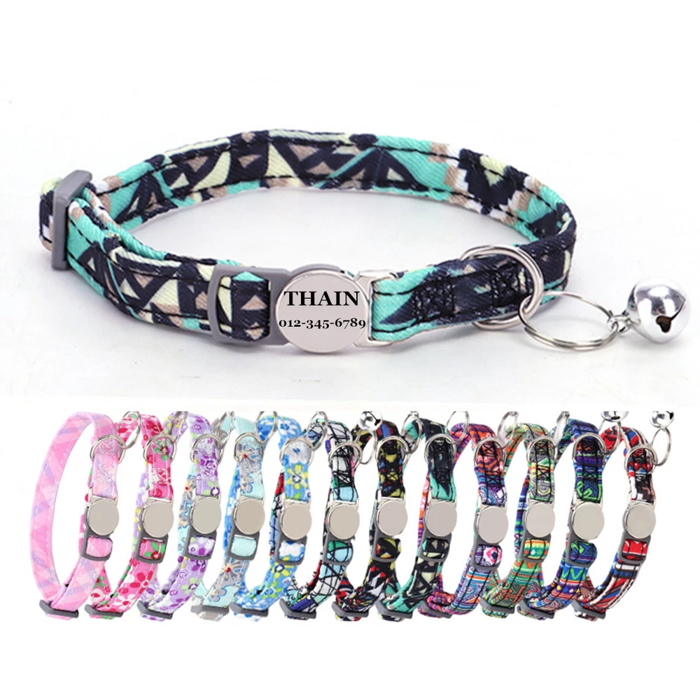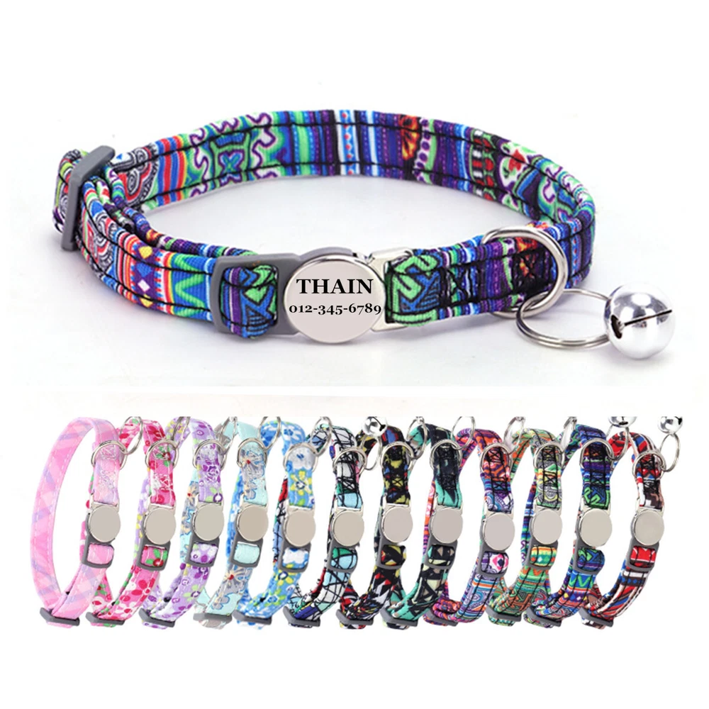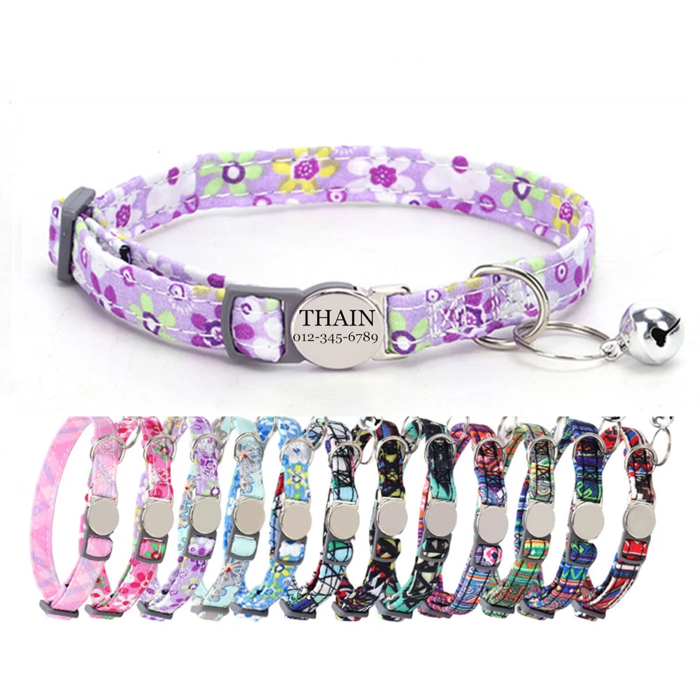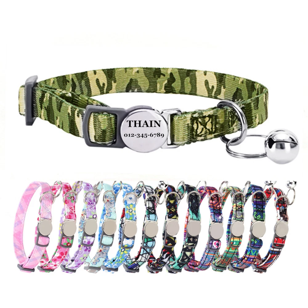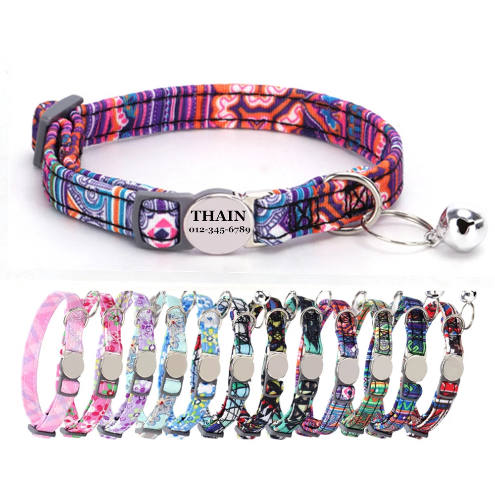 Product Name: THAIN Cat Collar Personalized with Bell-Custom Cat Collar Engraved nameplate with Name and Phone,Adjustable for Cats and Kitten Material: Nylon+ Half Metal Buckle Size: S (7"-11")(18-28cm) How to Order Please write engraving details in box at the top of listing page. Product Features: ★ 【 Adjustable Size 】 0.39 inch width,neck adjustable is 7 inch to 11 inch(18 to 28cm),adjustable design makes it fit most cat from teenager to senior, even good for other small pets in similar size; Please confirm the size before purchase ★ 【 Half Metal Buckle 】 Half Metal Buckle can be engraved words, quick release is easy for you to put on and off. ★ 【 Material 】 Made of durable nylon with printing pattern, The nylon webbing has smooth sewed edges. Great for almost all indoor cats and small puppy dogs. ★ 【 Multiple flower patterns 】 There are different 16 multiple patterns to choose, flower, plaid, Green Camo and so on ★ 【 No More Noise 】 The half metal buckle is made of stainless steel but lightweight. Compared with hanging tags, it will never get caught somewhere and great for quiet cats, no more noise to hite the bowl when eat or drink. Metal Buckle where we will engrave the pet's name and phone number or address Laser engraving makes words are clear, keeps pet's information engraved permanent. Note: For engraved words,please send us a message as below: Line 1: pet's name Line 2: phone number Smaple: Line 1: Bella Line 2: 012-345-6789 How to choose the right size? Measurement Tips: Please use a soft ruler around your Cat's neck, to measure the surrounding of it. Please don't make it too tight. Better leave a space that can put 2 fingers. So your puppy may feel more comfortable. Package include: 1 pcs pet collar Shipping: 1.Items will be sent out in 24-48 hours on payment received from Monday to Saturday. Orders during weekends and holidays will be posted in the following working day. 2.it usually will take 15-20 business days to arrive by SPEEDPAK. 3.Please make sure your shipping address and the order information is correct before placing an order. We will not be responsible for item loss due to wrong or unknown address. 4.International buyers are responsible for duties and customs fees. Return Policy & Warranty: 1. In our store, you will enjoy 30 days return/refund guarantee (Excluding misuse of the item and damaged item). 2. If the item you received is faulty, damaged or incorrect, or any further problems, you can return it for replacement or refund, please contact our customer service on eBay within 30 days from item received. 3.For damaged items on arrival, please contact us immediately, sending us an email with a photo is preferred. We will offer solutions to such cases. Full refund or replacement will be guaranteed. Contact us: Customer satisfaction is very important to us, our goal is to earn 5 star positive feedback on every sale! We would appreciate the chance to correct any problems before posting anything other than 5 stars positive feedback. So if for ANY reason you are not happy, please contact us directly through “My Massage” or "Ask Seller Q". We will get back to you as soon as we are available. We are always stand-by to help for any questions or concerns.
