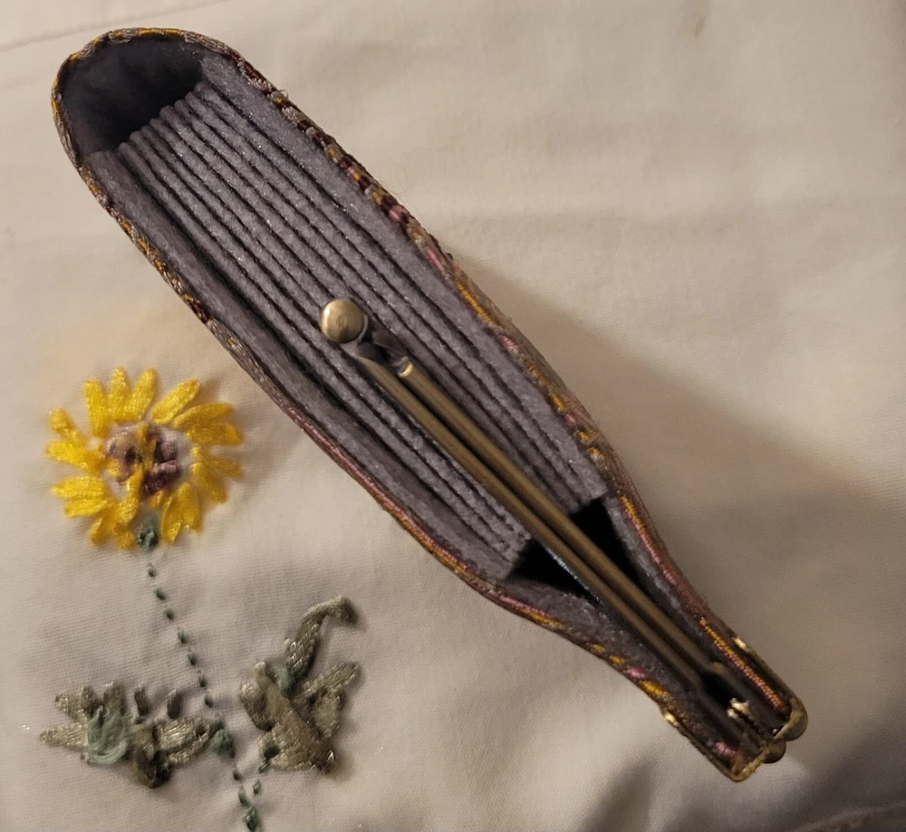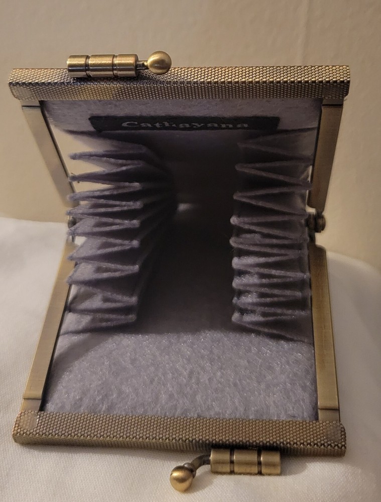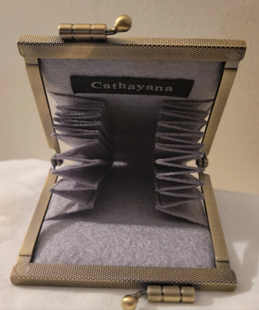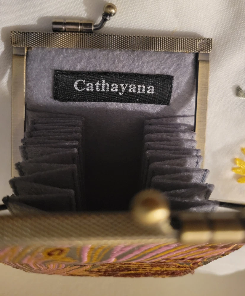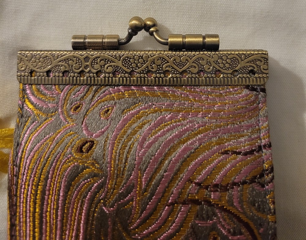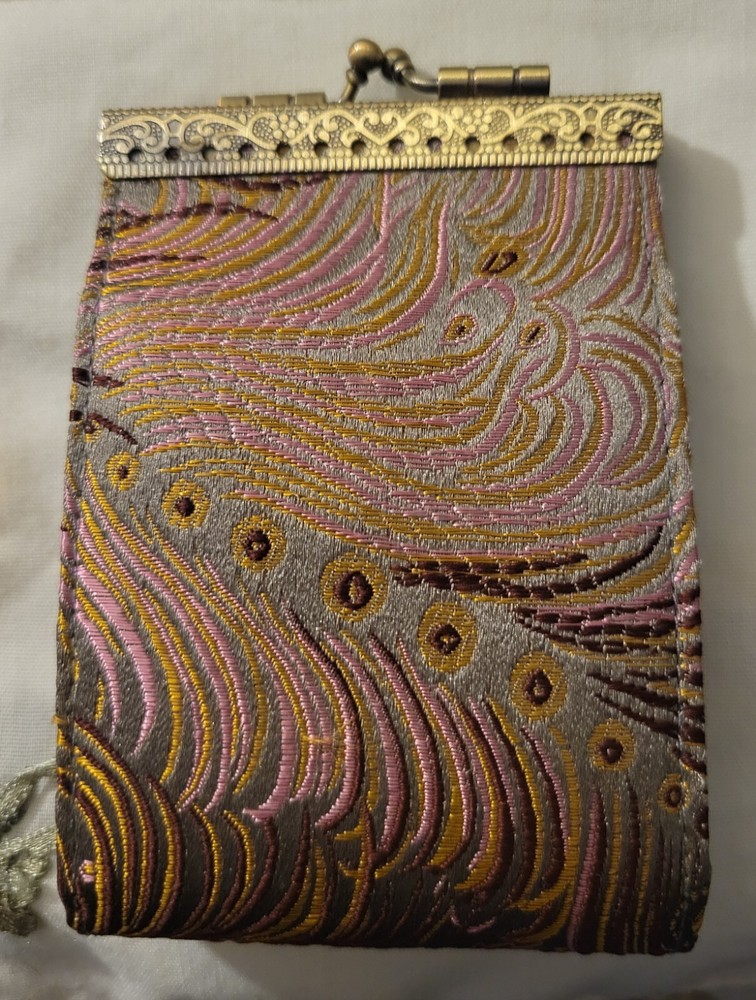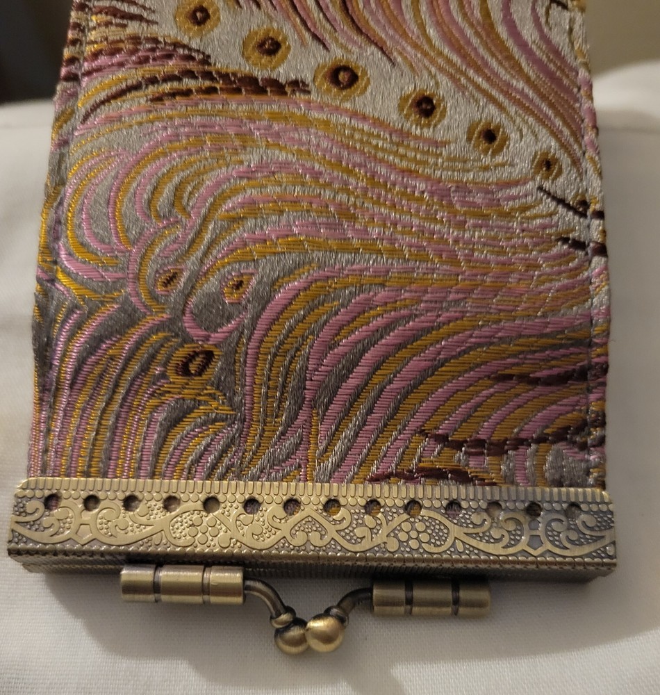 Cathayana Card Holder Grey/Brown, Pink Peacock This unique card holder has a beautiful brocade exterior and quality felt accordion interior. This makes an excellent gift, even for yourself, and will be an instant favorite! -Dimensions: 4.75"H x 3.0"W x 1.0"D -Easy to open and close with a kiss love clamp -10 card slots Good Preowned condition