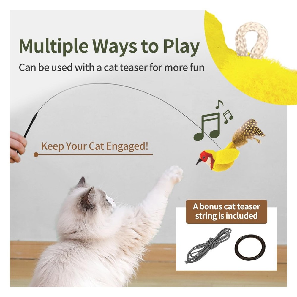 * Natural Catnip, our toys are filled with natural catnip which are more interested for cat to play with, it helps your cats to relieve anxiety, reduce boredom. * Chirp Sound, lifelike Chirp bird sound activated by slight touch of your cats, attract their interest to play with, to release their anxiety, boredom while you are away home. * Gift Box Packing, perfect for gift. * Real Feather bird tail. * Natural Catnip, our toys are filled with natural catnip which are more interested for cat to play with, it helps your cats to relieve anxiety, reduce boredom. * Chirp Sound, lifelike Chirp bird sound activated by slight touch of your cats, attract their interest to play with, to release their anxiety, boredom while you are away home. * Gift Box Packing, perfect for gift. * Real Feather bird tail.