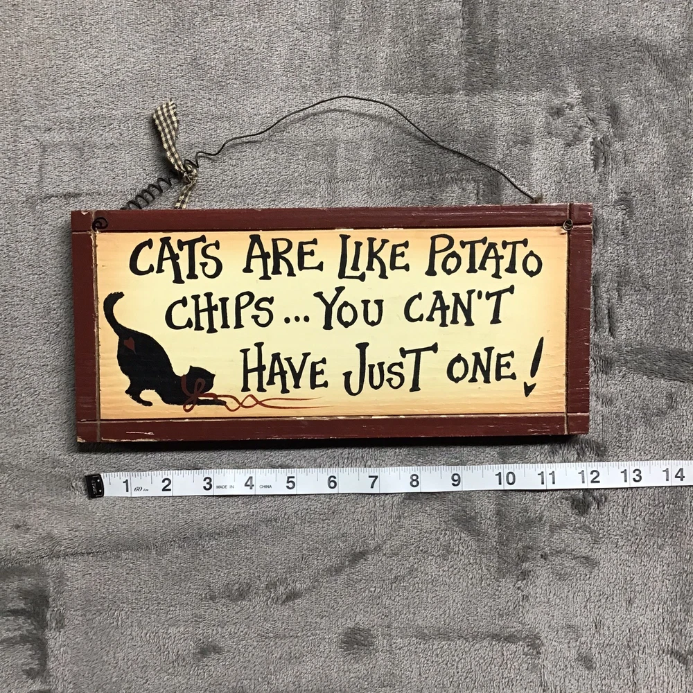 This wooden sign features a contemporary design with a wood grain pattern and a rectangular shape. It showcases the character of Ares and a theme centered around cats, making it a charming addition to any room in your home. The sign includes a wire hanger for easy display and depicts the phrase "Cats Are Like Potato Chips...You Can't Just Have One", adding a touch of humor and whimsy to your decor. Perfect for cat lovers who appreciate a touch of personality in their home.