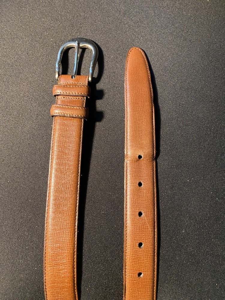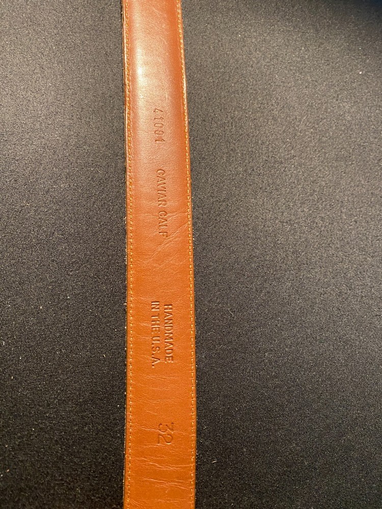 This handmade belt is a premium piece with a solid pattern and a vintage style, made in the USA from cowhide leather in a rich brown color. It features a classic nickel buckle and is designed for both work and dress occasions, with an adjustable fit for comfort. The Caviar Calf 41001 belt is a high-quality accessory that exudes a timeless appeal, perfect for adding a touch of sophistication to any outfit.