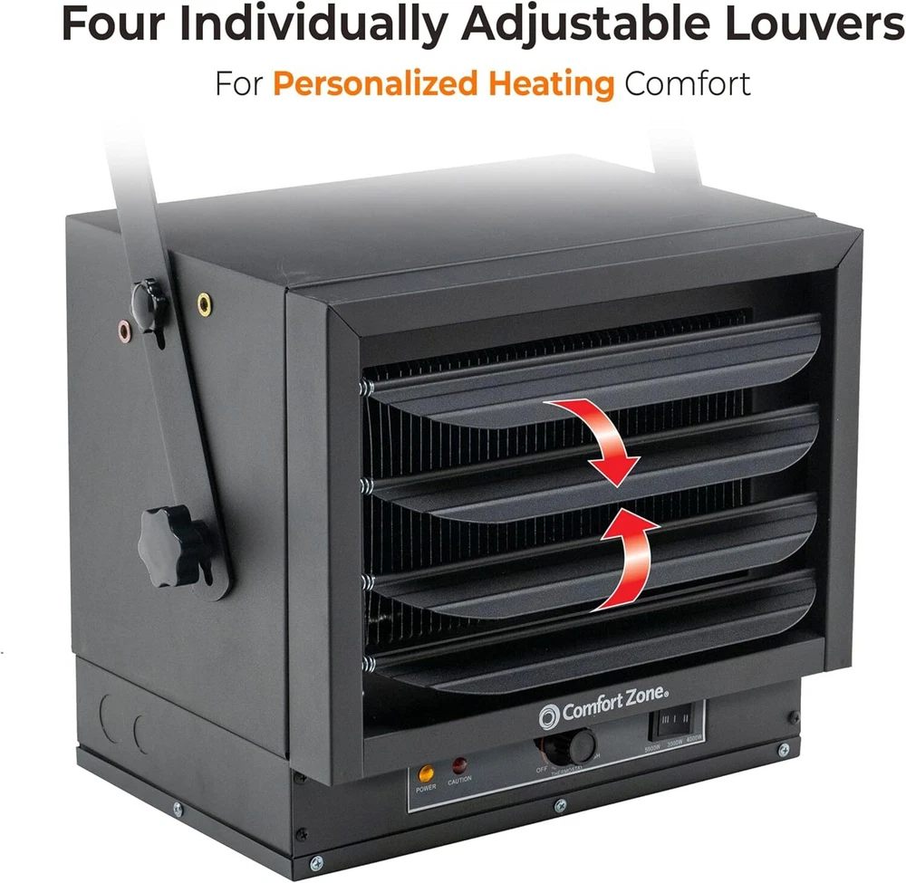 EFFICIENT CEILING MOUNT: With its ceiling-mount design and hard-wired installation, this fan-forced heater is perfect for spaces like warehouses, garages, and storage areas where floor space is limited. By utilizing the overhead space, you can maximize the utilization of your area while still enjoying powerful heating capabilities. Embrace the space-saving benefits of this ceiling-mounted heater and keep your valuable floor space free from obstructions. ROBUST STEEL CONSTRUCTION: Constructed from heavy-gauge steel, the body of this commercial heater exhibits exceptional durability, making it highly resistant to the temperature fluctuations commonly found in poorly insulated areas. With its robust steel construction, this heater is built to withstand the rigors of demanding environments, ensuring long-lasting performance and reliable heating capabilities. Embrace the reliability and durability of this steel-constructed commercial heater for efficient heating in challenging conditions. PRECISE HEAT DISTRIBUTION: The inclusion of louvers and an adjustable mounting angle enables targeted heating, allowing you to direct the airflow precisely where it is needed most. With its fan-forced design, this heater facilitates the efficient distribution of heat throughout the room, ensuring a consistent and comfortable environment. Experience the benefits of precise heat distribution and optimal airflow with this versatile and effective heating solution. USER-FRIENDLY TEMPERATURE CONTROL: The ceiling mount heater features a dual knob thermostat that provides convenient and precise control over the temperature settings. With these intuitive controls, you can easily adjust the heat output to achieve the perfect level of warmth for your space. The quick on/off functionality ensures effortless operation of the heater, allowing you to enjoy immediate comfort with just a simple twist of the knobs. Experience the convenience and ease of use offered by this efficient temperature control system. ENHANCED SAFETY FEATURES: Designed with your safety in mind, this ceiling mount heater is equipped with intelligent safety features for worry-free operation. The built-in sensor monitors the temperature and automatically shuts off the device if it detects overheating, providing reliable protection against potential hazards. The power indicator light conveniently illuminates when the unit is in use, giving you clear visual confirmation of its operational status. With these smart safety measures in place, you can enjoy the warmth and comfort.