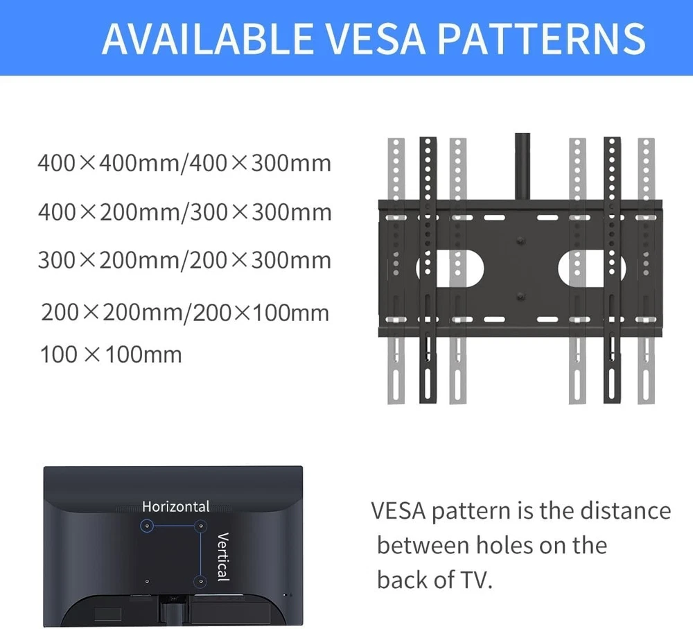 Ceiling TV Mount Bracket LCD LED Plasma 26-65 inch Tilt Swivel Height Adjustable NOT DELIVERED TO MIAMI-DORAL-Warehouse- OUT OF STOCK ADDRESS. All order use Stock address and PO box address will be cancel. Please don't make order Specifications : Ceiling Display Mount - ideal for most 26-65" LCD LED plasma flat panel display weigh up to 100lbs (45kg) Adjustment - 15° tilting of TV plate, +/-90° tilt of wall plate (or 360° swivel) to achieve the ideal screen viewing position Compatibility - compatible with VESA 100x100mm-400x400mm, fits both flat ceiling and sloped ceiling Feature - height adjustable from 21.25" to 30.7", integrated cable management Package - 1×ceiling mount, 1×standard installation kit, 1×user manual Product Description: Height Adjustment 4 levels height adjustment of pole. Angle Adjustment Tilt 15° of TV. +/-90° Tilt Tilt +/-90° of wall plate if installed as the way above. 360° Rotation Rotate 360° of installed as the way above. Step 1 Two ways of connecting wall plate and outer pole: +/- 90° tilt or 360° rotation. Step 2 Connect outer pole and inner pole if needed. Then connect pole and TV plate. Step 3 Install Hooks on the TV. Step 4 Hang the TV on the TV plate (2 people needed). Shipping & Handling: Processing Time: 3 – 5 business days. Standard US Shipping Time: 2 - 9 business days. Shipping Time WW: Average 7 - 10 business days, maximum 15 business days for some location. Term of Sale: We reserve the right to deny payment from unverified PayPal accounts or any suspicious or fraudulent activity. We reserve the right to end the auction earlier when there is problem with the item. We will make refund / reshipment if there's defect on our product or if we sent the wrong size/product code. Buyer should send picture(s) of the item(s) that have problem for our reference. Shipping charges are not refundable. Feedback: Positive feedback will be given once payment received. If you are satisfied with our product please kindly leave us a positive feedback and good ratings. If you have any issue / problem with our product, please contact us and give us a chance to solve your problem before leaving any neutral or negative feedback. Contact Us: Should you have any question please do not hesitate to send message on eBay. We will reply you within 24-48 hours and make sure you will have a good experience having business with us.