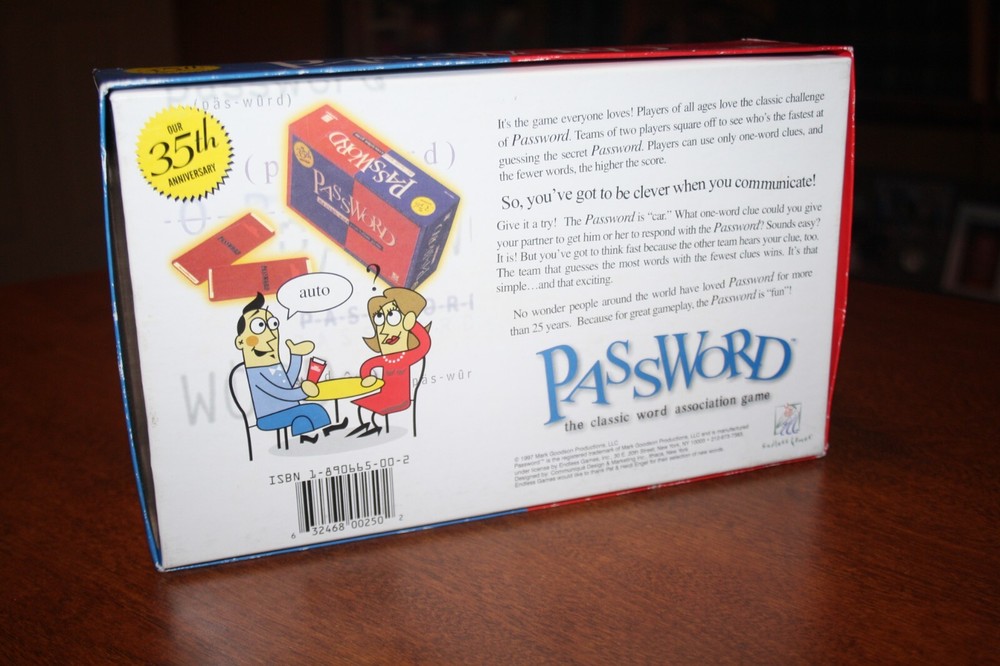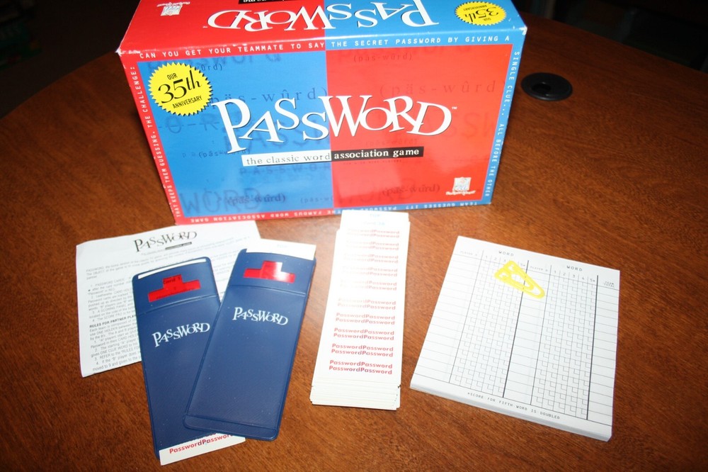 This game is in Nice Used Condition. 100% Complete! Box shows some marks, scuffs and shelf wear. Password 35th Anniversary Edition It's the game everyone loves! Players of all ages love the classic challenge of Password. Teams of two players square off to see who's the fastest at guessing the secret Password. Players can use only one word clues, and the fewer words, the higher the score. So, you've got to be clever when you communicate! Give it a try! The Password is "Car". What one word clue could you give your partner to get him or her to respond with the Password? Sounds Easy? It is! But you've got to think fast because the other team hears your clue, too. The team that guesses the most words with the fewest clues wins. It's that simple...and that exciting. No wonder people around the world have loved Password for more than 25 years. Because for great gameplay, the Password is "Fun"! Equipment Password Cards Leatherette Card Holders Scoring Panel (side of box) and clip Score Pad We love games! Buy with confidence!! We guarantee that all of the games we offer have been inspected cleaned and contain all the pieces (100% Complete!). If games are not collectibles, we may tape up box edges for durability. We are a smoke free environment. We make sure that all games include rules. It will be noted if we had to print the rules off the internet. Any small flaws with the game that do not affect game play will be noted in the item description as well. Please check our listings; we are trying to list new games every week! If there is a game you have been hunting for please send me a message, we have hundreds of games and parts, so I may already have it but just not listed it yet. IF YOU LOVE GAMES, SAVE US AS ONE OF YOUR FAVORITE SELLERS! We accept many forms of payment including PayPal. If payment is not received within 3 calendar days of bid closing, we reserve the right to relist the item. If there is a problem with any item you receive we will happily make it right, just contact us immediately for a solution. Happy Shopping!! Shipping We try to keep our shipping as low as possible so we ship USPS parcel post & First Class Mail which takes on average 2-6 days. Please double check your shipping address on file with eBay, if it is different please change before purchasing or immediately notify me by message if you would like it sent to an address other than listed. We also offer some options including Priority Mail which may be an alternative if you would like to receive your package quicker. Make sure and check those postage options. We Use Recycled Shipping Material Whenever Possible.