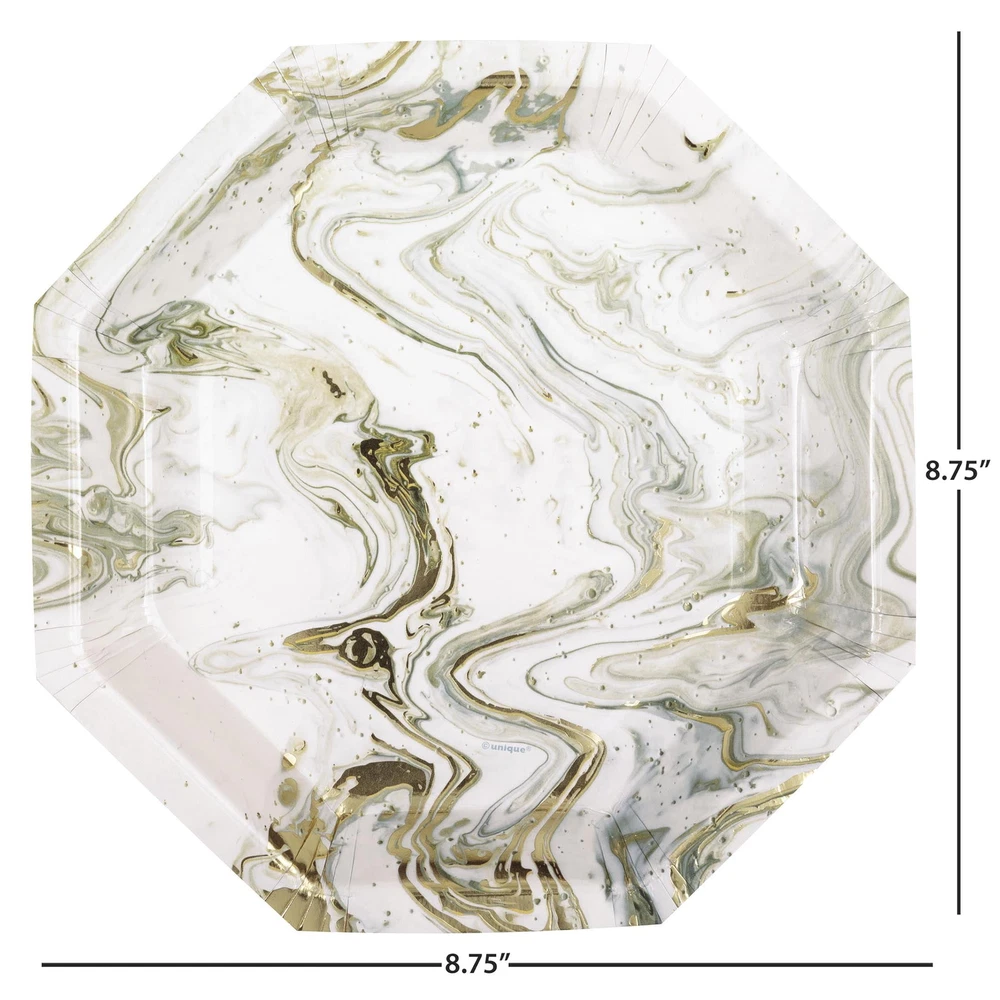 Set the scene for a glamorous celebration with our Gold and Silver Marble Party Tableware and Decoration Kit. Featuring pops of gold and silver with a chic marble print, this ensemble is stylish for a bridal shower, birthday party, or New Year’s Eve party! In this kit, you’ll find enough disposable tableware to celebrate with up to 16 guests, including 16 dinner plates, 20 cake plates, and 32 lunch napkins. Put the perfect finishing touches on your space with our 9-foot glitter flag banner and 3 ounces of foil confetti! Add more glitzy style to your bash and shop the rest of our affordable silver and gold party supplies. 20 Cake Plates (7”) 16 Paper Plates (9”) 32 Luncheon Napkins (6.5”) 1 Party Banner (9ft) 1 Pack of Jumbo Foil Confetti (3oz) Makes decorating your birthday party easy Combine with more Gold and Silver Marble party supplies