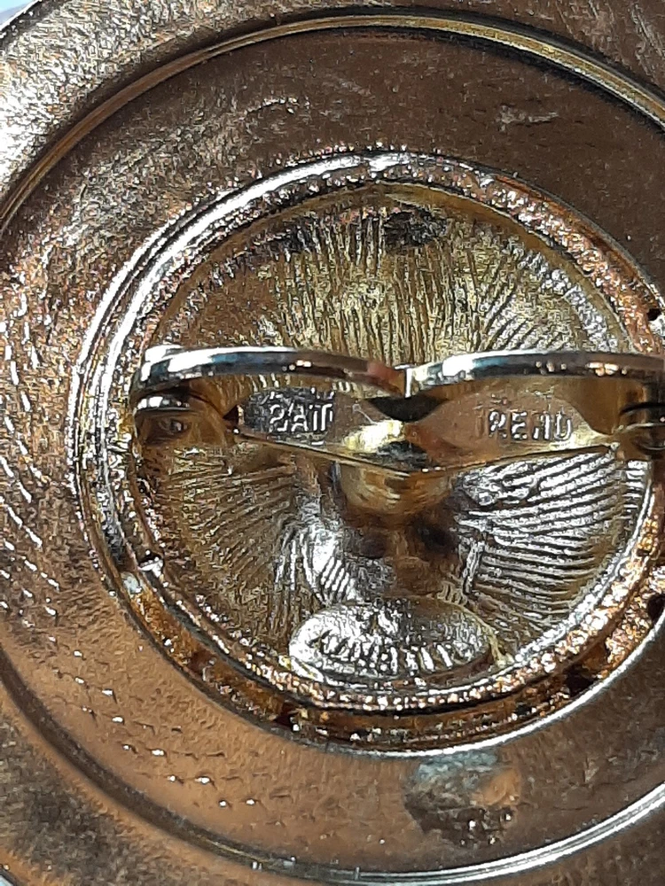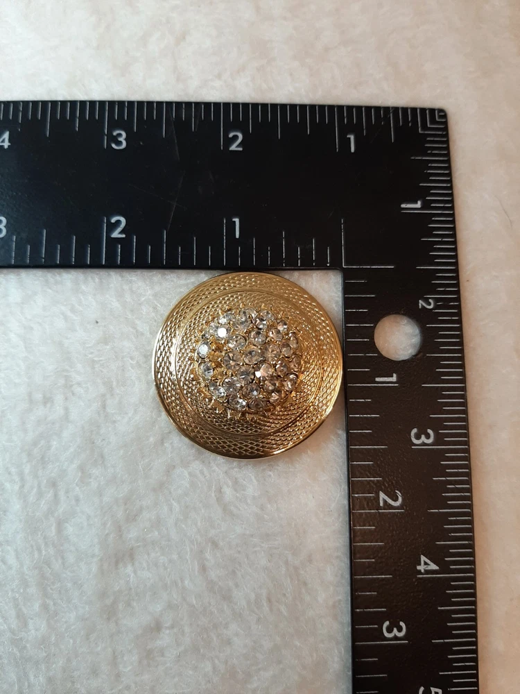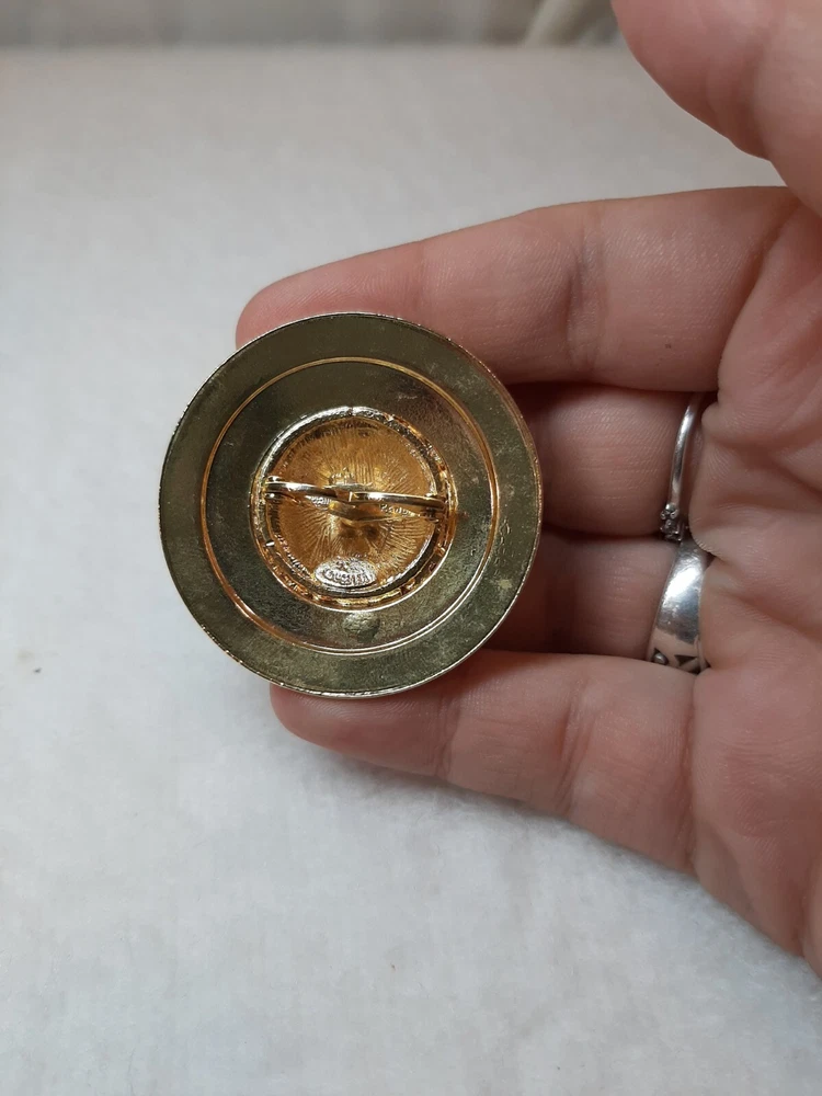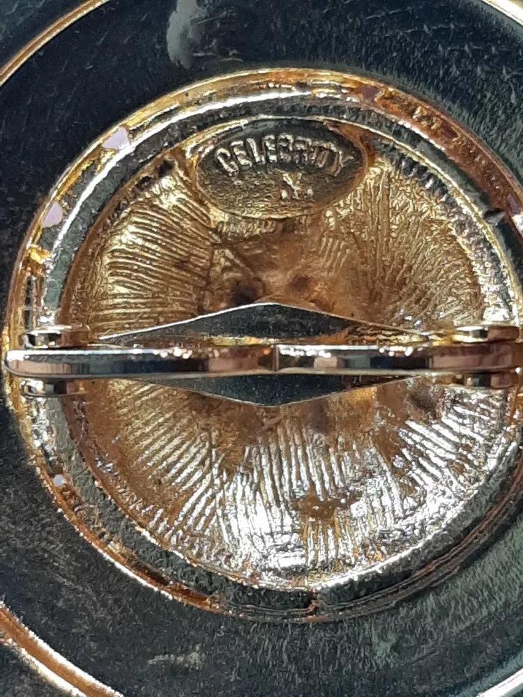 Celebrity V Gold Tone Pin Brooch Round Texture Raised Faux Stones Signed Vintage In good pre-owned condition may show signs of wear from use/handling/storage/display. Please view all pics for condition/details/flaws/issues. SOLD AS IS There is/maybe marks/spots/dirt/debris please see photos 1-5, there is/maybe paint loss/sticker loss please see photos 1-5, there is lite discoloration please see photos 1-5, there are surface scratches to item please see photos 1-5, please see all photos for condition/issues/details.