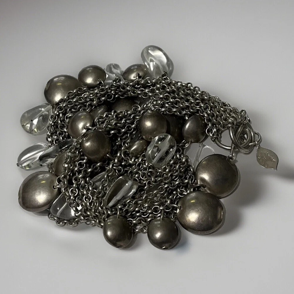 Elevate your jewelry collection with this stunning multi-strand beaded necklace from Celia Landman. Crafted with clear glass and sterling silver beads, this necklace is perfect for any occasion, whether it's a wedding, graduation, or simply a special day. Measuring at 16 inches in length, the necklace features a toggle closure and is signed by the talented designer herself. The elegant and timeless design of this necklace makes it a great choice for a gift or for yourself. Toggle Clasp Hangtag Signed Sterling Celia Landman Weight Approximately-124 DWT -6 OZT