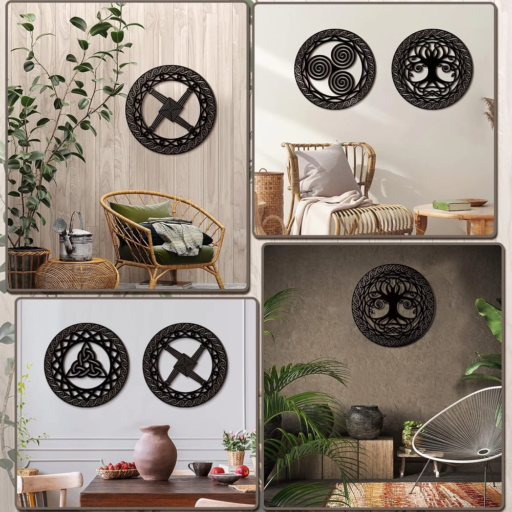 Proper Size: each sacred geometry wall art measures approx. 11.8 x 11.8 x 0.2 inches, proper in size and light in weight, will not take up too much space; The elegant wall decors can add warm atmosphere to your home Novel and Exquisite Design: these wood wall arts adopt Celtic symbols design, which is widely regarded as one of the oldest surviving Irish symbols, look novel and exquisite, these laser cut geometric patterns can better attract people's attention Reliable and Long Lasting: the wooden wall art decor is made of wood material with smooth surface and fine workmanship, tear and wear resistant, the classic color can also match well with any interior style Suitable for Many Occasions: you can use the Celtic wall arts to decorate your kitchen, living room, bedroom, bathroom, office, coffee shop and more, you can also hang them on the wall, door, window or fireplace; These wall art decors can add elegance to your room Meet Your Decorative Needs: this package comes with 4 pieces Celtic wall decors in 4 styles, the quantities and styles are sufficient that can better meet your home decorative needs; You can also share them with your close friends Features: Housewarming gifts: You can apply the wooden Celtic decors as housewarming gifts to send to your friends, neighbors, relatives or colleagues, people will feel happy after receiving them. Match well with other decors: Our Celtic decor wall art applies classic and delicate, can also match well with other decors in your home and leave a deeper impression on guests. Specifications: Material: wood Color: as shown Size: approx. 11.8 x 11.8 x 0.2 inch Package includes: 4 x Celtic wooden wall decors Notes: Manual measurement, please allow slight errors on size. The color may exist a slight difference due to different screen displays.