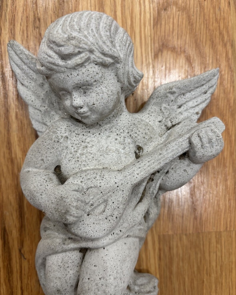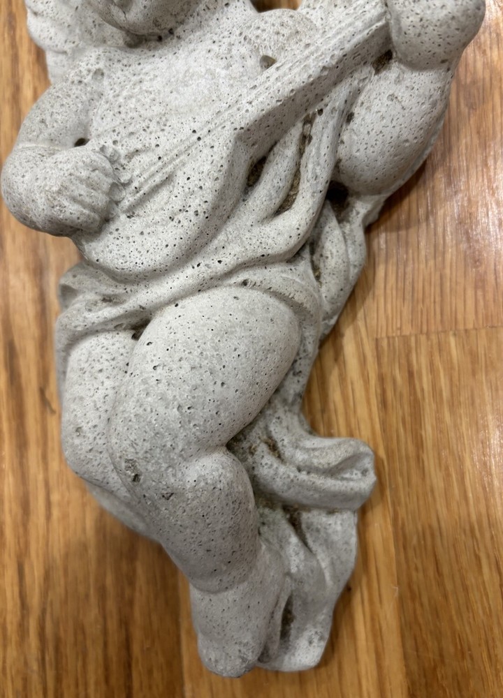 Vintage garden cement angel wall hanging. The angel measures approximately 8 1/2” by 5”. There is a hook for hanging. There are small areas that show wear like on the tips of the wings and small places on the body. Preowned. Good condition for age.