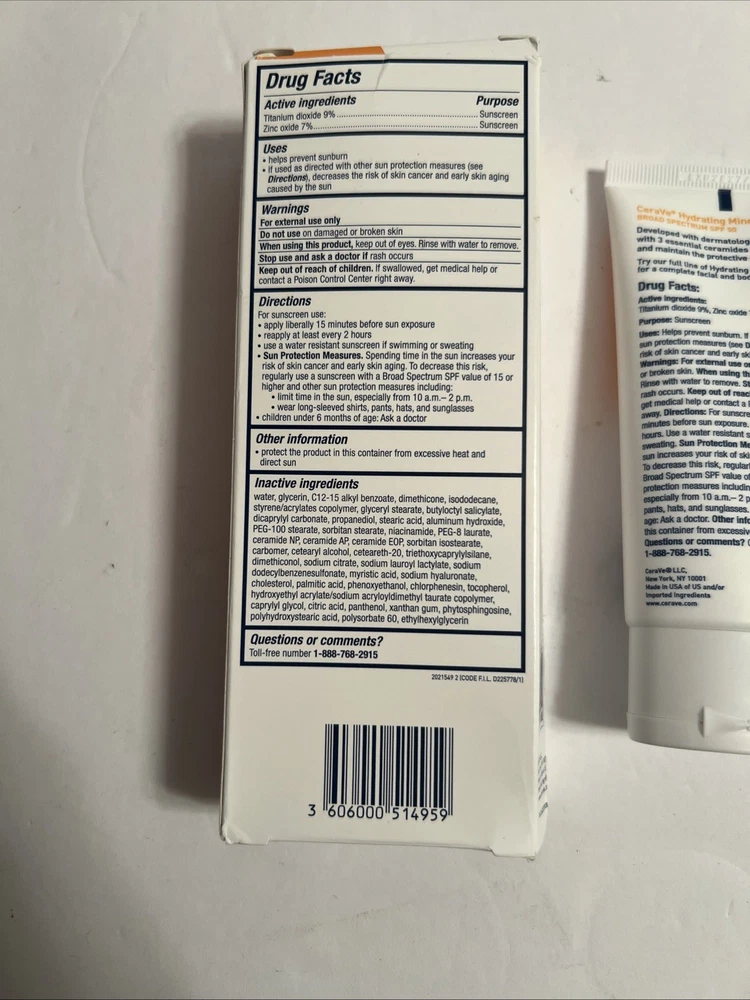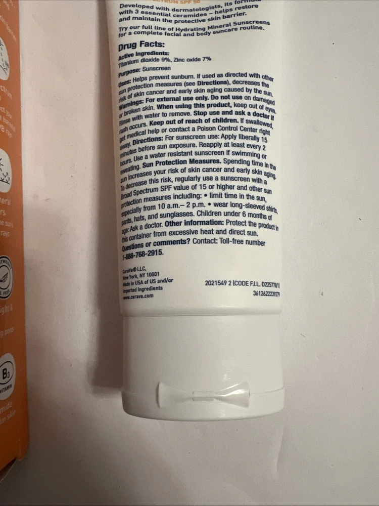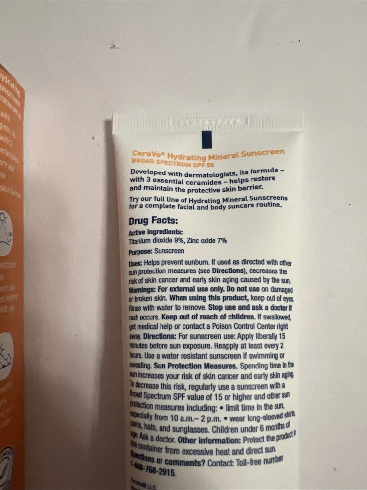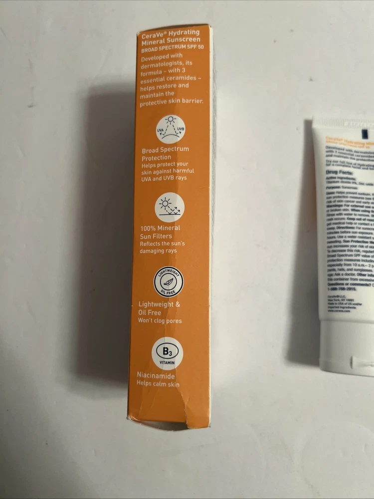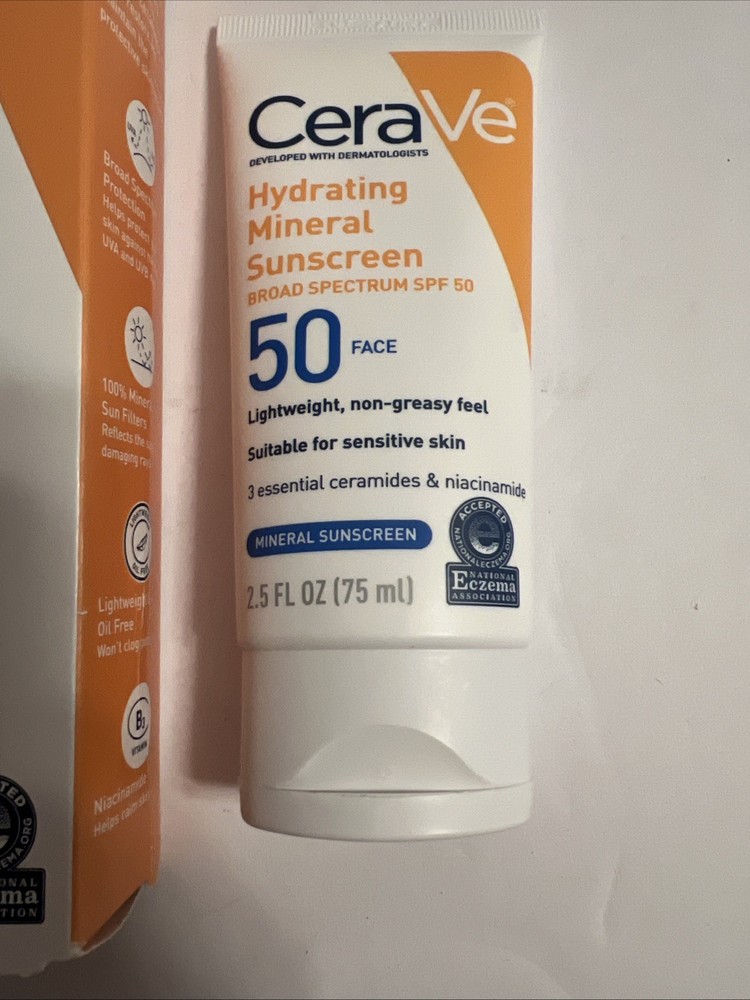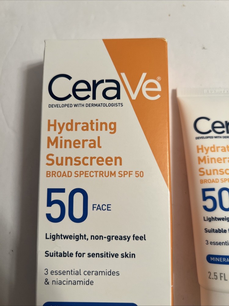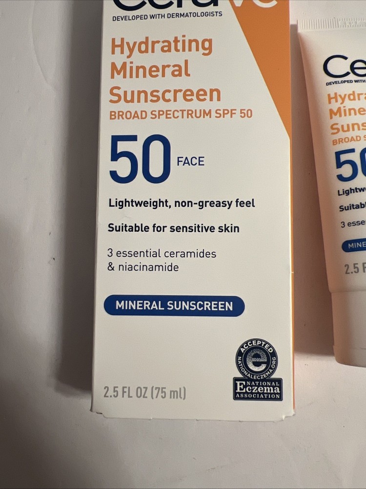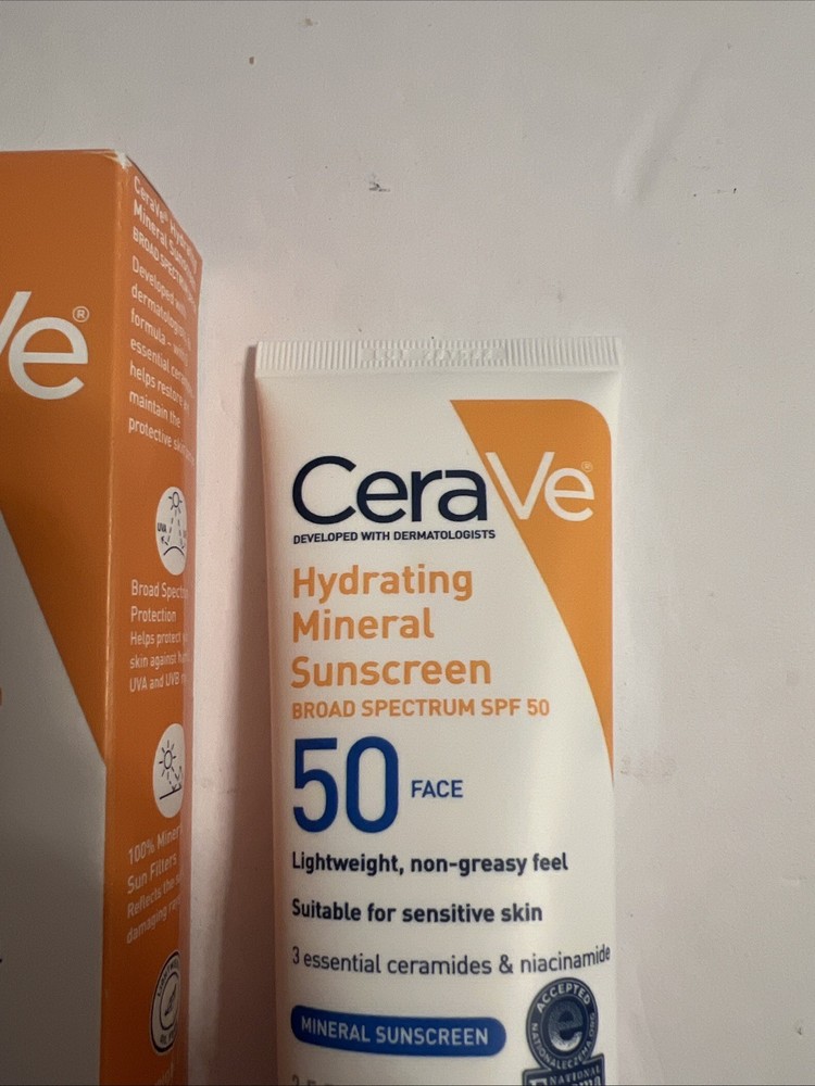 CERAVE DEVELOPED WITH DERMATOLOGISTS HYDRATING MINERAL SUNSCREEN BROAD SPECTRUM SPF 50 FACE LIGHTWEIGHT, NON-GREASY FEEL SUITABLE FOR SENSITIVE SKIN 3 ESSENTIAL CERAMIDES & NIACINAMIDE (VITAMIN B3) HELPS CALM SKIN MINERAL SUNSCREEN 1 TUBE WITH FLIP-TOP CAP 2.5 FL OZ (75 mL) EXPIRE: 12/2026