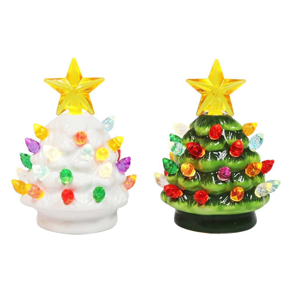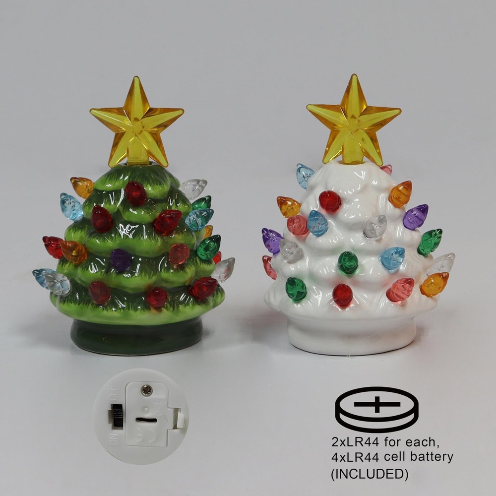 Bring timeless holiday charm into your home with the 2-Piece 3.5”H LED Ceramic Mini Christmas Tree Set a delightful blend of vintage style, modern LED lighting, and compact design. These mini ceramic Christmas trees capture the nostalgic beauty of the classic vintage ceramic Christmas tree, now reimagined in a smaller size perfect for any tabletop or holiday display. Each tabletop ceramic Christmas tree is crafted from durable, high-quality ceramic and finished with a glossy glaze for a brilliant shine. The set includes two prelit trees one in traditional green and one in elegant white each decorated with colorful LED bulbs and topped with a radiant golden star. The vibrant multicolor LED lights illuminate beautifully, filling your space with a warm, festive glow that instantly brightens any room. Designed for convenience, these battery operated ceramic Christmas trees are completely cordless, allowing you to place them anywhere on mantels, bookshelves, windowsills, dining tables, office desks, or bedroom nightstands. Each tree comes with a cell battery included, so your decoration is ready to shine right out of the box. With their energy-efficient LED light-up design, these trees add cheerful ambiance without the hassle of cords or outlets. Standing at approximately 3.54" x 2.55" x 2.55", these small ceramic Christmas trees are the perfect size for compact spaces, apartments, dorm rooms, or offices. Their classic vintage appearance complements any Christmas theme from traditional red and green décor to modern minimalist styles. Whether you’re looking for a charming tabletop Christmas tree, a nostalgic retro ceramic Christmas decoration, or a thoughtful gift for loved ones, the LED Mini Ceramic Christmas Tree Set is a must-have for the holiday season. Celebrate the magic of Christmas year after year with these adorable, long-lasting, and beautifully illuminated keepsakes. Key Features Set of 2 LED Mini Ceramic Christmas Trees (Green & White) Prelit with Colorful LED Bulbs and Golden Star Topper Battery Operated – Cell Battery Included (No Cords Needed) Compact Size: 3.54" x 2.55" x 2.55" – Ideal for Small Spaces Durable Ceramic Construction with Glossy Glazed Finish Perfect for Tabletop, Mantel, Shelf, or Office Holiday Décor Light Up Feature: The tree has built-in lights that illuminate the branches for a beautiful display. Ceramic Construction: Crafted from durable ceramic material for long-lasting use. Compact Size: Miniature tree stands just 12 inches tall making it perfect for small spaces. Easy Assembly: The tree comes fully assembled so you can set it up right out of the box.