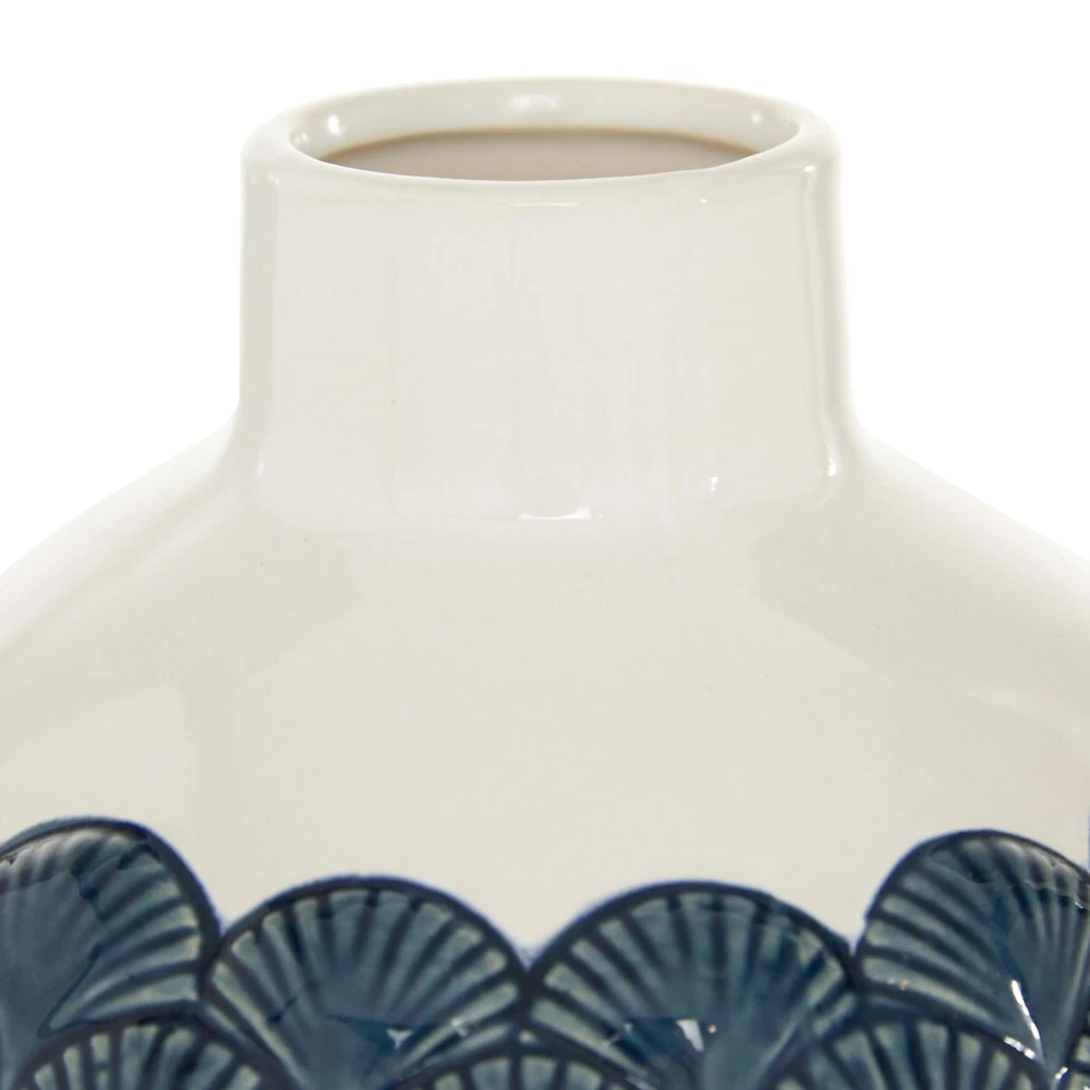 Each coastal vase for home decor is molded from stoneware, showcasing the beauty of its materials. The polished blue vase for flowers is round with shell patterns. Wipe clean with a dry cloth. The blue centerpiece vase is perfect for adding a coastal touch to any room, whether it's the living room or bathroom. Designed with felt or rubber stoppers at the base that prevent scratching furniture and table tops, as well as sliding around. This item ships in 1 carton. Suitable for indoor use only. This item ships fully assembled in piece. This is a single blue colored vase. Coastal style. Vase has a 3 in mouth opening. COASTAL HOME DÉCOR VASE: Inspired by blissful and the allure of the sea, where soothing hues and natural textures bring effortless charm to the home CERAMIC VASE FOR CENTERPIECE: This blue decorative vase is made from high-quality stoneware BLUE AND WHITE VASE FOR FLOWERS: The round home decor vase features a polished blue and white finish with intricate shell designs ROUND VASE FOR HOME DÉCOR: The stoneware vase boasts detailed craftsmanship and a glossy surface, perfect for adding a coastal and elegant touch to your decor SMALL SIZE FLOWER VASE CENTERPIECE: The blue ceramic vase measures 8.4L x 8.4W x 8.6H inches, and weighs 2.79 lbs