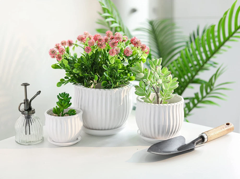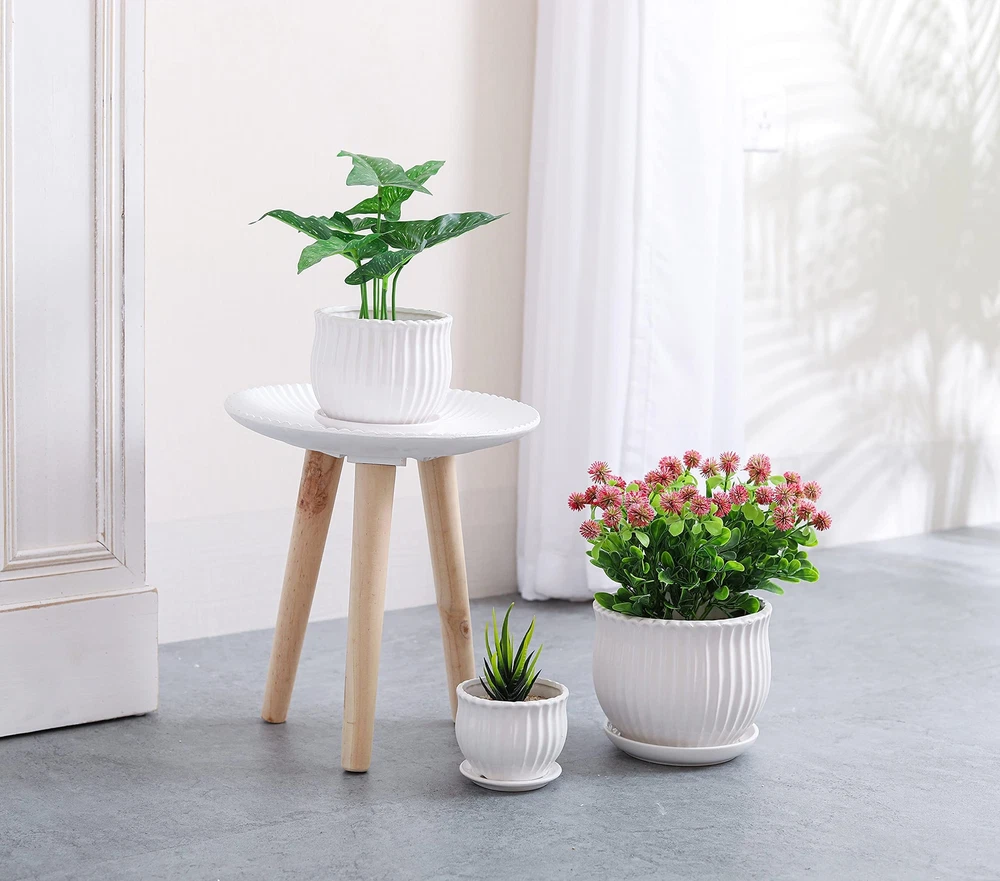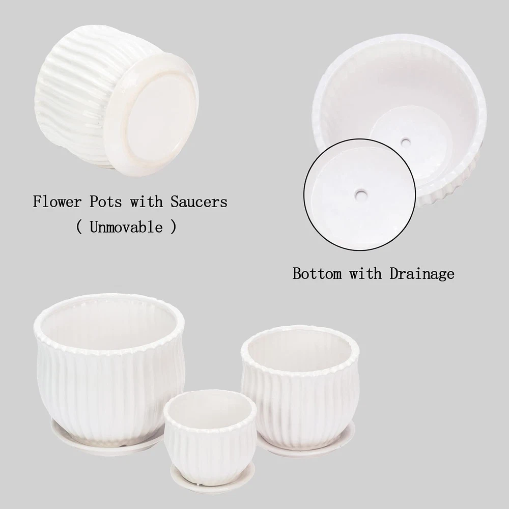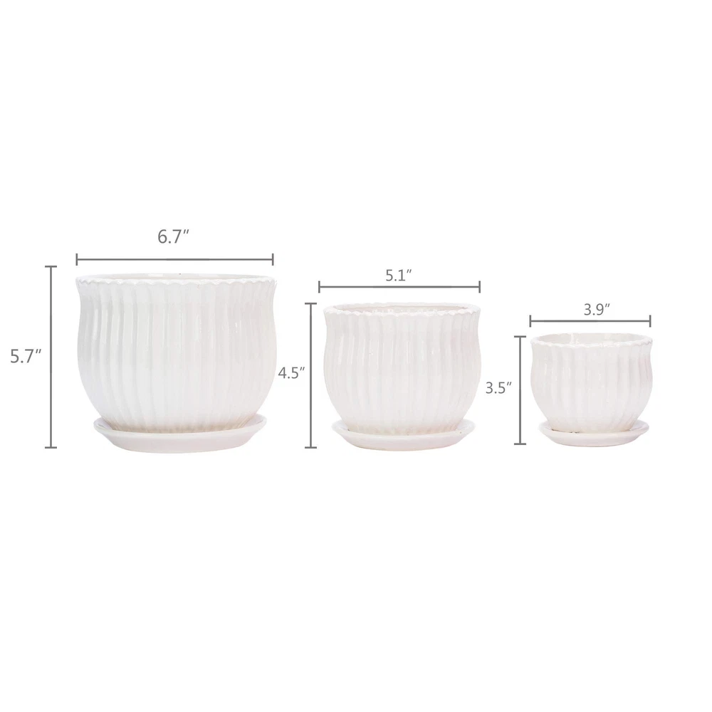 Ranging from small to medium sizes, this versatile contemporary style white ceramic flower plant pots set can be used to display your favorite succulents, flowers, cactus. Each vase contains a small hole in the bottom for drainage, keeps your plants and flowers stylish and healthy. Ranging from small to medium sizes, this classical white ceramic planter set can display your favorite succulents, flowers, cactus, orchid and much more Each modern planter contains a small hole in the bottom allows water to flow into the attached saucer, keeps your plants and flowers stylish and healthy. 3 flower pot set design is a nice match for both indoor and outdoor plants Using top quality ceramic material makes the flower plant pots pure white and stain resistance Approx. Dimensions: Large pot - 6.7Dia X 5.7H inches; Medium Pot - 5.1Dia X 4.5H; Small pot - 3.9Dia X 3.4H
