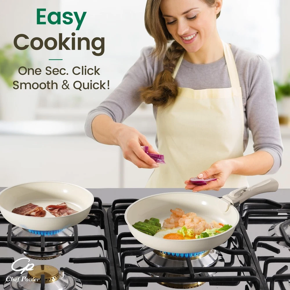 The ceramic cookware set includes 1 deep sauté pan, 2 saucepans, 2 frying pans, 2 detachable handles, 3 silicone lids, 3 silicone utensils, 4 pot protectors, and 2 sealing lids. This cookware set features a healthy ceramic non-stick coating inside and out, free of toxic PFAS, PFOA, and PTFE. It is easy to clean and dishwasher safe. The set is compatible with all stove types, including electric, induction, gas, and ceramic, as well as ovens and broilers (up to 550°F). With its stylish design and flexible removable handles, the ceramic cookware set is not just limited to cookware—it can also be used as bakeware, tableware, and storageware. Additionally, this set offers a solution to storage issues, with a stacked size as compact as 13 x 12 x 8 inches, reducing space by up to 70%. Storage Solution – The removable cookware set makes kitchen storage simple. When stacked, it measures only 13 x 12 x 8 inches, reducing space usage by up to 70%. Healthy Ceramic Nonstick – ’s ceramic coating, made from natural rock, is Teflon-free and free of PFAS, PTFE, PFOA, lead, and cadmium. Compatible with All Stoves – The cookware is suitable for induction, gas, electric, and ceramic stoves, and it is oven-safe up to 550°F. The silicone lids are oven-safe up to 350°F, and the sealing lids can withstand temperatures from 170°F down to -100°F. Easy to Clean – The double-sided ceramic nonstick coating on the pans and pots makes cleaning easy, and the set is dishwasher-safe. Multi-Functional Set – This set meets multiple needs; it can be used as tableware, a grill pan, and can be stored in the refrigerator with the lids on. 19-Piece Cookware Set Includes – 1.5 QT saucepan, 3.2 QT saucepan, 3.4 QT stockpot, 9” frying pan, 11” frying pan, 6”, 8”, and 10” silicone lids, 6”, 8” sealing lids, two detachable handles, a silicone slotted turner, a silicone ladle, a silicone locking tong, and four pot protectors.