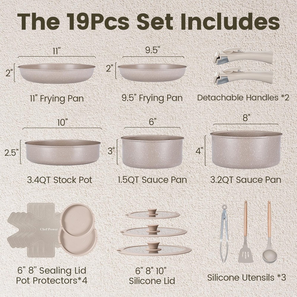 This set includes 1 deep sauté pan, 2 saucepans, 2 frying pans, 2 detachable handles, 3 silicone lids, 3 silicone utensils,4 pot protectors and 2 sealing lids for convenient storage. Optimal storage and easy stacking with the handles off saves up to 70% more space of detachable handle pots and pans Set. Our cookware set can be used in the oven up to 842 degrees. These ceramic nonstick pots and pans work on all types of stoves: electric, induction, fire, gas and ceramic stoves. After all the cooking is done, place cookware set in the dishwasher for quick and easy cleanup. Easy To Store - removable cookware set makes kitchen storage simple, easy to stack and saves 70% space. Easy To Clean - pans and pots set is designed with ceramic nonstick throughout, support dishwasher and handwash. All Stoves Available - Cookwares support induction, gas, electric, ceramic and oven safe up to 550°F. Silicone lids oven safe up to 350°F. Sealing lids up to 170°F down to -100°F. Multi-Functional Set - One set solves multiple needs, can be used as tableware and grill pan, and can be stored in the refrigerator with the lid on. 19 Pcs Cookware Set Includes- 1.5 QT SAUCEPAN, 3.2 QT SAUCEPAN, 3.4 QT STOCK POT, 9” FRYING PAN, 11” FRYING PAN, 6”-8”-10” SILICONE LIDS, DETACHABLE HANDLE* 2, SILICONE SLOTTED TURNER, SILICONE LADLE, SILICONE LOCKING TONG, POT PROTECTORS*4