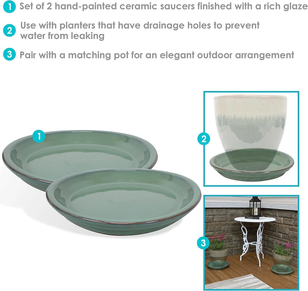 Store New Arrivals Add to Favorite View Feedback Contact Ceramic Outdoor Flower Pot Saucers Set of 2 - UV- and Frost-Resistant - Seafoam Glazed Finish - 9-Inch Description Style Contemporary Pattern Solid Material Type Ceramic Theme Vegetable Finish Types Glazed Paint Is the item dishwasher safe? Yes Material Ceramic Seasons All Seasons Additional Features Weather Resistant Included Components Saucer Item Weight 4 Pounds Special Feature Weather Resistant Color Seafoam Material Features Weather Resistant Global Trade Identification Number 00810011717299 Shape Round Is the item microwaveable? Yes Manufacturer Decor Net Content Weight 1.81 Kilograms Style Name Contemporary Size 9 in Fits 9" planters: These planter plates have a 11.75" outer diameter (9.25" inner diameter) and a 1.75" H outer edge (1" H inner edge). Each saucer weighs 4 lbs. Designed for beauty and strength: These ceramic planter dishes are hand-painted with a rich, glazed finish and placed in a kiln for classic, shining beauty. Please note, variations in color may occur due to manual glazing and the unique kiln firing process. Includes 2 saucers: Use these plant drip trays indoors or outdoors with favorite planters. Prevent planter drainage hole leaks: Place each saucer beneath a planter with drainage holes to prevent soil and water from leaking onto the floor and other surfaces. Worry-free purchasing: Sunnydaze Decor backs its products with a 1-year manufacturer's warranty. Product Description Protect Your Floors Add a touch of style to your planters with these elegant ceramic saucers This round hand-painted glazed ceramic saucer tray is a great tool to use with planters that have drainage holes to prevent water from leaking all over the floor, ground or other surfaces. It features vibrant color selections and has a raised edge to collect excess water and soil spillage. Use them in the house, on the patio, deck, or porch. Available in 6 Stylish Colors Imperial Blue Gray Forest Lake Green Seafoam Pearl Obsidian Indoor or Outdoor Use These stylish planters can be used in a variety of places, including the patio, front porch, sunroom, or entryway. Elegant Glazed Finish Each planter features a shiny glazed finish in vibrant shades for a unique eye-catching look. For Use with a Variety of Planters These planter saucers come in sets of two and are available in three sizes to accommodate many types of planters. ABOUT US We offer the best prices around on high quality products. Our E-store includes media such as books, movies, music and games while offering electronics, toys, sporting apparel, clothing, tools, general home, garden items and more. SHIPPING We are always working hard to ensure your package arrives as soon as possible. Please understand that some factors like weather, high postal traffic, and the performance of shipping companies are outside of our control. We offer free shipping to the lower 48 states and ship within 2 business days of payment, usually sooner. We do not accept P.O. Boxes. Please provide a physical address. For shipping outside of the continental USA, we only use eBay's Global Shipping Program.The item is shipped to KY and then sent to the rest of the world. International customers are responsible for all duties and taxes. Continue to check out in order to calculate costs for shipping the item to your country. Messages regarding eBay's Global Shipping Program MUST be directed at eBay EXCLUSIVELY. RETURNS We offer a 30-Day Return Policy on items which you are not completely satisfied with. You have the option for a full-refund or an exchange of the item. No returns are available on items shipped outside of the USA. PAYMENT We accept PayPal. CONTACT US This page content is yet to come Please ad us to your favorite seller and visit again later Thank You CUSTOMER SATISFACTION We try our very best to make sure every customer is completely satisfied. If there's a problem, message us! We're happy to help. WE ACCEPT Copyright © 2021 AutoDS. | All Rights Reserved