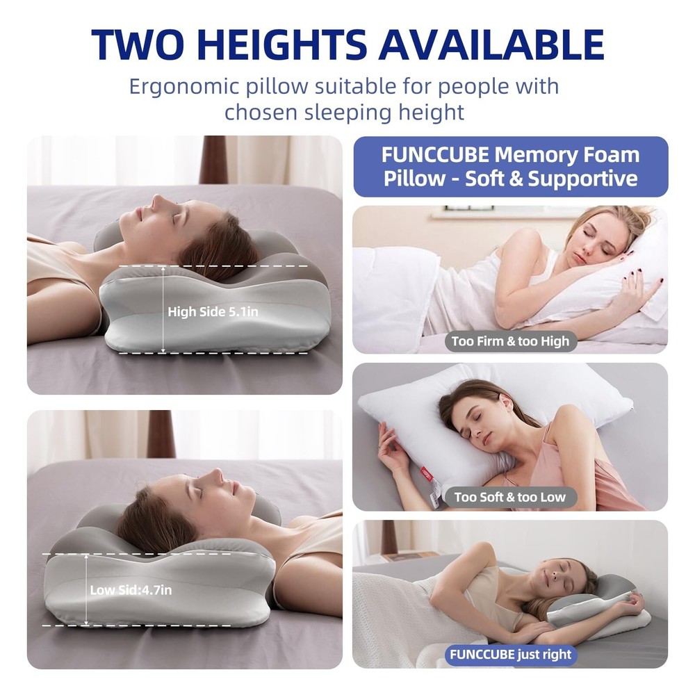 Cervical Neck Pillow - Memory Foam Pillows for Pain Relief Sleeping with Cooling Pillowcase, Ergonomic Contour Odorless Bed Pillow for Back Side Shoulder Stomach Sleeper, Queen Gray Product Details Size: Queen (U.S. Standard) Color: Queen Gray Brand: FUNCCUBE MPN: JH-1 UPC: 785856826942 EAN: 0785856826942 Brand: FUNCCUBE Special Feature: Cooling, Ergonomic, Adjustable, Washable, Breathable Color: Queen Gray Size: Queen (U.S. Standard) Fill Material: Memory Foam Brand: FUNCCUBE Special Feature: Cooling, Ergonomic, Adjustable, Washable, Breathable Color: Queen Gray Size: Queen (U.S. Standard) Fill Material: Memory Foam Shape: Butterfly Age Range (Description): Adult Recommended Uses For Product: Sleeping Use for: Stomach, Shoulder, Back, Neck, Arm Material: Polyester, Memory Foam Item Firmness Description: Firm Product Care Instructions: Machine Wash Number of Pieces: 1 Pattern: Solid Material Feature: Breathable Fabric Type: Memory Foam Model Name: JH UPC: 785856826942 Manufacturer: FUNCCUBE Product Dimensions: 15"L x 7"W Item Weight: 3.34 pounds Country of Origin: China Item model number: JH-1 Refill: Memory Foam Batteries required: No Memory Foam Enjoy Sleep Bliss: Embrace cozy with our FUNCCUBE cervical neck memory foam pillows for neck pain relief. The side sleeper pillow features an ergonomic design, our bed memory foam neck pillow for sleeping follows the natural curve of our body perfectly Sleep Your Way: Our versatile cervical neck ergonomic pillows are designed for all sleepers to suits their back, side, or stomach. The memory foam neck pillows for sleeping rest assured with our neck support pillows for CertiPUR-US and Oeko-Tex approved Ease Ear Pressure For Easy Sleep: Our memory foam pillow crafted to alleviate ear pressure.Ideal for side sleepers, cervical neck pillow helps you drift off into a peaceful slumber, say farewell to tossing and turning and embrace the comfort you deserve No More Hot Nights: The cervical neck bed pillowcases with zippers are made of breathable mesh ideally mold to our skin, avoiding night sweats and keep you dry all night. Stomach sleeping pillow with considered armrest groove take you sleep to next level Sleep Savior Redefined: The neck cervical support pillow for pain relief is made of premium material, odorless and breathable. Lying on the 5S slow rebound memory foam back pain pillow with cooling pillowcase make you feel like floating on clouds Easy Swap & Clean:This neck cervical memory foam ergonomic pillow cover is washable and removable zippers, Our contour neck pillows for sleeping with invisible smooth zipper is convenient for replacement and cleaning - just toss it in the washing machine Pillow Core: 100% Polyurethane, Inner Cover: 100% Polyester, Outerwear: 85% Nylon, 15% Spandex, 100% Polyester