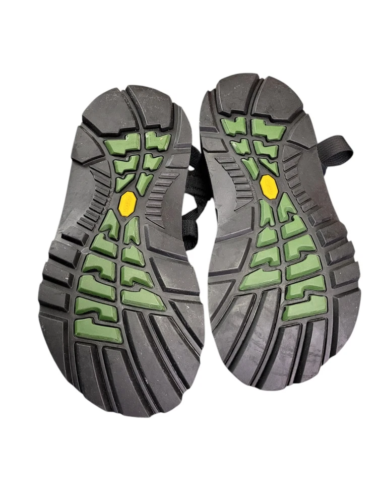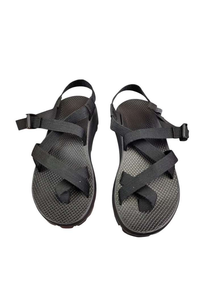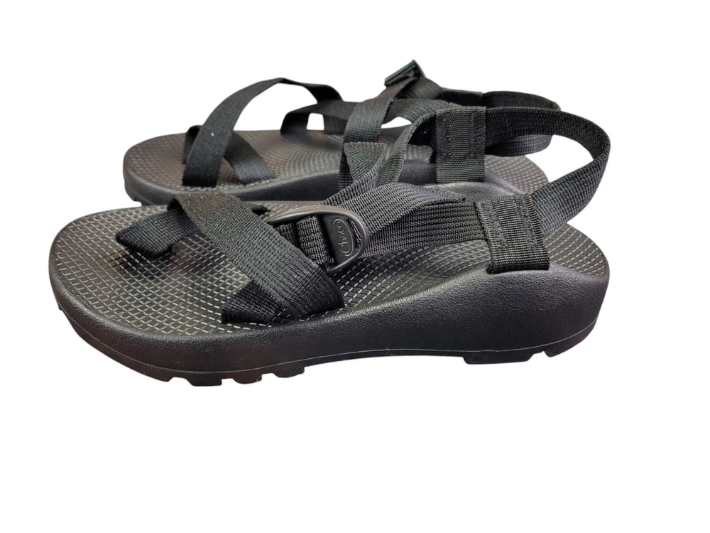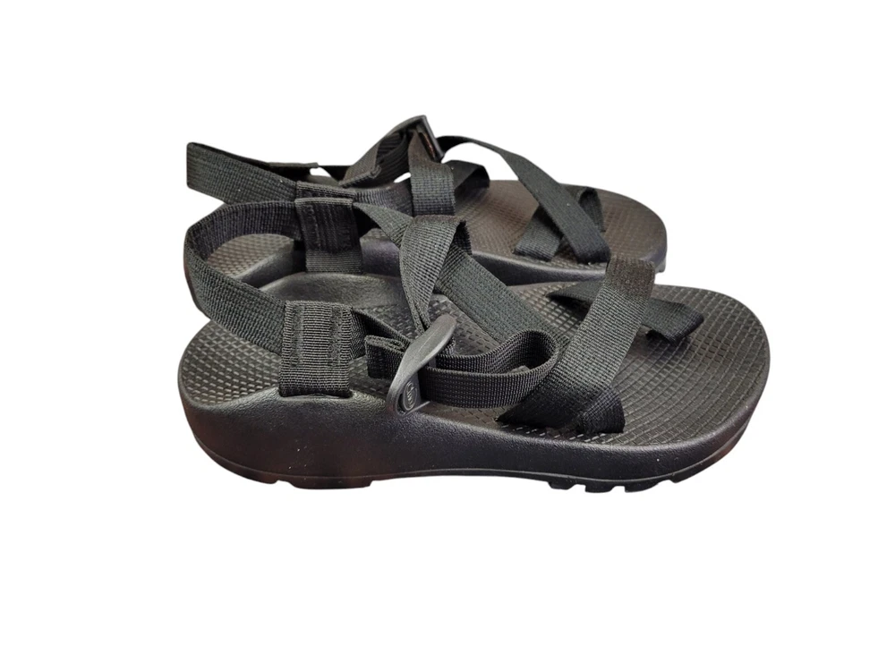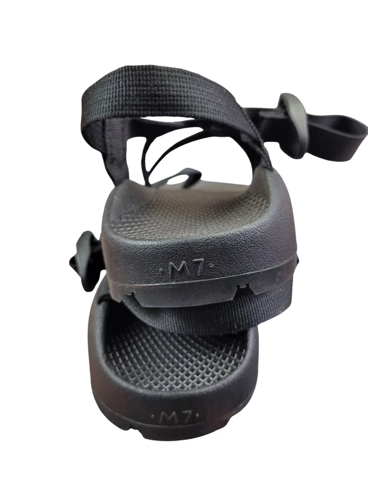 The Chaco Men's Size 7 Black Z/2 EcoTread Adjustable Sandals are a versatile footwear option for various occasions like travel, activewear, and casual wear. These slip-on sandals feature a solid black color with a buckle closure and adjustable strap for a secure fit. The outsole is made of rubber for durability, while the upper material is polyester with the Chaco logo accents. With a comfortable rubber insole and a size 7 medium width, these Chaco sandals are a practical choice for outdoor activities.