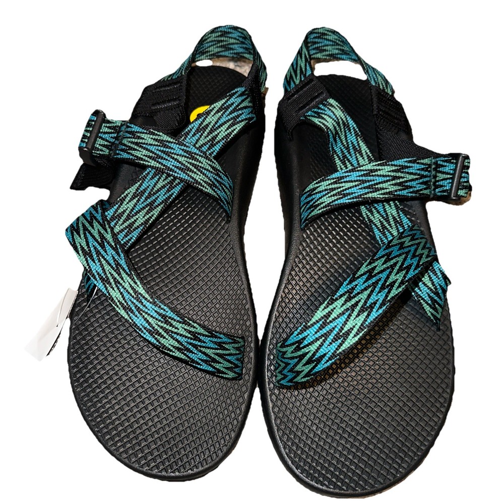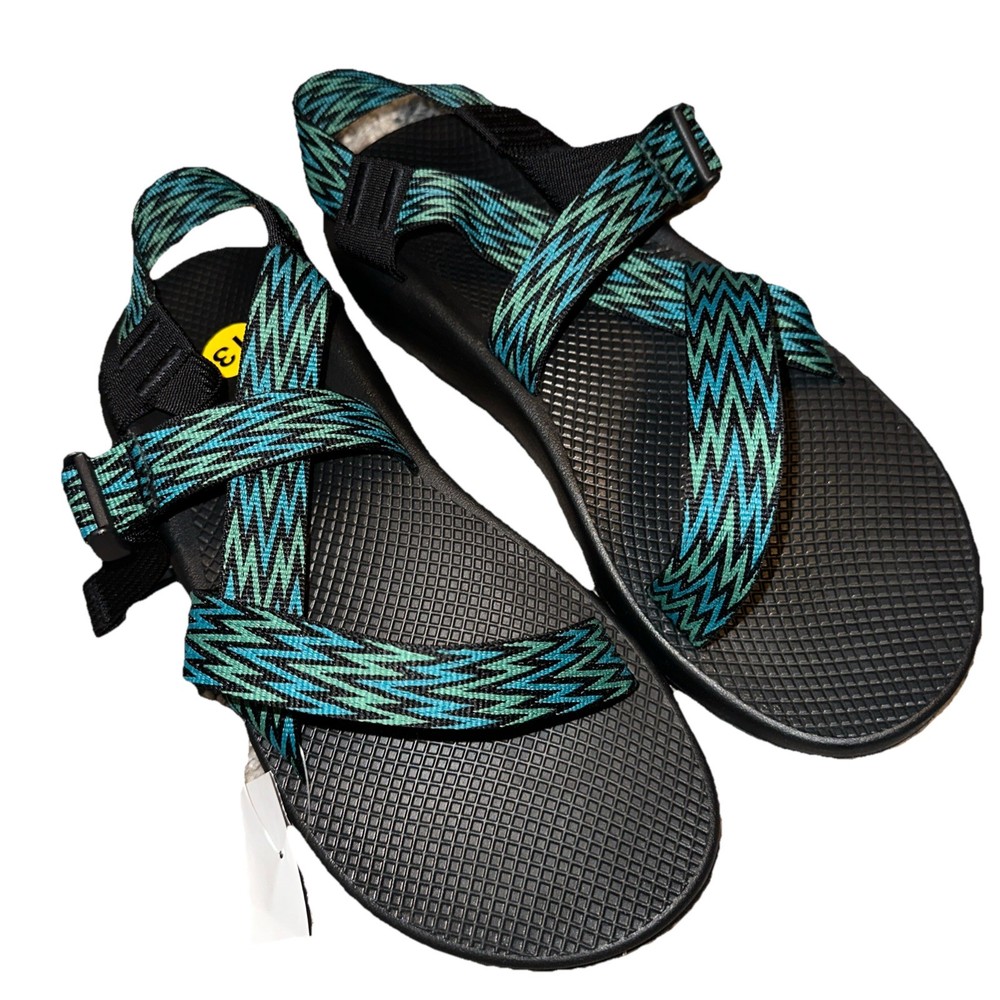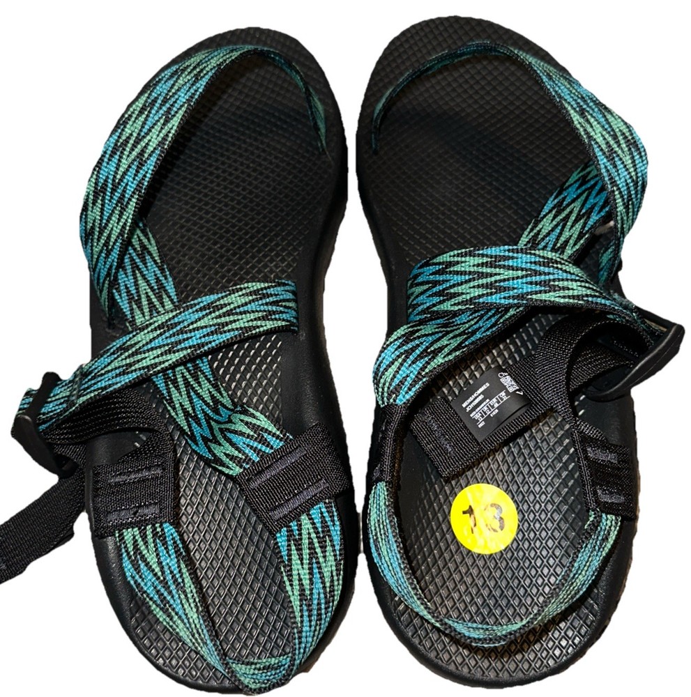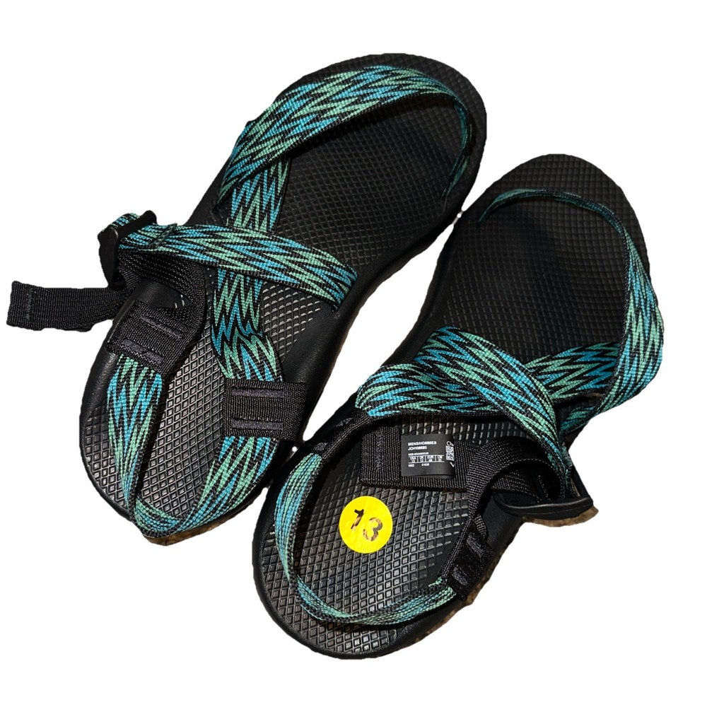 The Chaco JCH108685 Men's Strappy Green Black Blue Adjustable Hiking Sandals are a versatile and stylish option for outdoor activities and casual wear. Featuring a geometric blue pattern with the Chaco logo accent, these sandals are designed for comfort with arch support and an adjustable ankle strap. Made with a textile upper and a rubber outsole, they are perfect for summer, fall, and spring adventures. The strappy style and durable construction make these sandals a reliable choice for travel and active pursuits. Please check photos for more details. (Ref #14 green tub sandals/11)