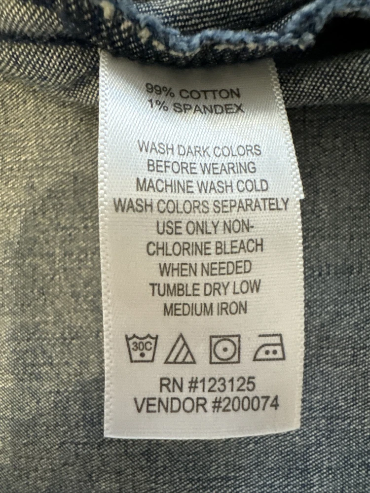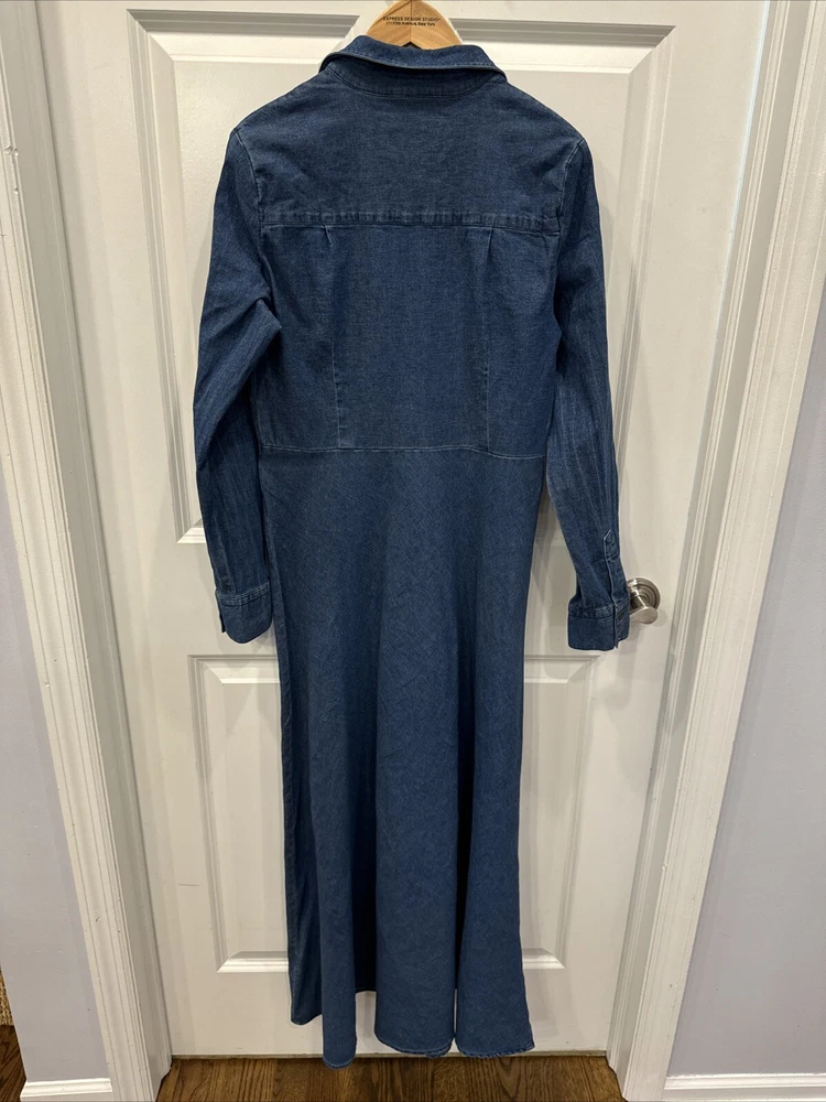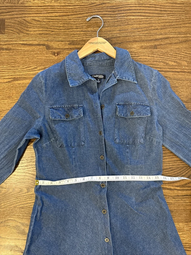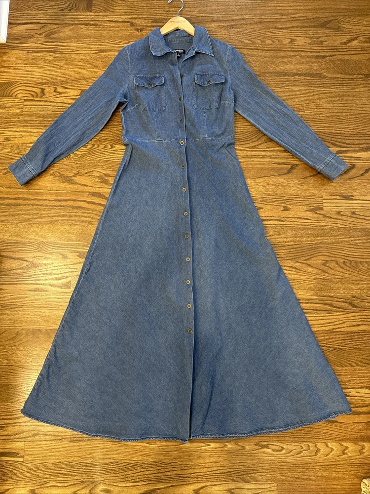 This Chadwicks of Boston blue denim dress is a timeless piece that will fit seamlessly into your wardrobe. The dress features a collared neckline, long sleeves, and a button front closure, making it suitable for a variety of occasions including travel, casual outings, and workwear. The dress is made of high-quality cotton material and has a solid pattern, making it a versatile addition to your wardrobe. The dress is a size 8 and has a long 54” length, perfect for any season including summer, fall, and spring. The dress has a Western, peasant, or 90s theme, adding a touch of uniqueness to your outfit. The skirt is cut on the bias. This shirt dress is a must-have for any fashion-forward woman and is sure to make a statement wherever you go.