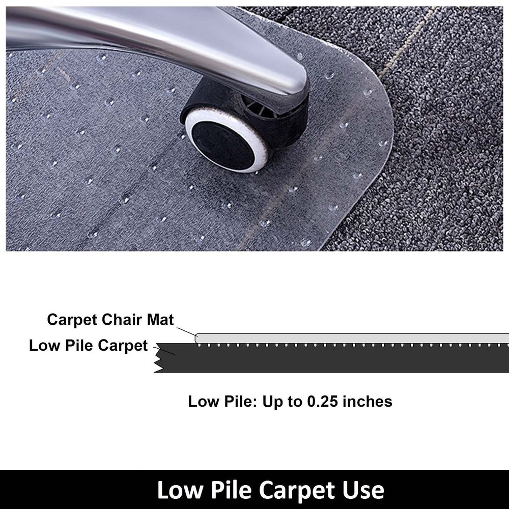 Office Chair Mat: our office floor mat is good for low pile carpet floors. It is ergonomically designed to allow effortless movement of office chair wheels, and provide good protection to your low pile carpet floor. Features: 1. The floor mat is BPA free and phthalate free for a healthy indoor environment. 2. The unique surface allows your office chair casters to move easily while carrying out daily tasks, but has enough grip to maintain controlled rolling so the chair doesn't skid around.3. the mat’s surface is strong and sturdy, so your chair’s wheels will easily glide across the mat, without scratching, sinking, or leaving indentations. How to use help: 1. Directly Unfolding the chair mat; 2. Turning it over and laying flat; 3. Rolling back; 4. Unfolding the mat. Put the studs face down. Specifications: 1. Material: polyvinyl chloride 2. Dimensions: (48 x 36 x 0.1)" (L x W x H) 3. The studs height: 1/6 inches 4. Weight: 6.8 pounds 5. Color: clear Package Includes: 1 x Office Carpet Chair Mat 1 x User Manual PERFECT FOR CARPET FLOORS: Protect your floor from scratches and dust of any kind with this perfect office floor mat for carpeted floors. The office chair mat is designed for low pile carpet floors. SAFE FOR YOUR HOME: The chair mat is no BPA & phthalate for a healthy indoor environment. It is 100% pure polyvinyl chloride chair mat. Rest assured you are buying a safe option for your home or office. SURFACE DURABILITY and FLEXIBILITY: The mat’s surface is super tough, so our office chair mat won’t be crack or shatter while protecting your office floor from damaging chair casters. Because of the mat’s strong, sturdy and solid surface, your chair’s wheels will easily glide across the mat, without scratching, sinking, or leaving indentations. The desk chair mat is also flexible and can be used a long time. EFFORTLESS ROLL and STABLE GRIP: The unique surface allows your office chair casters to move easily while carrying out daily tasks, but has enough grip to maintain controlled rolling so the chair doesn't skid around. Ease of rolling between tasks promotes ergonomic posture and helps to considerably reduce the risk of physical fatigue. BUY WITH CONFIDENCE: Each chair mat you purchase comes with a 100% 60 DAYS RETURN SERVICE. If you are not satisfied with your chair mat, us directly (even if outside the return window).