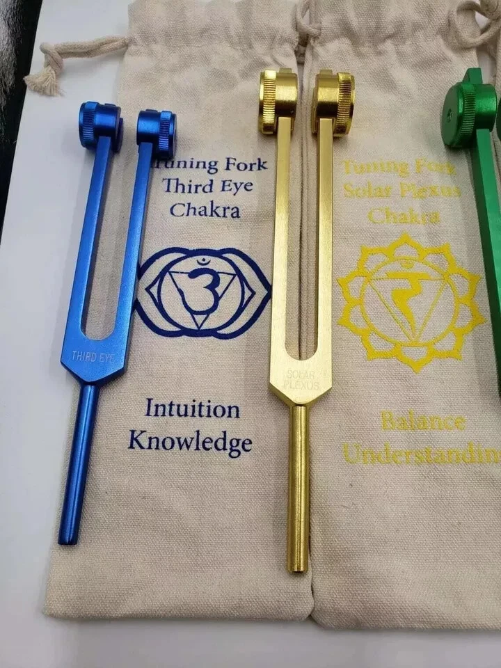 Description Welcome to a world of harmonic balance and energetic alignment. Introducing our Chakra Color Weighted Tuning Forks, a transformative set of tools for sound healing and chakra balancing. Each fork in this collection is carefully calibrated to resonate with the specific frequencies associated with the 9 chakras, allowing you to harness the power of sound to harmonize your mind, body, and spirit. The set includes 8 Chakra Weighted COLOR tuning forks Comes with a Mallet and individually marked Chakra signed Pouch for easy identification Let's explore the significance of each chakra and the transformative potential they hold: Root Chakra (Muladhara) - Located at the base of the spine, this chakra represents stability, grounding, and connection to the Earth. It governs our sense of security and survival instincts. Sacral Chakra (Svadhisthana) - Situated in the lower abdomen, this chakra is associated with creativity, passion, and emotional well-being. It guides our ability to experience pleasure and navigate our desires. Solar Plexus Chakra (Manipura) - Found in the upper abdomen, this chakra is associated with personal power, confidence, and willpower. It influences our self-esteem and ability to assert ourselves. Heart Chakra (Anahata) - Located in the center of the chest, this chakra governs love, compassion, and emotional healing. It guides our ability to give and receive love and fosters harmonious relationships. Throat Chakra (Vishuddha) - Situated at the throat, this chakra represents self-expression, communication, and authenticity. It empowers us to speak our truth and express ourselves creatively. Third Eye Chakra (Ajna) - Found between the eyebrows, this chakra is associated with intuition, clarity, and spiritual awareness. It enhances our inner vision and deepens our connection to our higher self. Crown Chakra (Sahasrara) - Located at the top of the head, this chakra symbolizes spiritual connection, enlightenment, and universal consciousness. It opens us to divine wisdom and spiritual transcendence. Soul Star Chakra (Transpersonal Chakra) - Positioned above the crown, this chakra connects us to higher realms, spiritual guides, and cosmic energies. It facilitates spiritual growth and enlightenment. Earth Star Chakra (Subpersonal Chakra) - Situated below the feet, this chakra anchors us to the Earth, providing a foundation for our physical and spiritual existence. It promotes stability and a sense of belonging. With our Chakra Color Weighted Tuning Forks, you'll receive not only a set of powerful instruments but also individually marked Chakra Bags and a mallet for each fork. Each bag is color-coded to correspond with a specific chakra, allowing you to easily identify and store your tuning forks in an organized and meaningful way. The mallet provided for each fork ensures that you can produce resonant and harmonious tones effortlessly. Crafted with precision and care, our tuning forks are weighted to deliver consistent and pure frequencies, promoting optimal healing and chakra alignment. The forks are made from high-quality materials to ensure durability and longevity, allowing you to incorporate sound healing practices into your daily routine for years to come. Whether you're a sound healing practitioner, energy worker, or simply someone on a path of self-discovery, our Chakra Color Weighted Tuning Forks provide a profound opportunity to harmonize your chakras, restore balance, and awaken your highest potential. Embrace the power of sound, color, and intention as you embark on a transformative journey of healing and self-realization. Note: The Chakra Color Weighted Tuning Forks set includes 9 forks, individually marked Chakra Bags, and a mallet for each fork. Used for: Chakra tuning forks Solfeggio tuning forks Energy healing tools Sound therapy instruments Chakra balancing set Vibrational healing Meditation accessories Spiritual healing tools Harmonic frequency forks Energetic alignment Chakra sound therapy Solfeggio frequency set Chakra tuning instruments Energy center alignment Healing sound vibrations Mind-body balance tools Vibrational medicine Chakra meditation aids Harmonizing energy tools Solfeggio sound healing