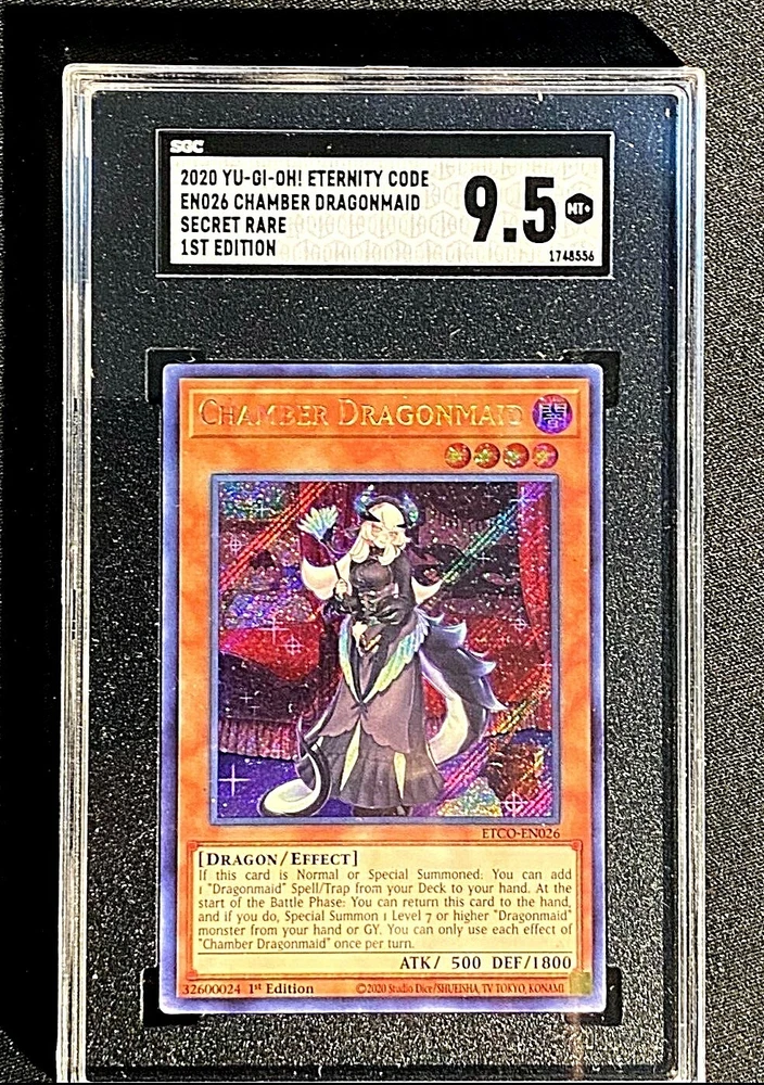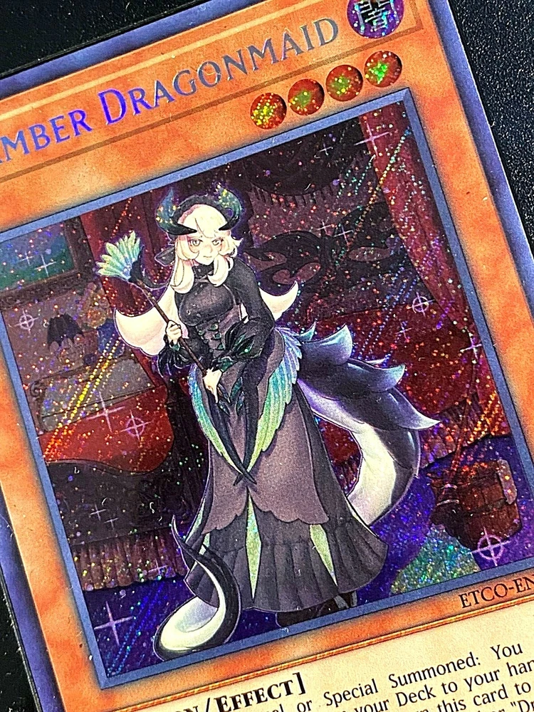 Level:4Language:EnglishDefense/Toughness:1800Creature/Monster Type:DragonCard Name:Chamber DragonmaidFeatures:1st EditionAttack/Power:500brand:KonamiGame:Yu-Gi-Oh! TCGSet:Eternity CodeManufacturer:KonamiAttribute/MTG:Color:DarkCard Type:EffectCard Number:ETCO-EN026Additional Description:Chamber DragonmaidRarity:Secret RareCard Text:If this card is Normal or Special Summoned: You can add 1 "Dragonmaid" Spell/Trap from your Deck to your hand. At the start of the Battle Phase: You can return this card to the hand, and if you do, Special Summon 1 Level 7 or higher "Dragonmaid" monster from your hand or GY. You can only use each effect of "Chamber Dragonmaid" once per turn.