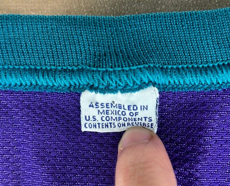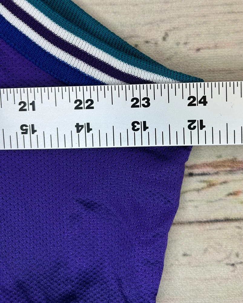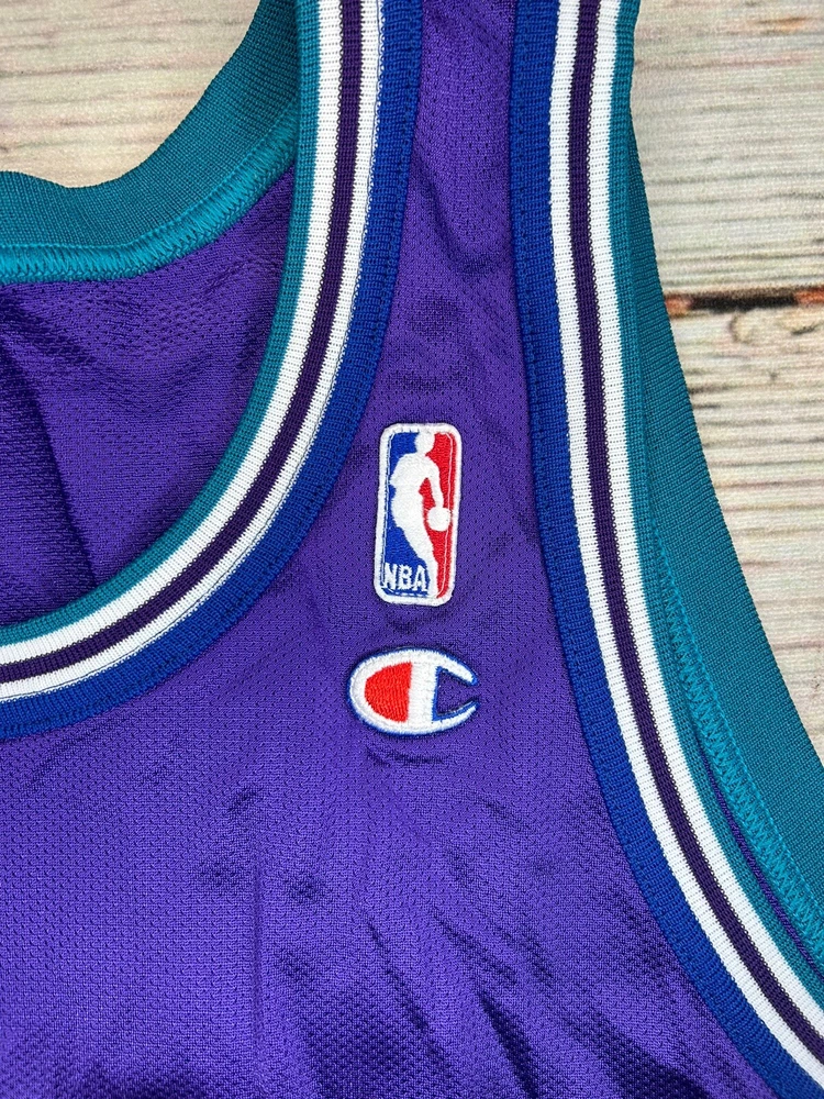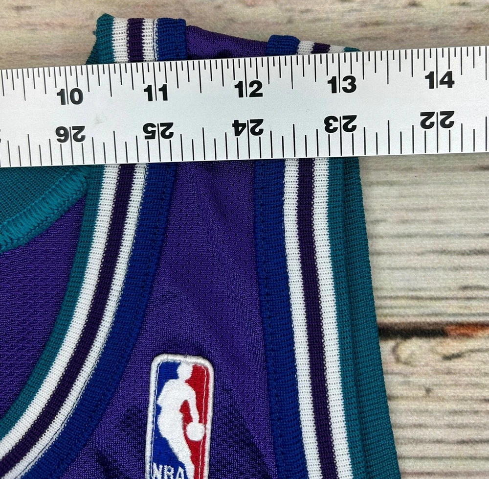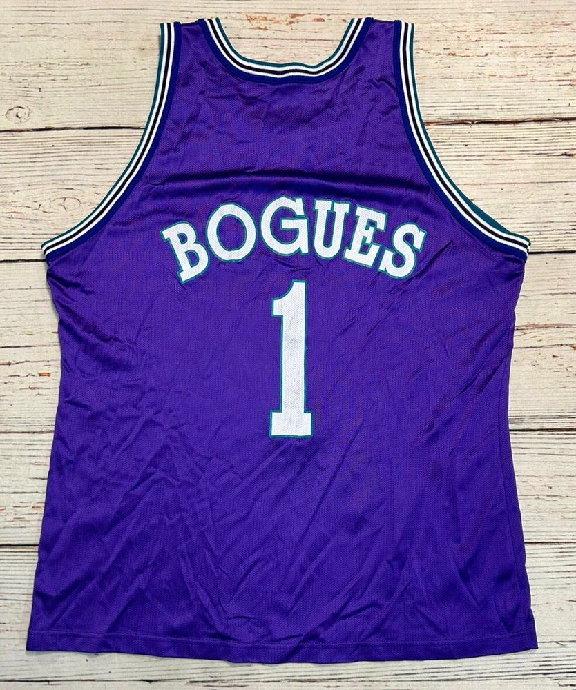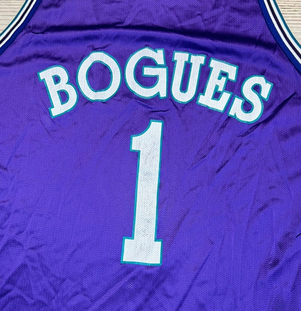 Show your love for the Charlotte Hornets with this officially licensed Champion NBA jersey. The jersey features Muggsy Bouges' name and number on the back, and is perfect for any basketball fan. The purple color and check pics for size ensure a comfortable and stylish fit. This jersey is perfect for men who want to show their support for the Charlotte Hornets during regular season games. It is made in Mexico and is a great addition to any fan apparel collection. Get yours today and check out the pictures to make sure it fits perfectly! Check pictures for condition and measurements for size.