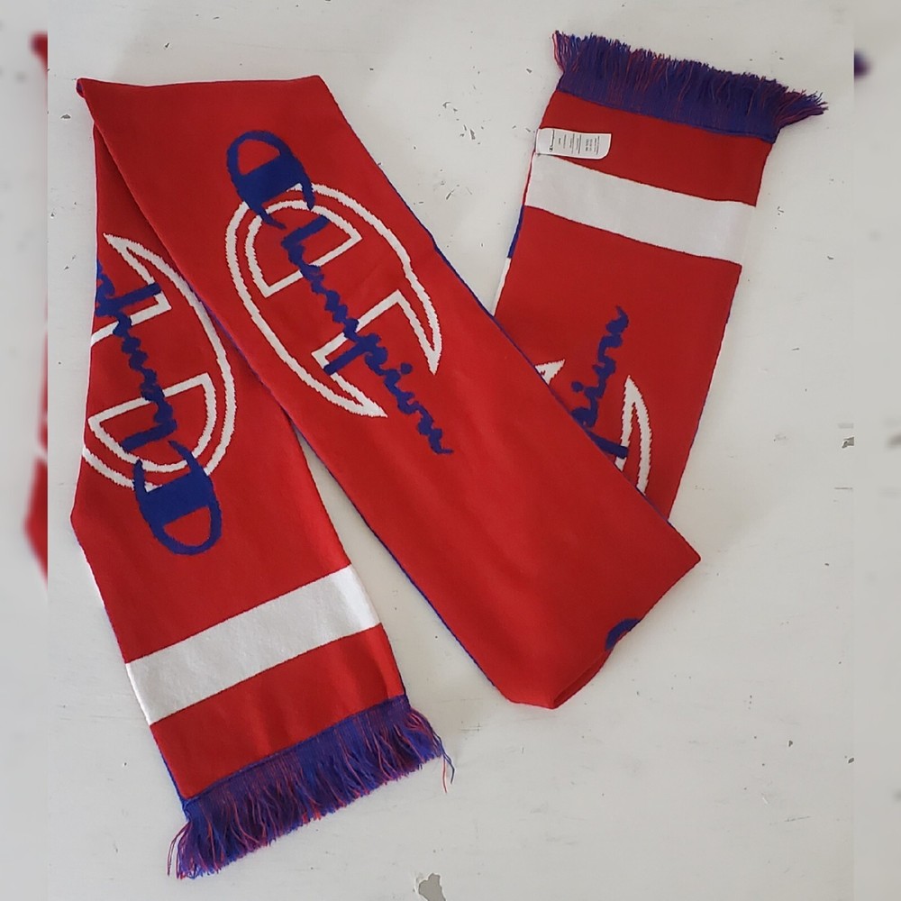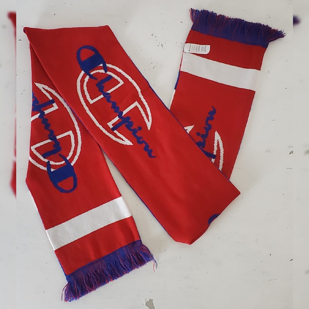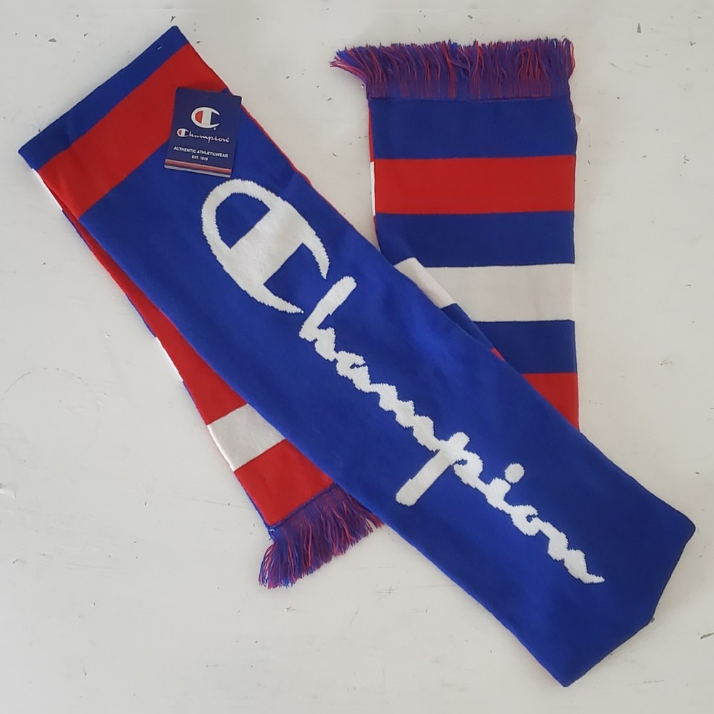 CHAMPION AUTHENTIC ATHLETICWEAR REVERSIBLE SCARF MEN'S LARGE SCRIPT LOGO ONESIZE BLUE/RED/WHITE. CONDITION IS NEW WITH TAGS.