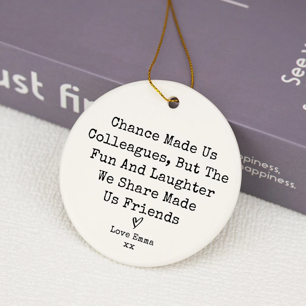 Chance Made Us Colleagues Ornament Coworker Ornament Friendship Gifts Colleague Gifts Leaving Gifts Retirement Gifts Best Friends Gifts Material: Ceramic Color: White Shapes: Circle, star, heart and oval Can be printed on both sides Imprint full-color artwork, photos, or logos Hole for hanging string and hanging string included Printed in the USA