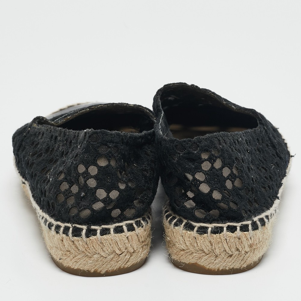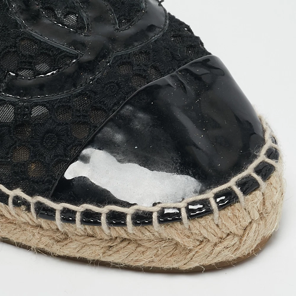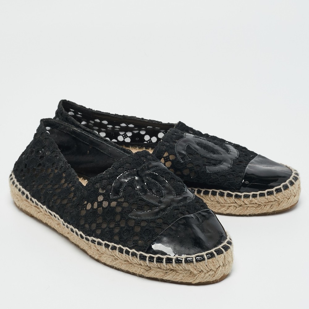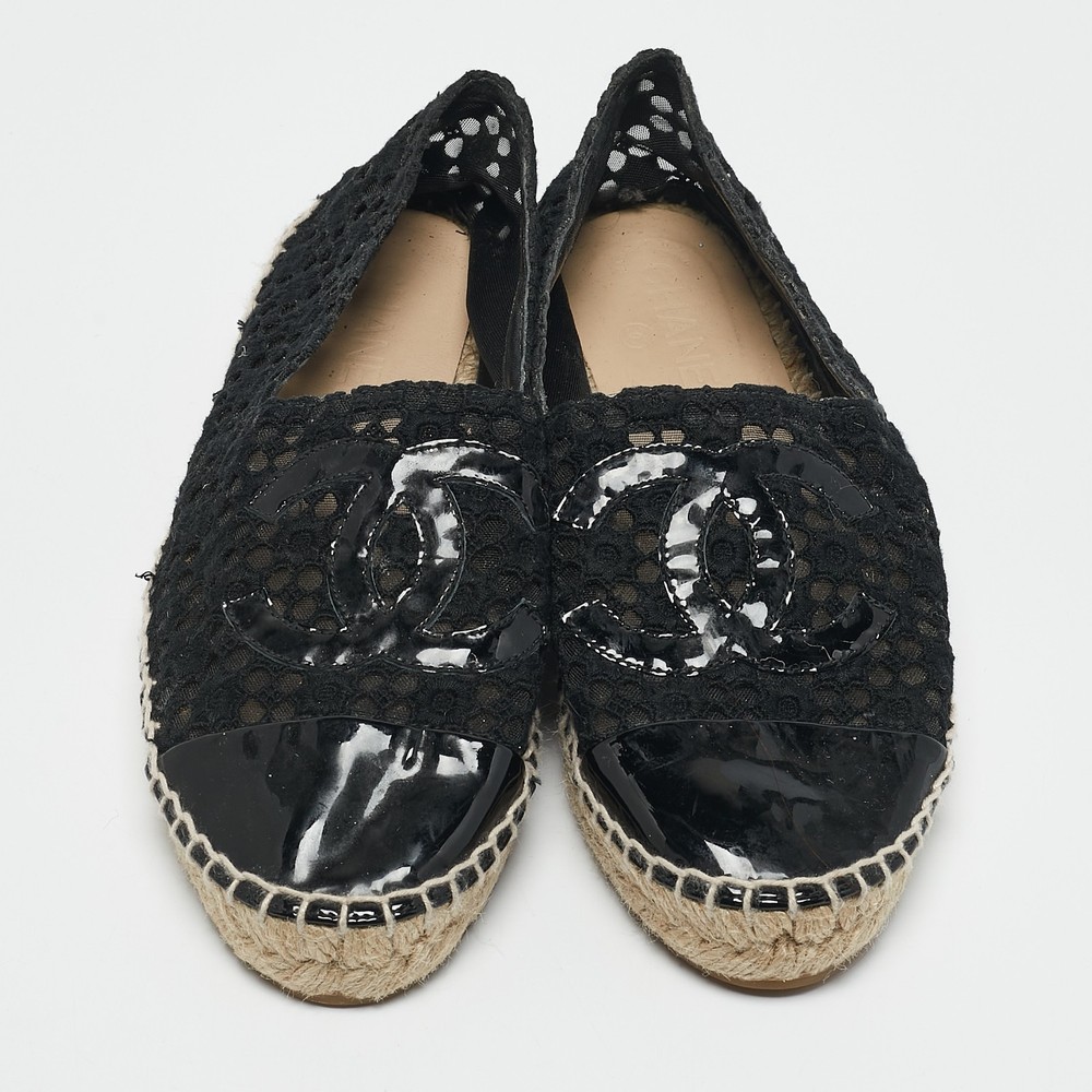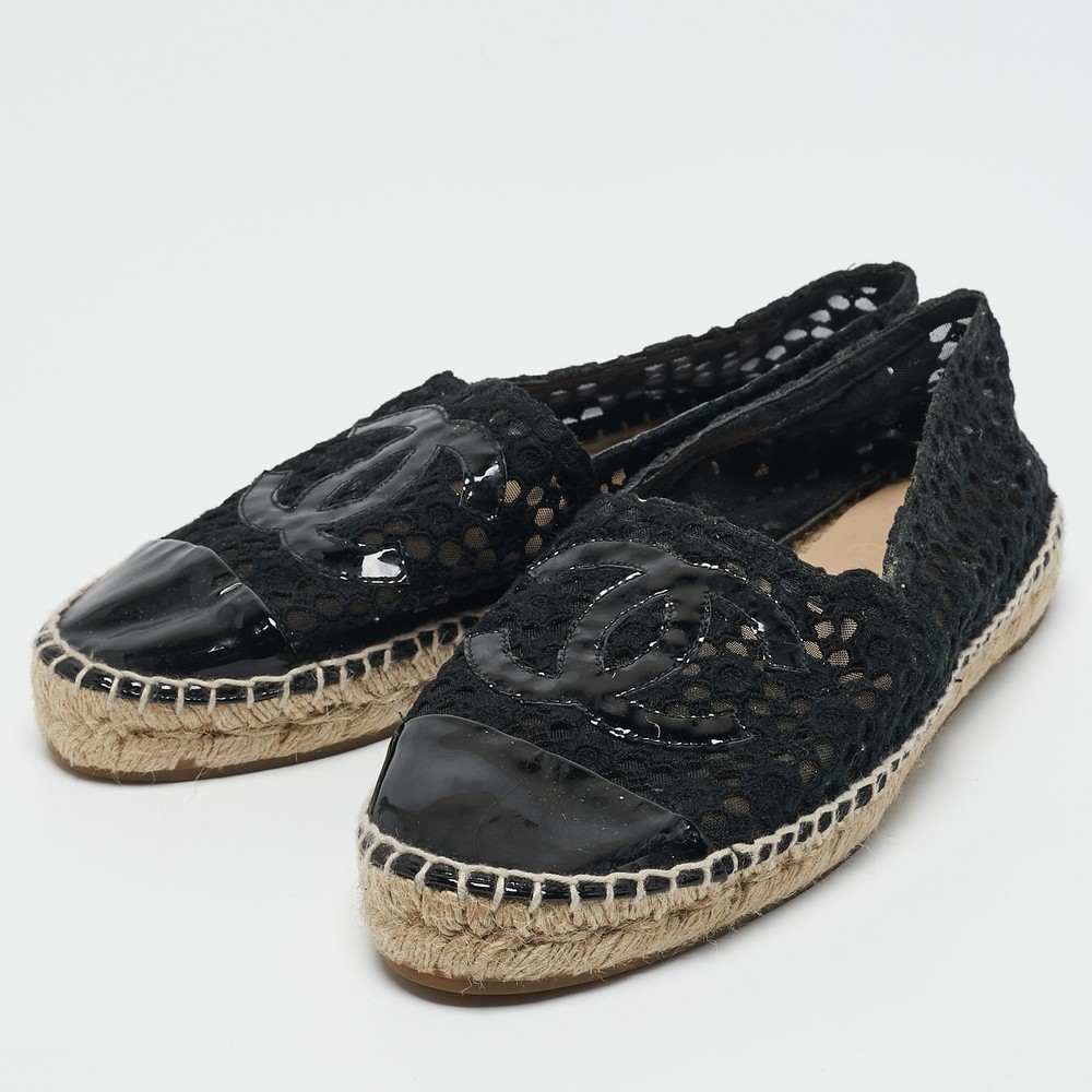 Step into sophistication with these Chanel espadrilles. Crafted from a chic blend of black mesh and glossy patent leather, these flats offer an unparalleled touch of elegance. Their leather lining ensures supreme comfort, while the rubber sole provides effortless all day wear. Hailing from Spain and designed for the fashion forward woman, these slip on shoes are perfect for elevating any ensemble with a subtle yet distinct luxury appeal.Certified by The Luxury Closet - This item has gone through a detailed authentication process overseen by our experts. We offer a lifetime guarantee of authenticity on all our items. Import duties, taxes and charges are not included in the item price. These charges are the buyers responsibility. Please check with your country’s customs office to determine what these additional cost will be prior to buying. Our eBay Store About Us Contact Us Add to Favorite Sellers Chanel Black Mesh and Patent Leather CC Espadrille Flats Size 38 $201.3 Step into sophistication with these Chanel espadrilles. Crafted from a chic blend of black mesh and glossy patent leather, these flats offer an unparalleled touch of elegance. Their leather lining ensures supreme comfort, while the rubber sole provides effortless all day wear. Hailing from Spain and designed for the fashion forward woman, these slip on shoes are perfect for elevating any ensemble with a subtle yet distinct luxury appeal. Product Details Brand Color Black Dimensions Material Mesh, Patent Leather Size 38 Outsole Width 8 cm Outsole Length 25.5 cm Heel Height Includes The Luxury Closet Packaging Certified by The Luxury Closet This item has gone through a detailed authentication process overseen by our experts. We offer a lifetime guarantee of authenticity on all our items. How We Check The in-house team of experts at The Luxury Closet is highly trained to verify the authenticity and the condition of the luxury products. They ensure that only 100% authentic items are put on sale.The evaluation process is unique with its own mix of assessment criteria and differs according to the category. Each item is evaluated based on the following combination of hallmarks, hardware, stitching, symmetry, material, craftsmanship, stamping, codes, hologram stickers, and packaging. Our authenticators also check if the items have been modified or amended (e.g., aftermarket diamonds, replaced batteries, repaired bags, etc.) International Buyers Import duties, taxes and charges are not included in the item price. These charges are the buyers responsibility. Please check with your country’s customs office to determine what these additional cost will be prior to buying.